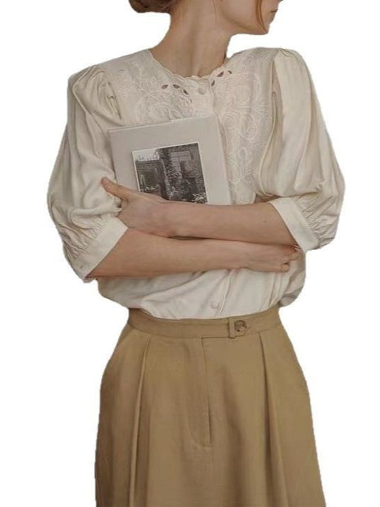 胸元のレース使いが大人可愛い七分袖のブラウス。