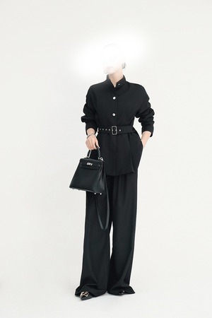 大人かっこいいペプラムトップス+ワイドパンツのセットアップドレス。