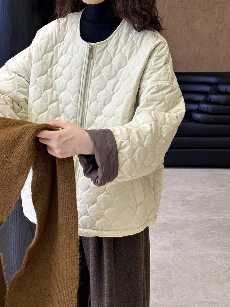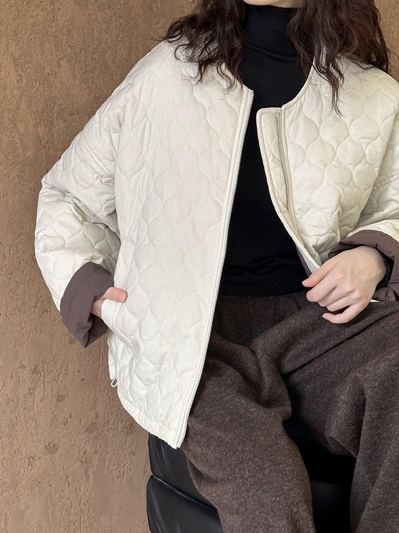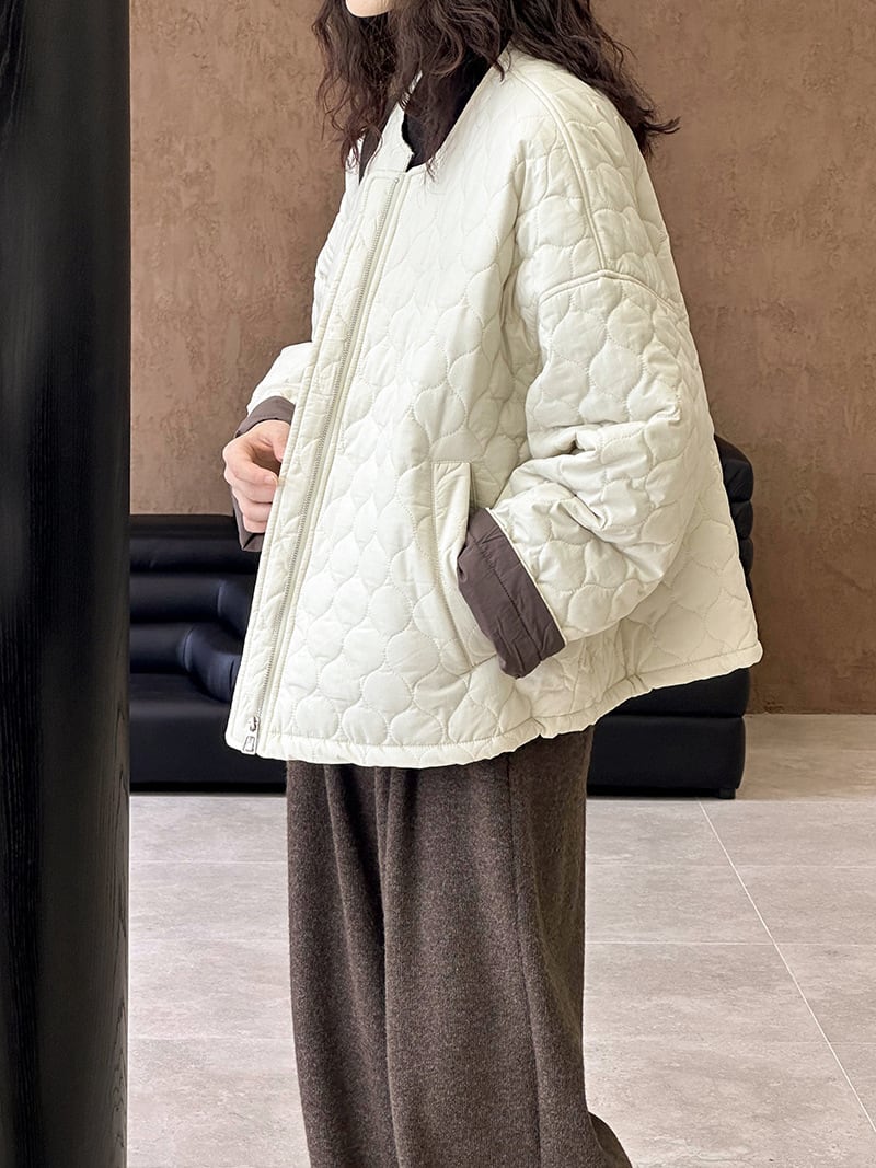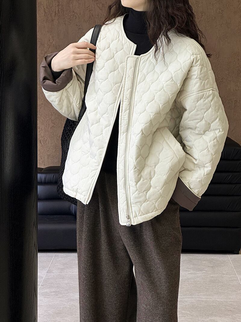 大人可愛いノーカラーのバイカラーキルティングジャケット。