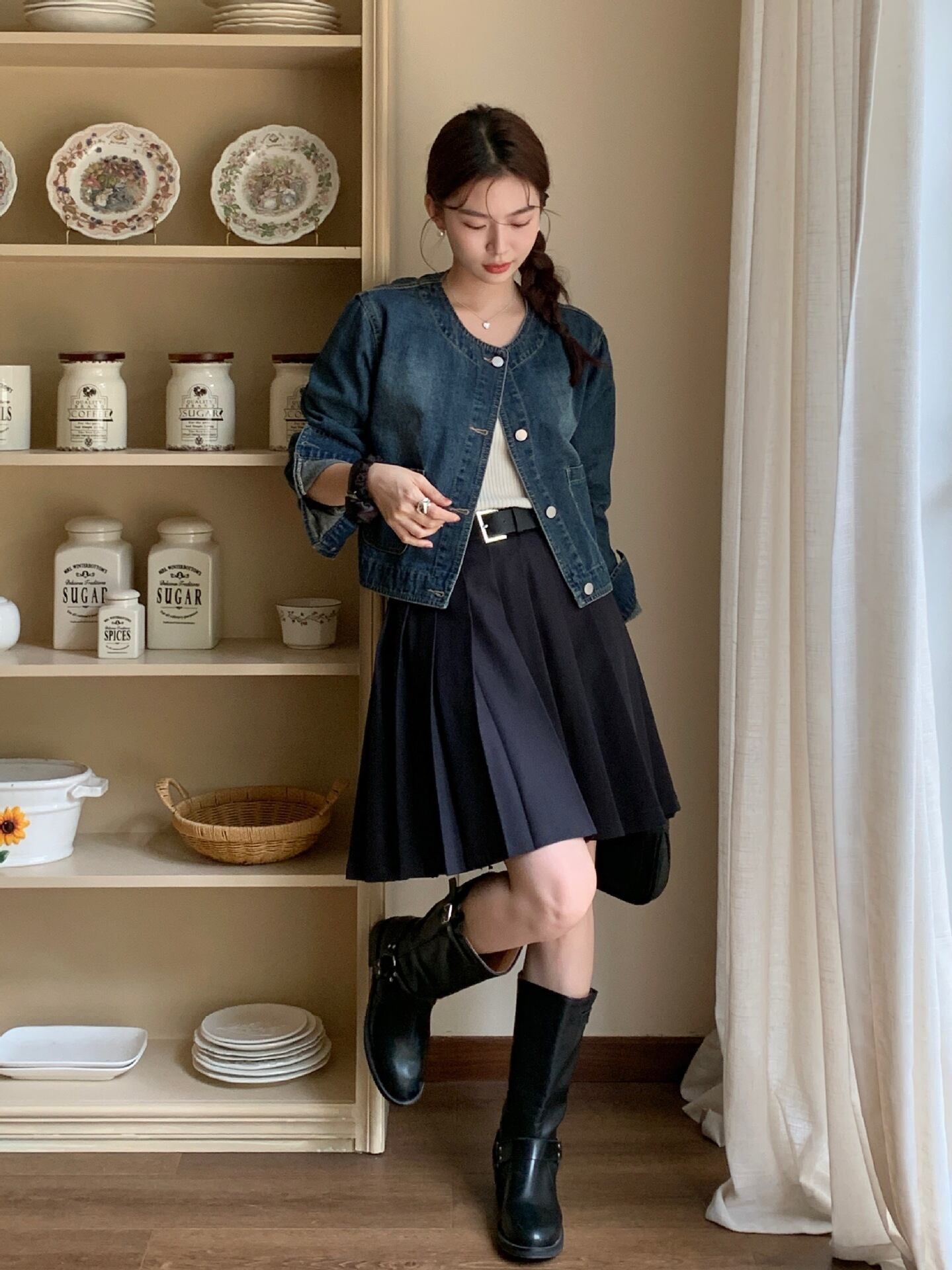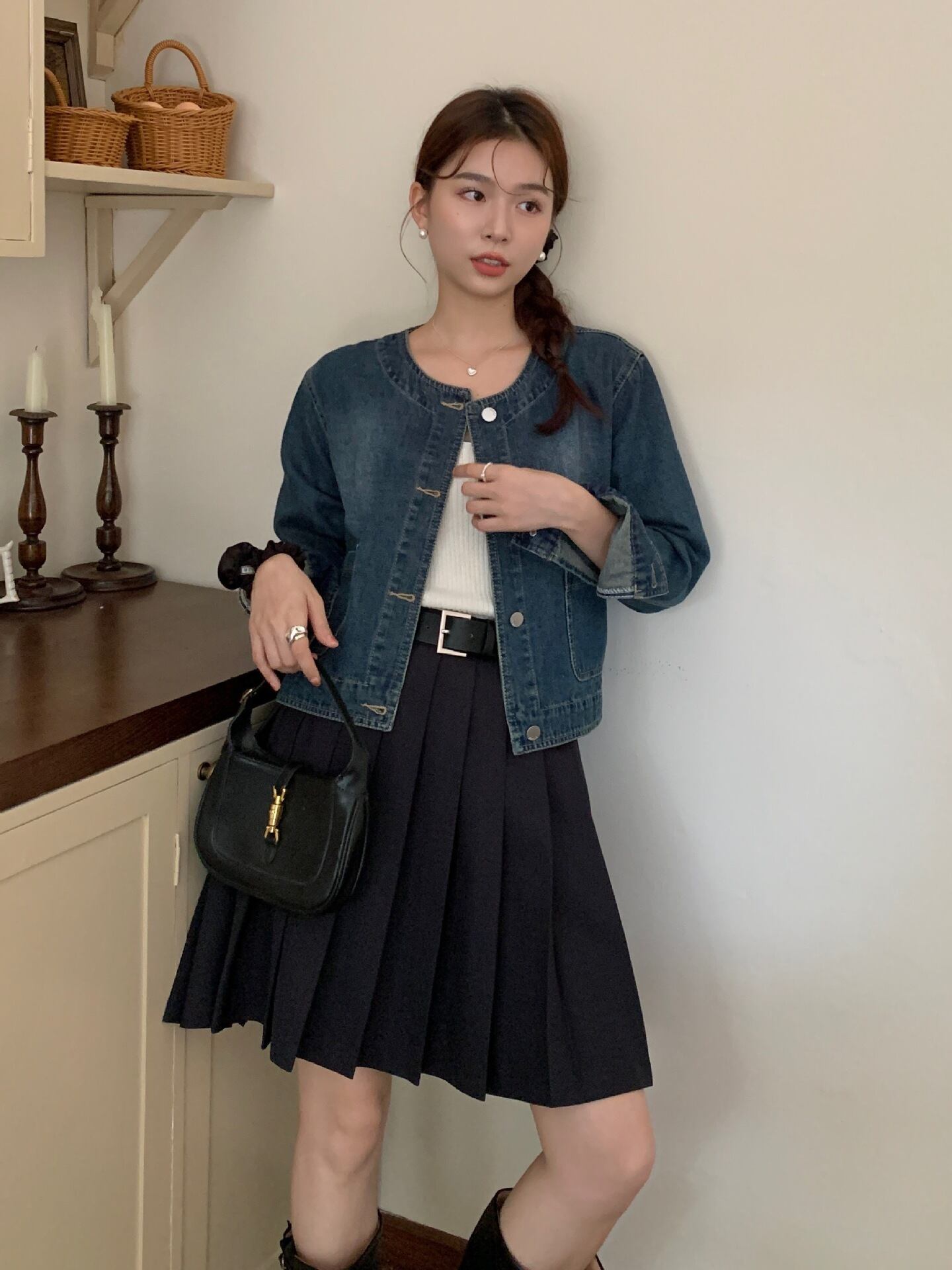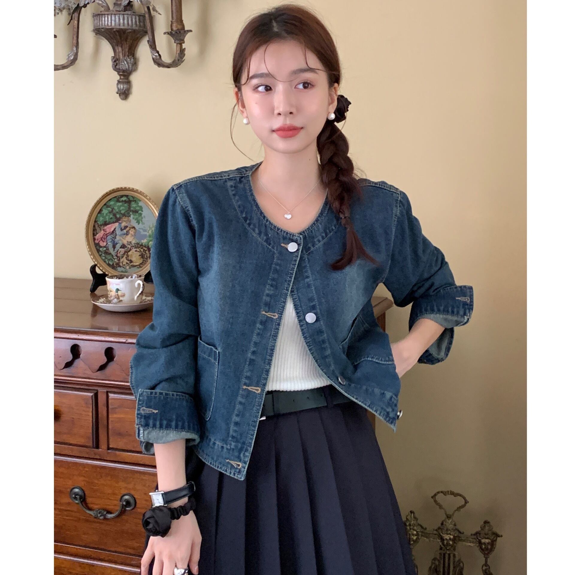大人可愛いノーカラーのショート丈デニムジャケット。