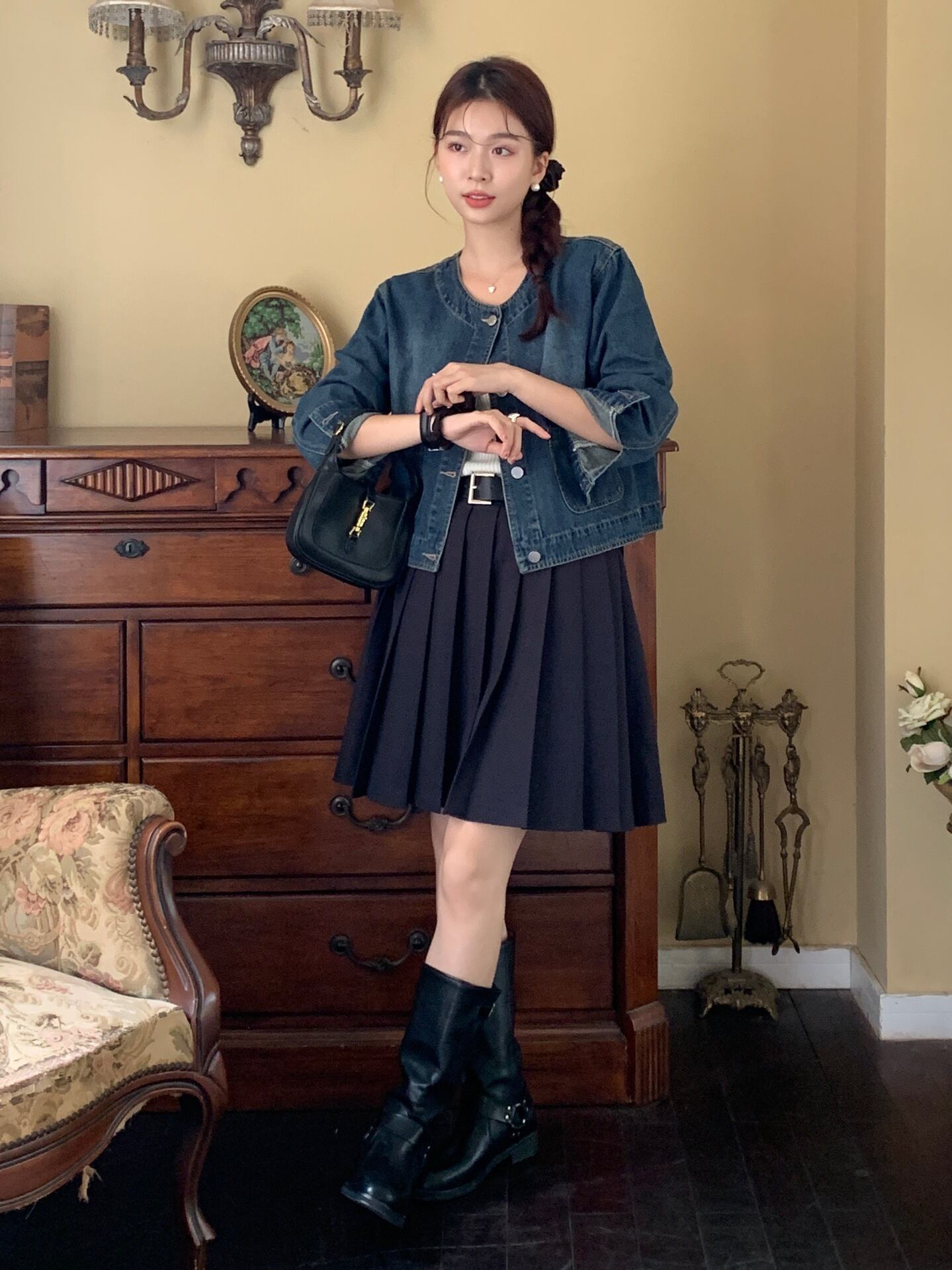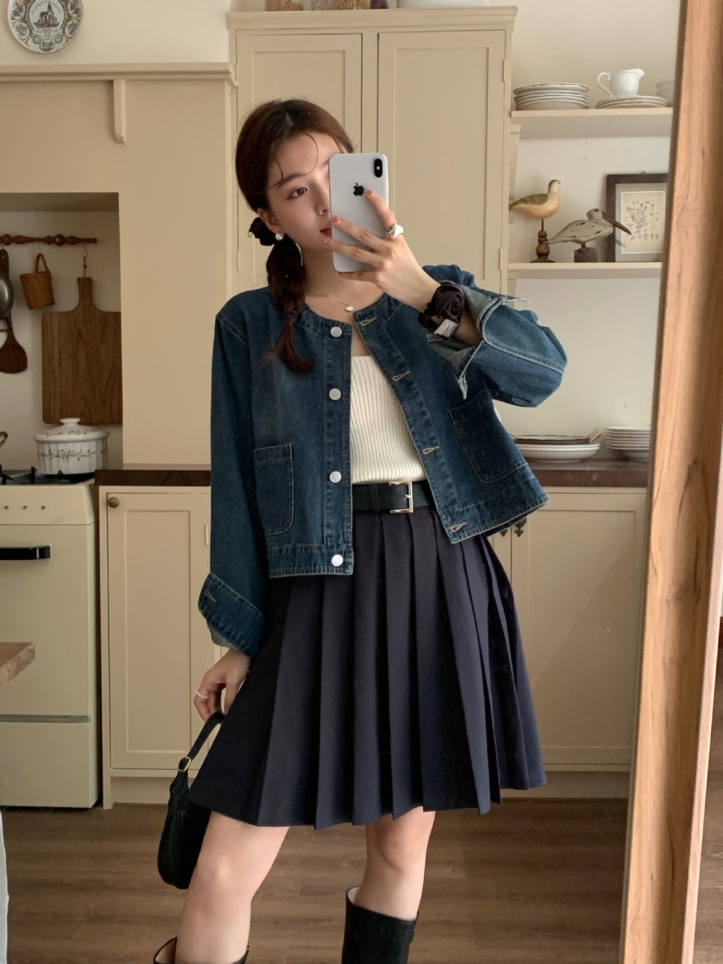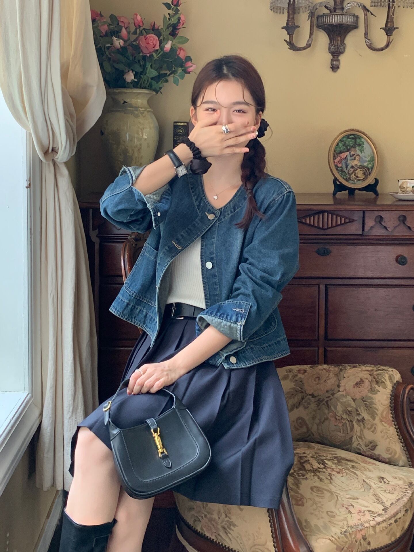 大人可愛いノーカラーのショート丈デニムジャケット。