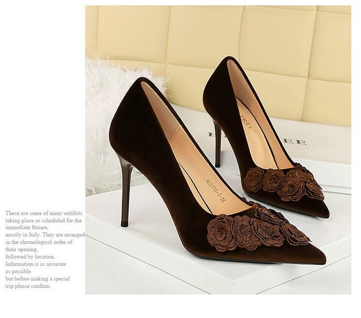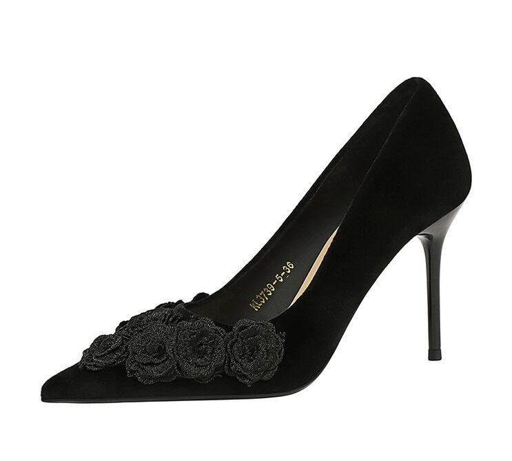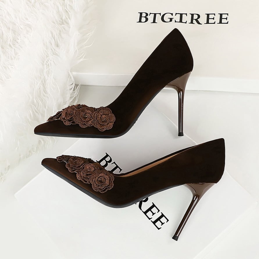 シックな立体のお花モチーフが印象的なポインテッドトゥのパンプス。