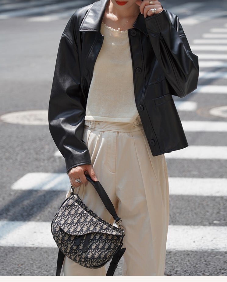 きれいめに着こなせる大人可愛いフェイクレザージャケット。