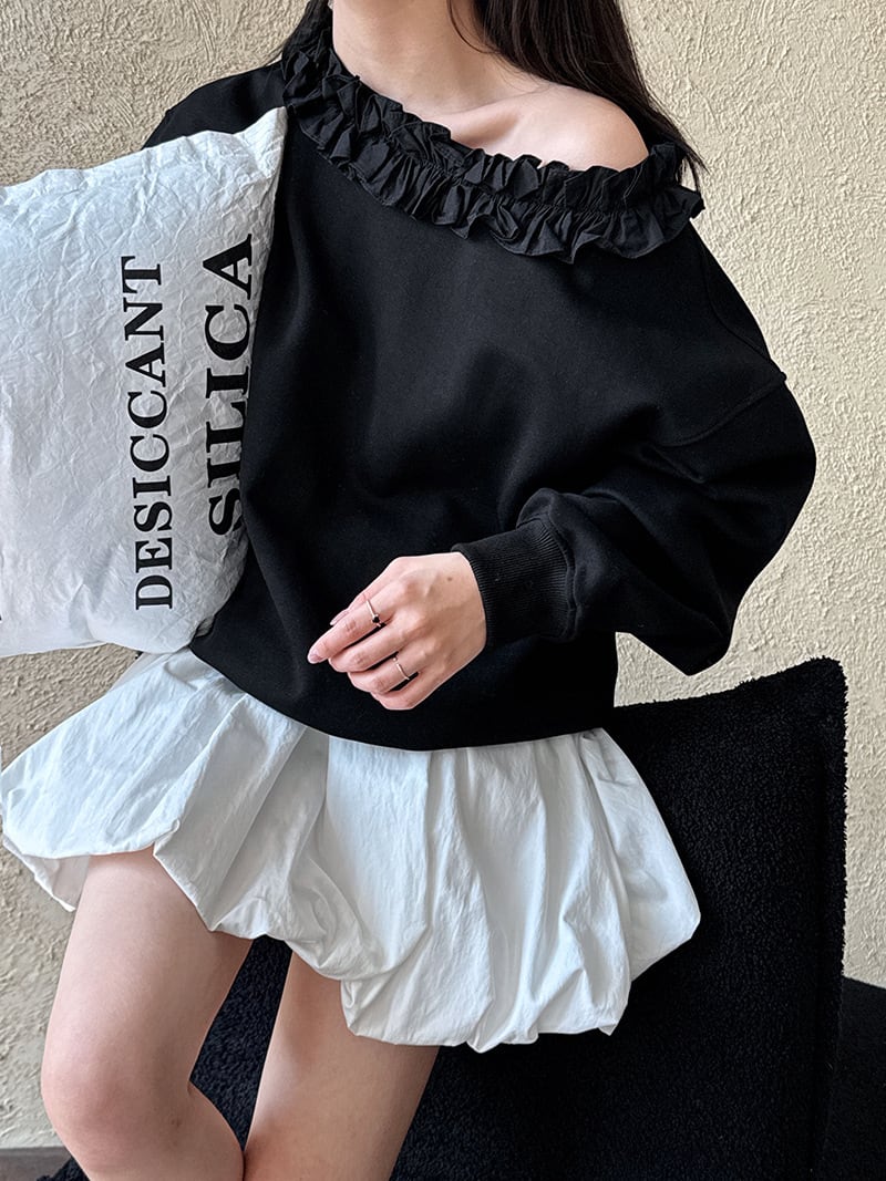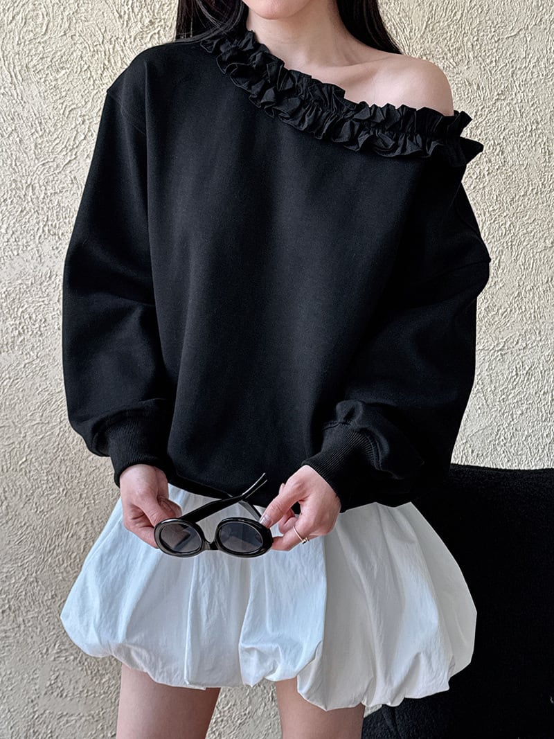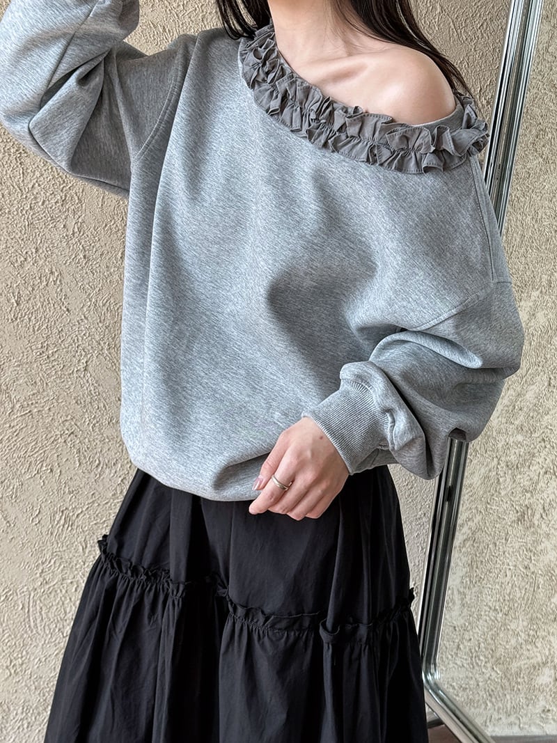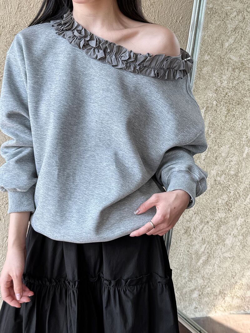 肩口のフリルが大人可愛いスウェットトレーナー。