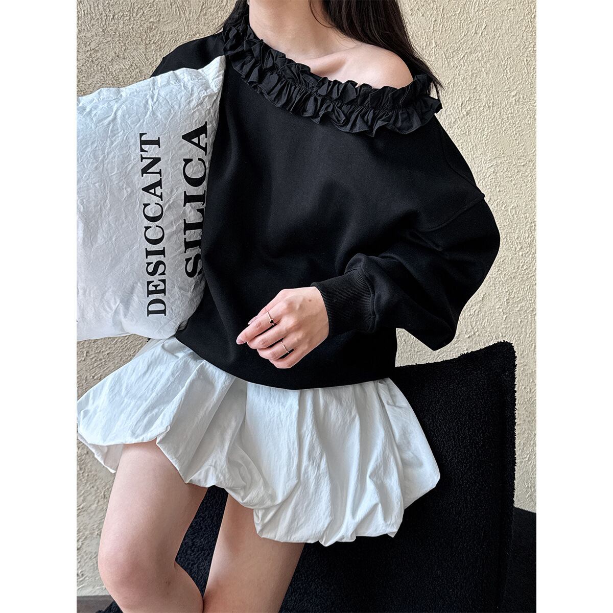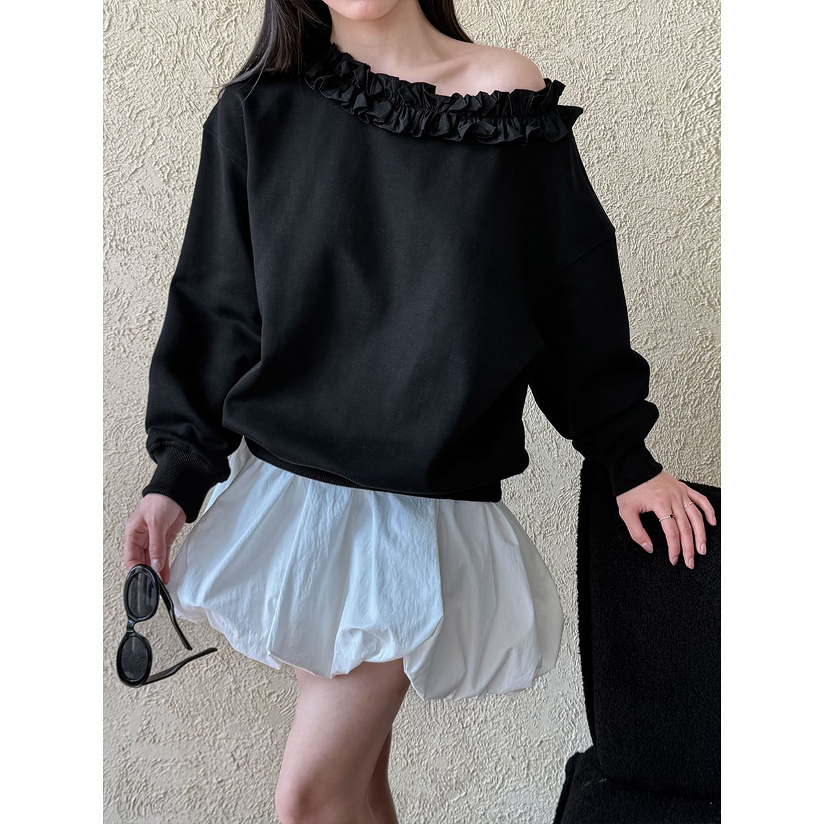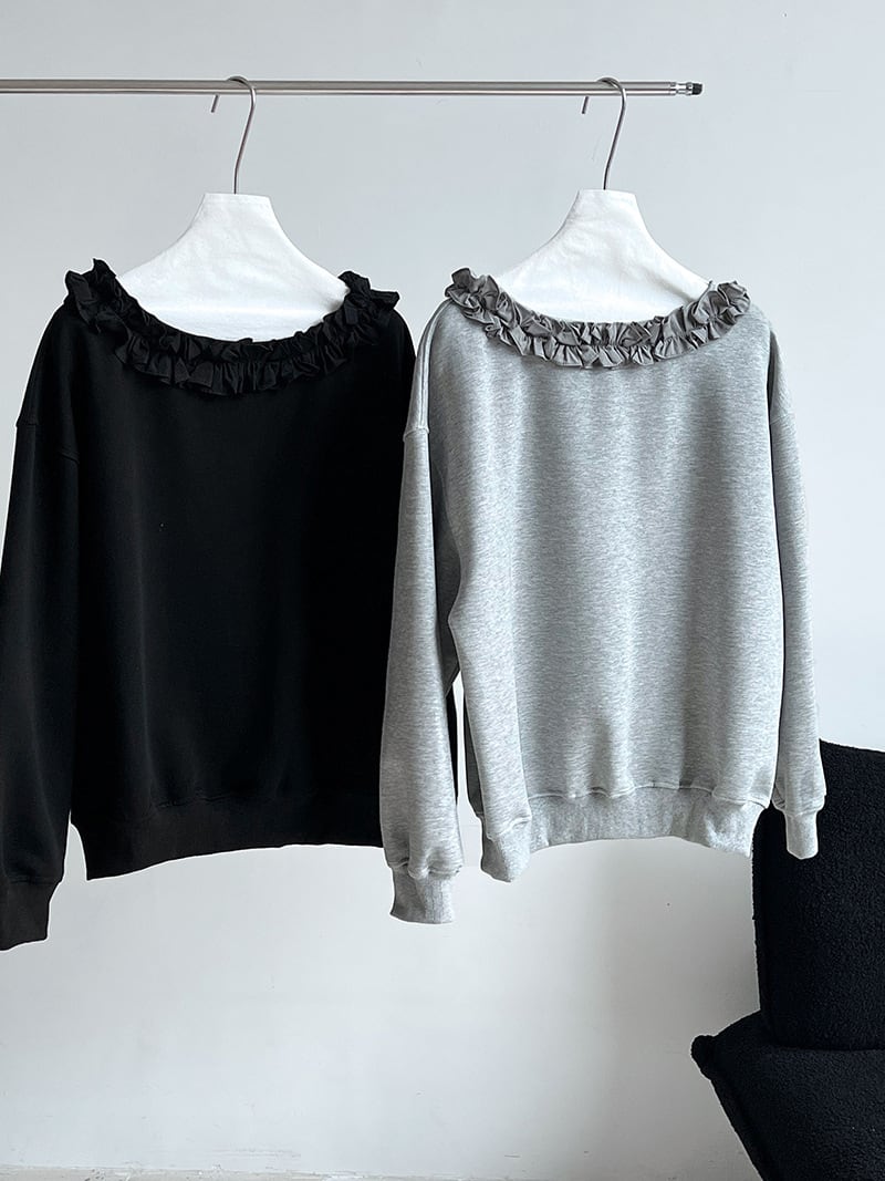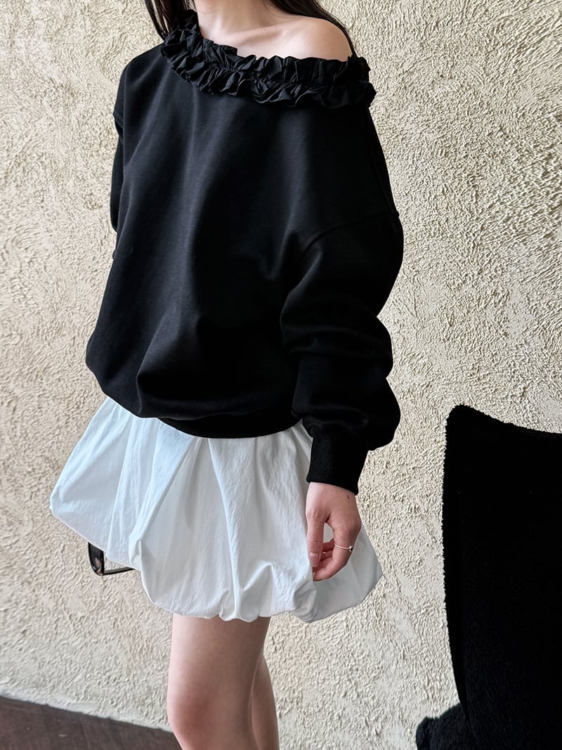 肩口のフリルが大人可愛いスウェットトレーナー。
