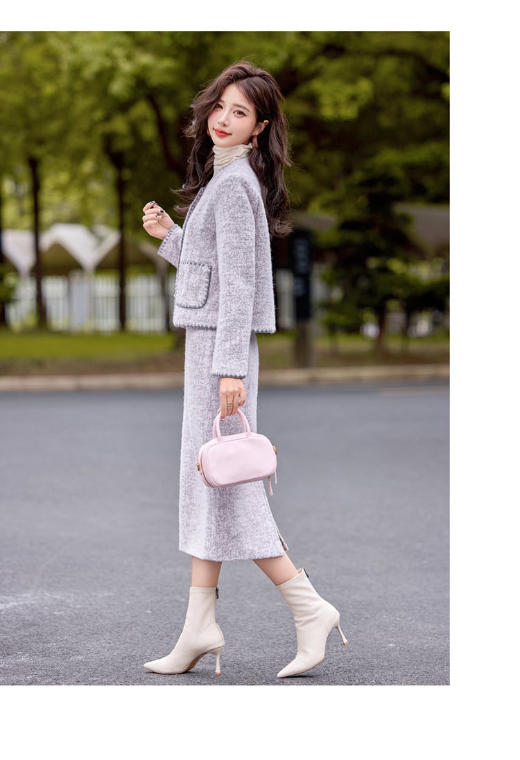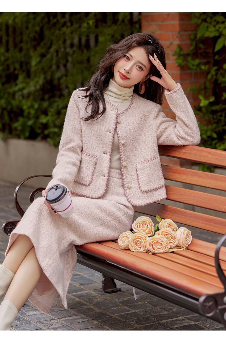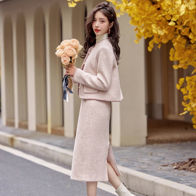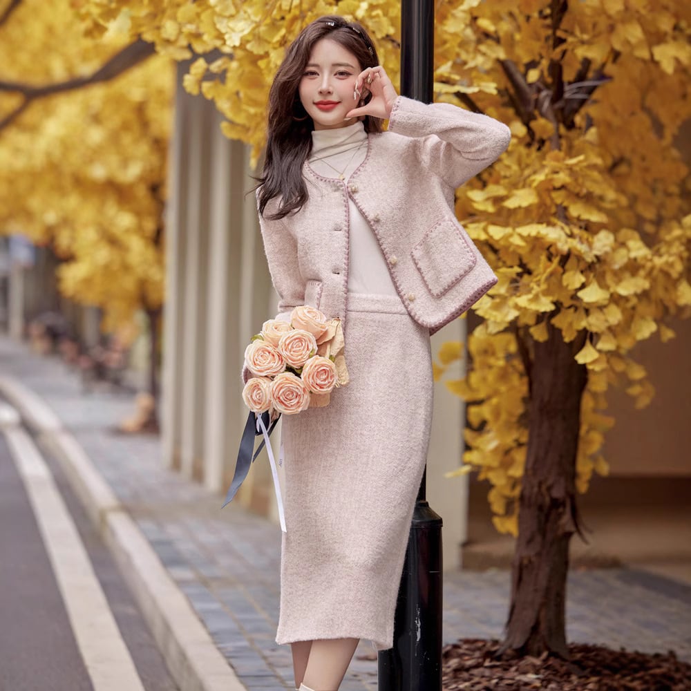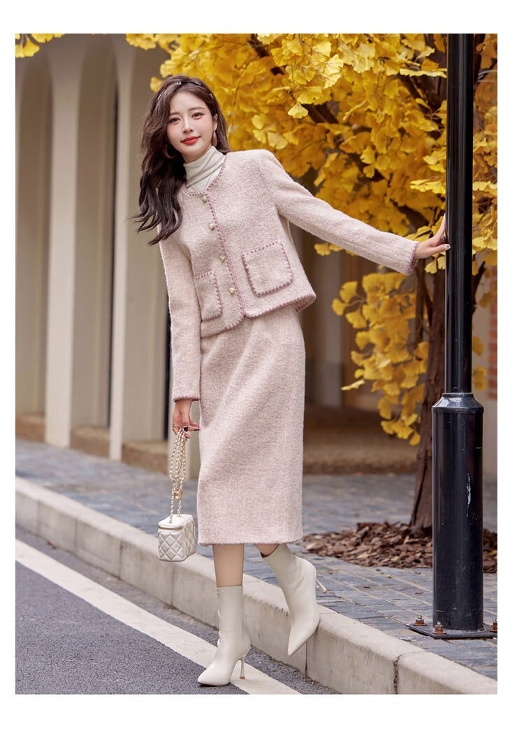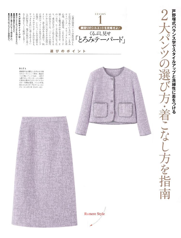 大人エレガントなツイードジャケット+スカートのセットアップ。