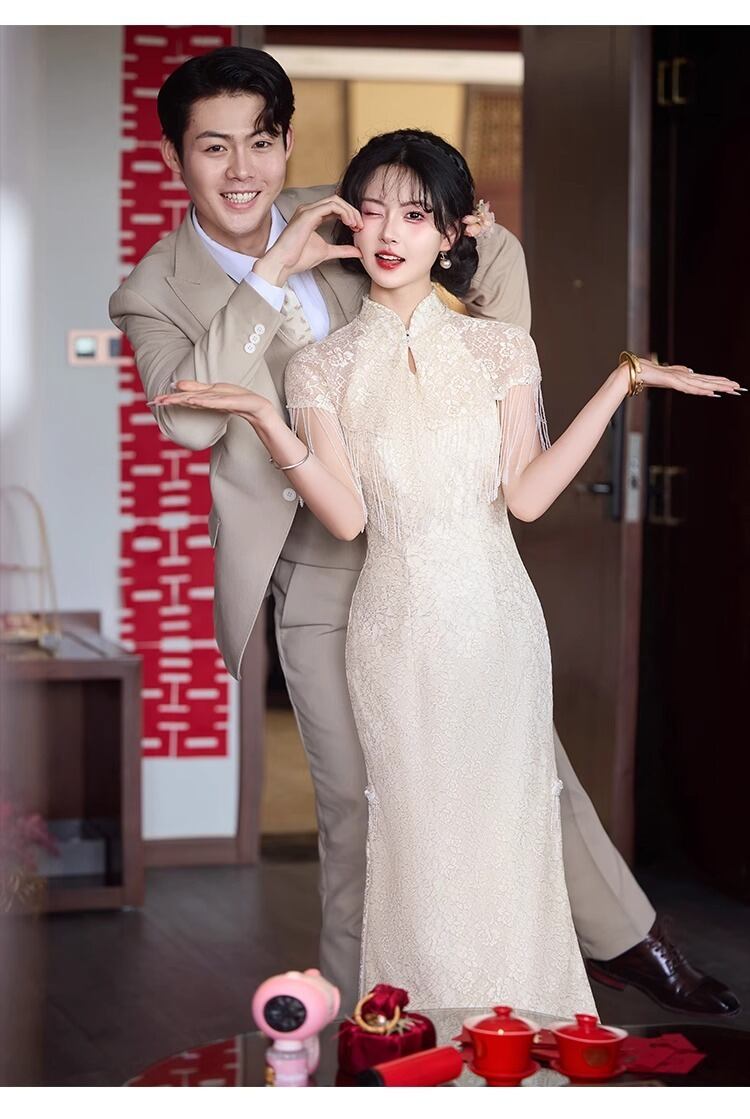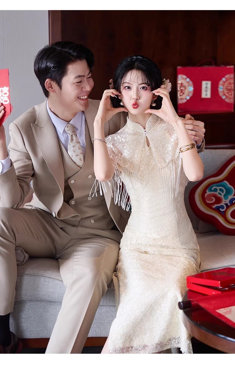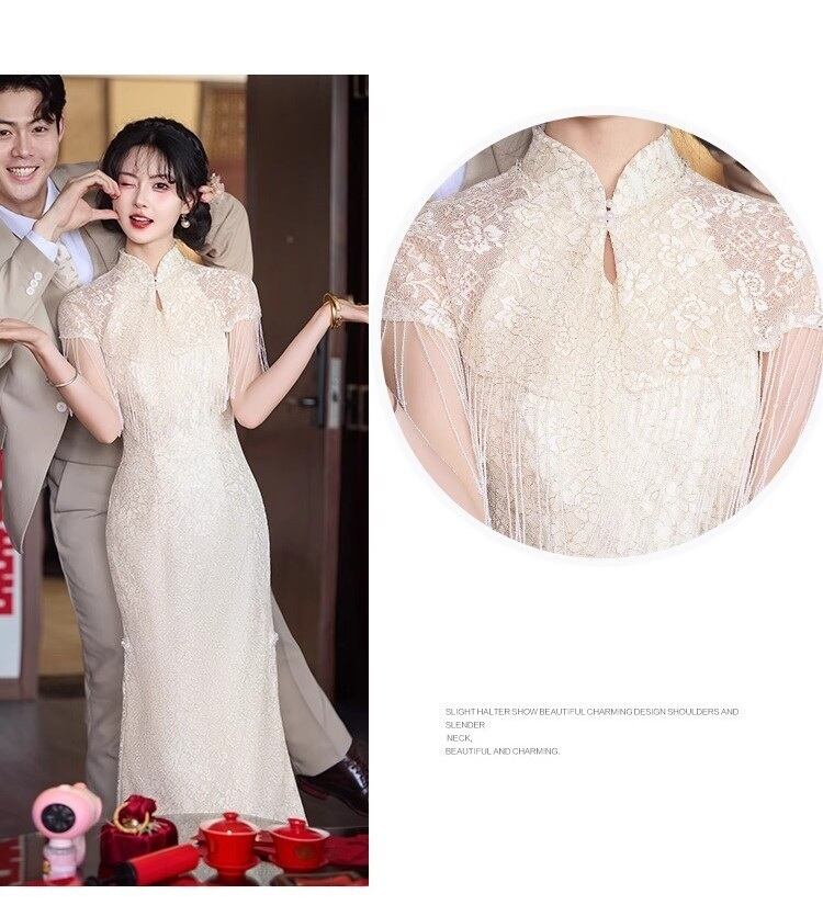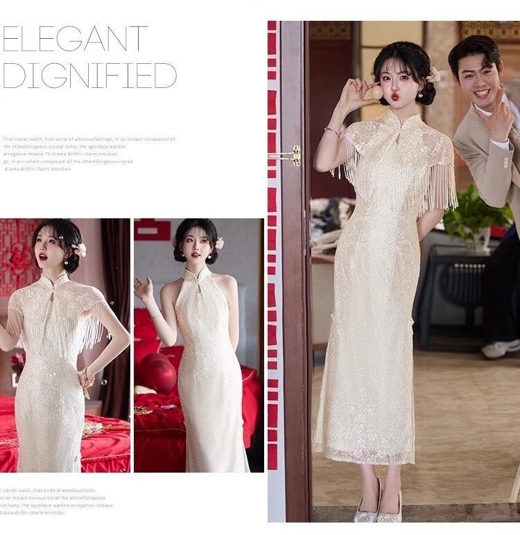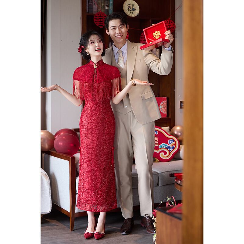 大人可愛いチャイナ風のマーメイドラインのカラードレス。