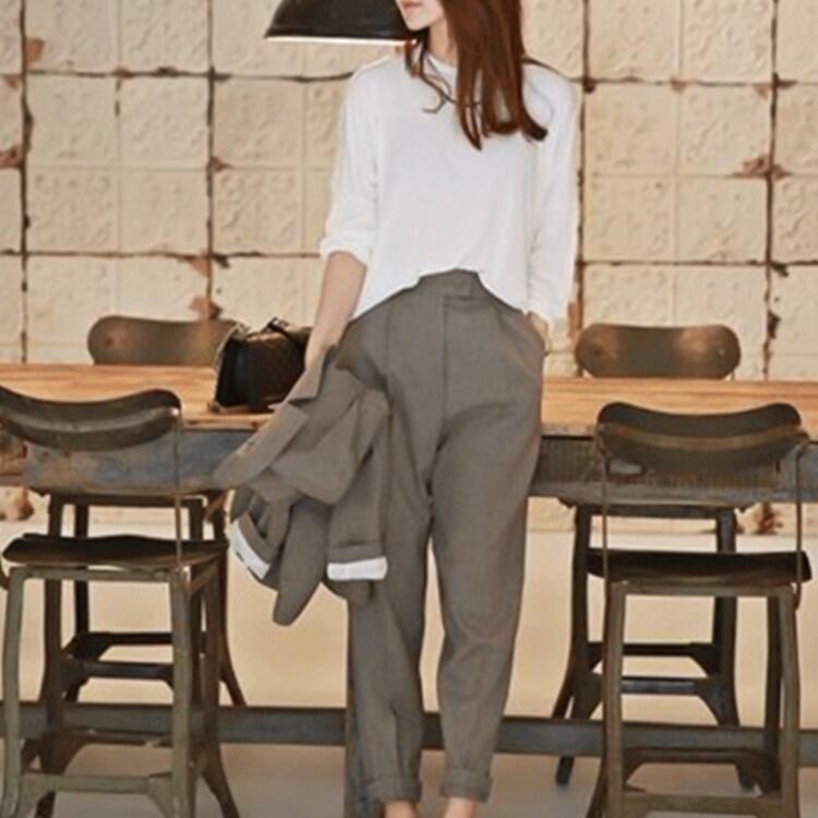 カジュアルなテーラードジャケット+テーパードパンツのセットアップ。