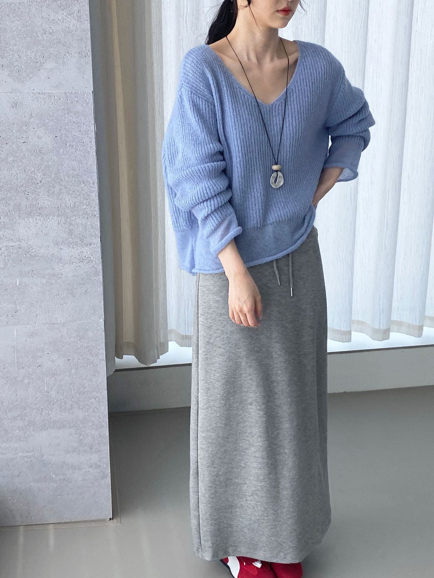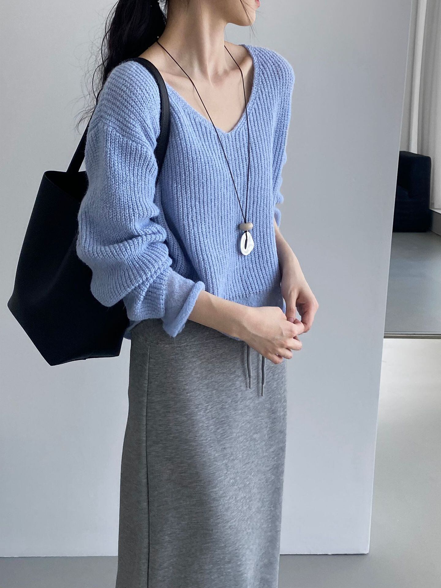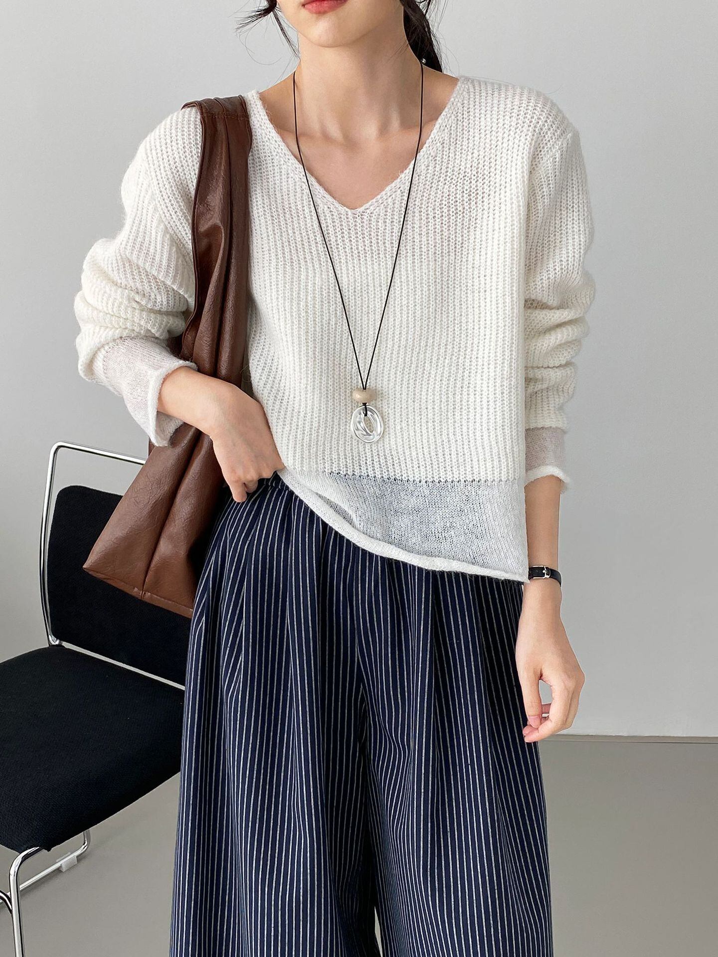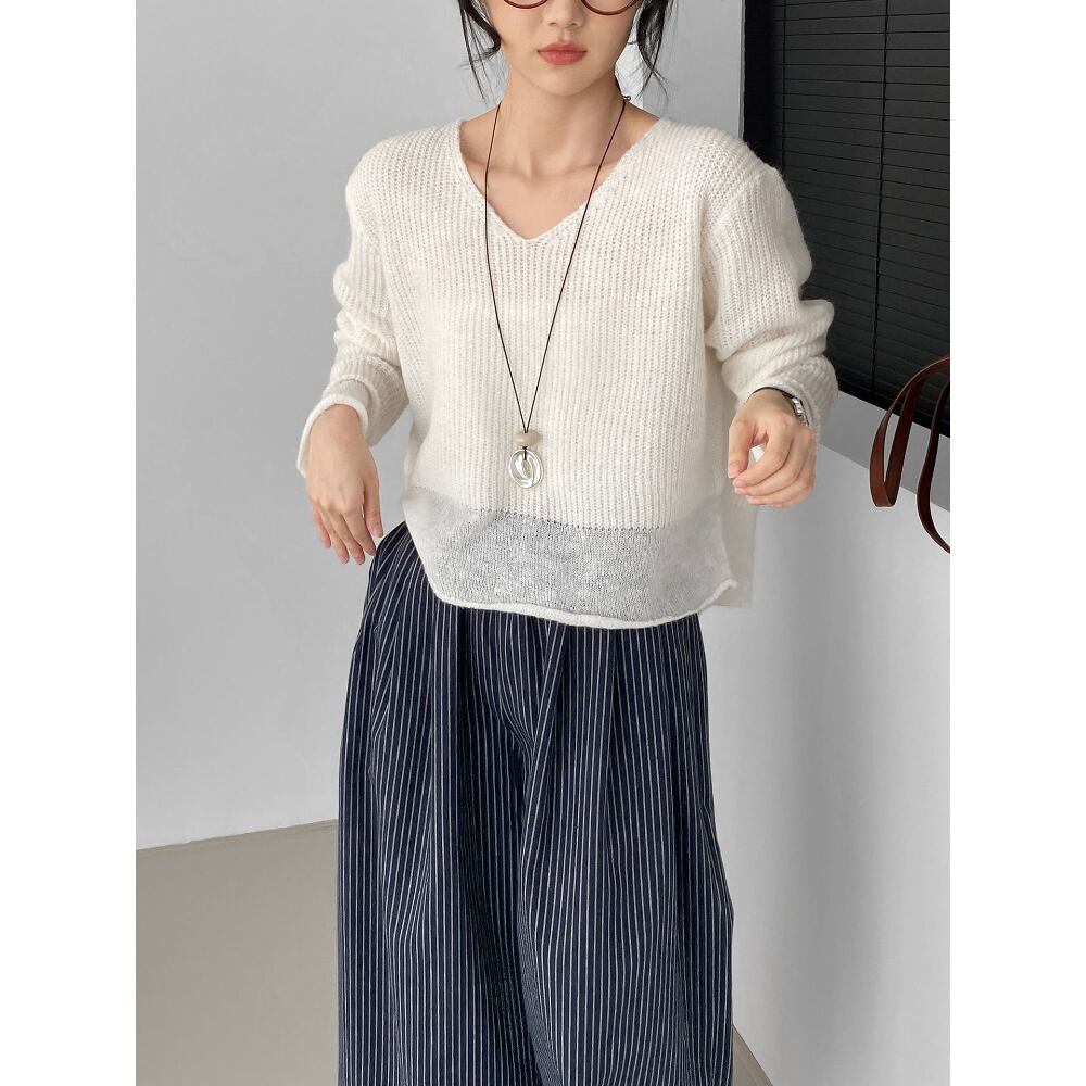 大人可愛いショート丈のvネックニットセーター。
