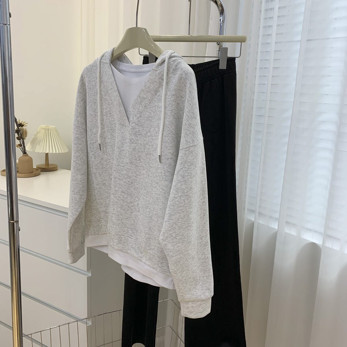 大人可愛いラテカラーのフェイクレイヤードvネックパーカー。