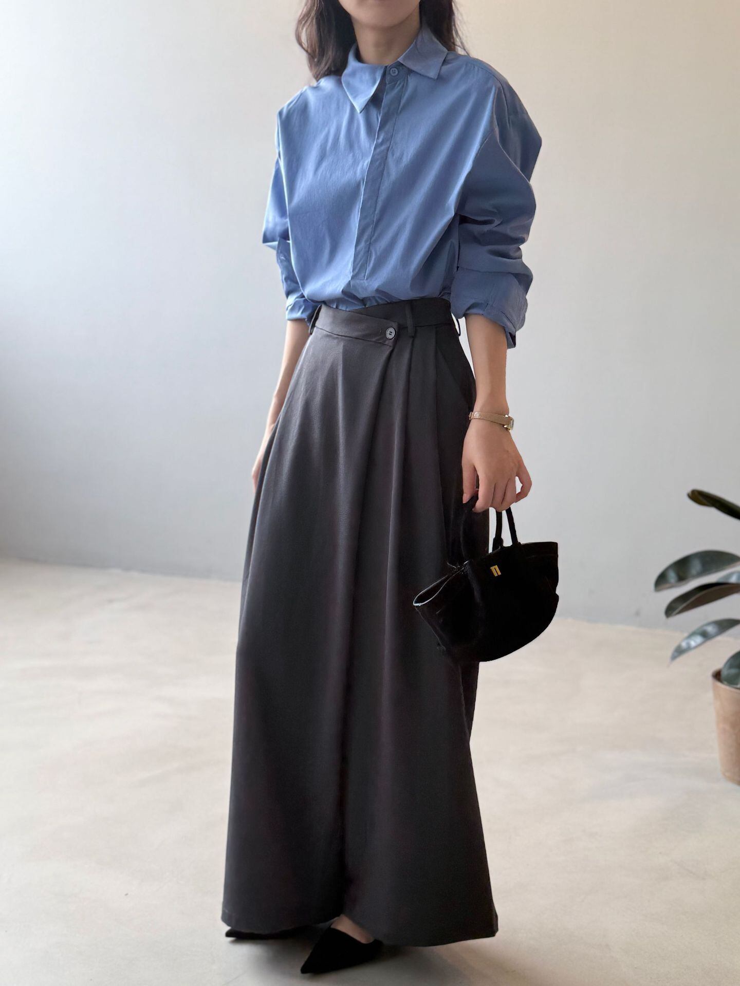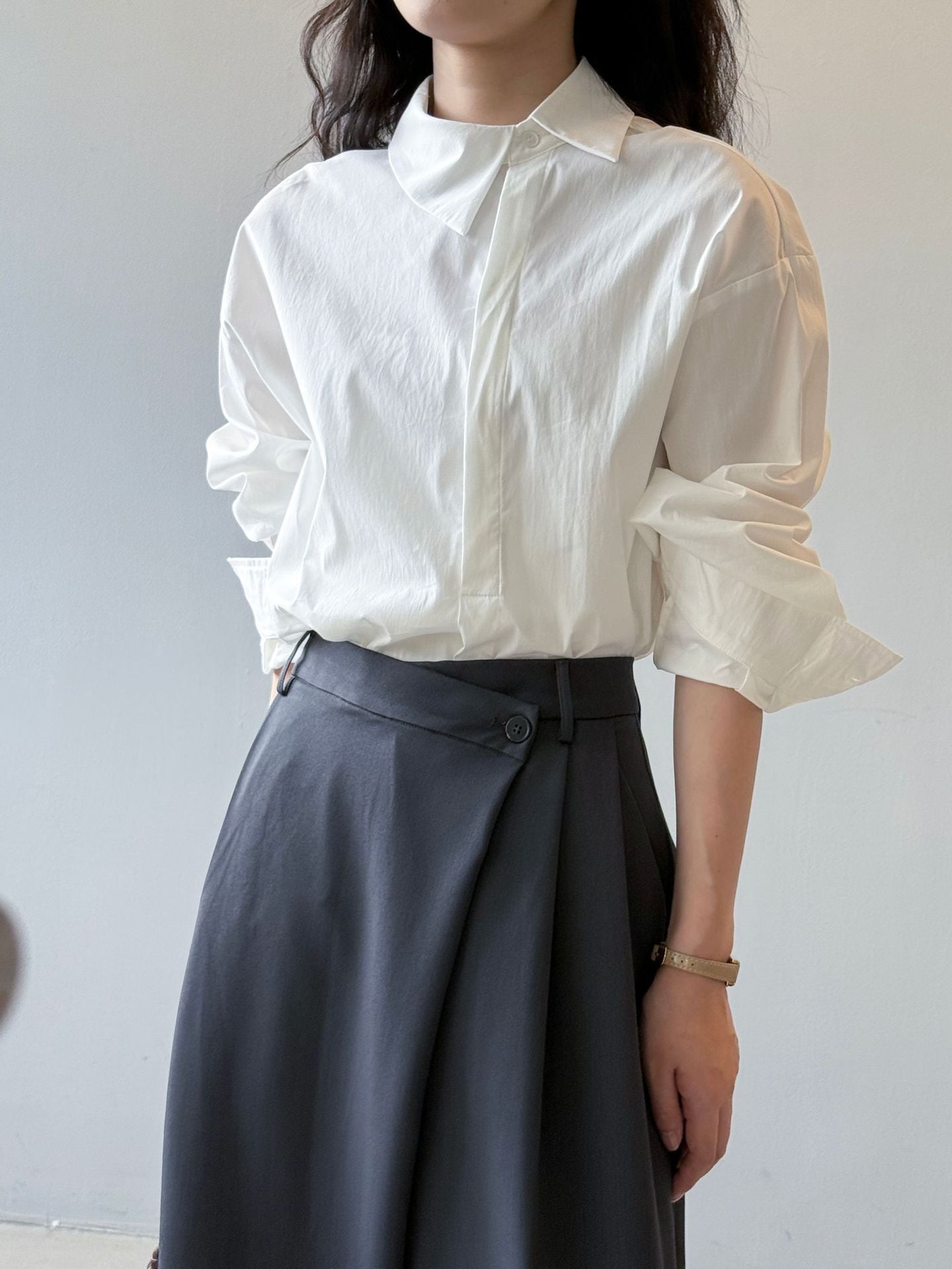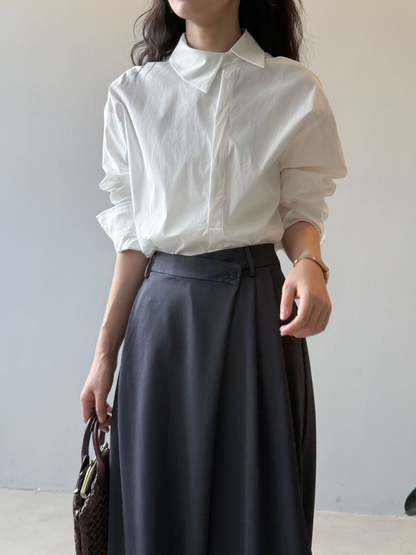 アシンメトリーな襟が大人可愛いシンプルなシャツ。