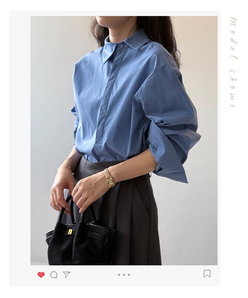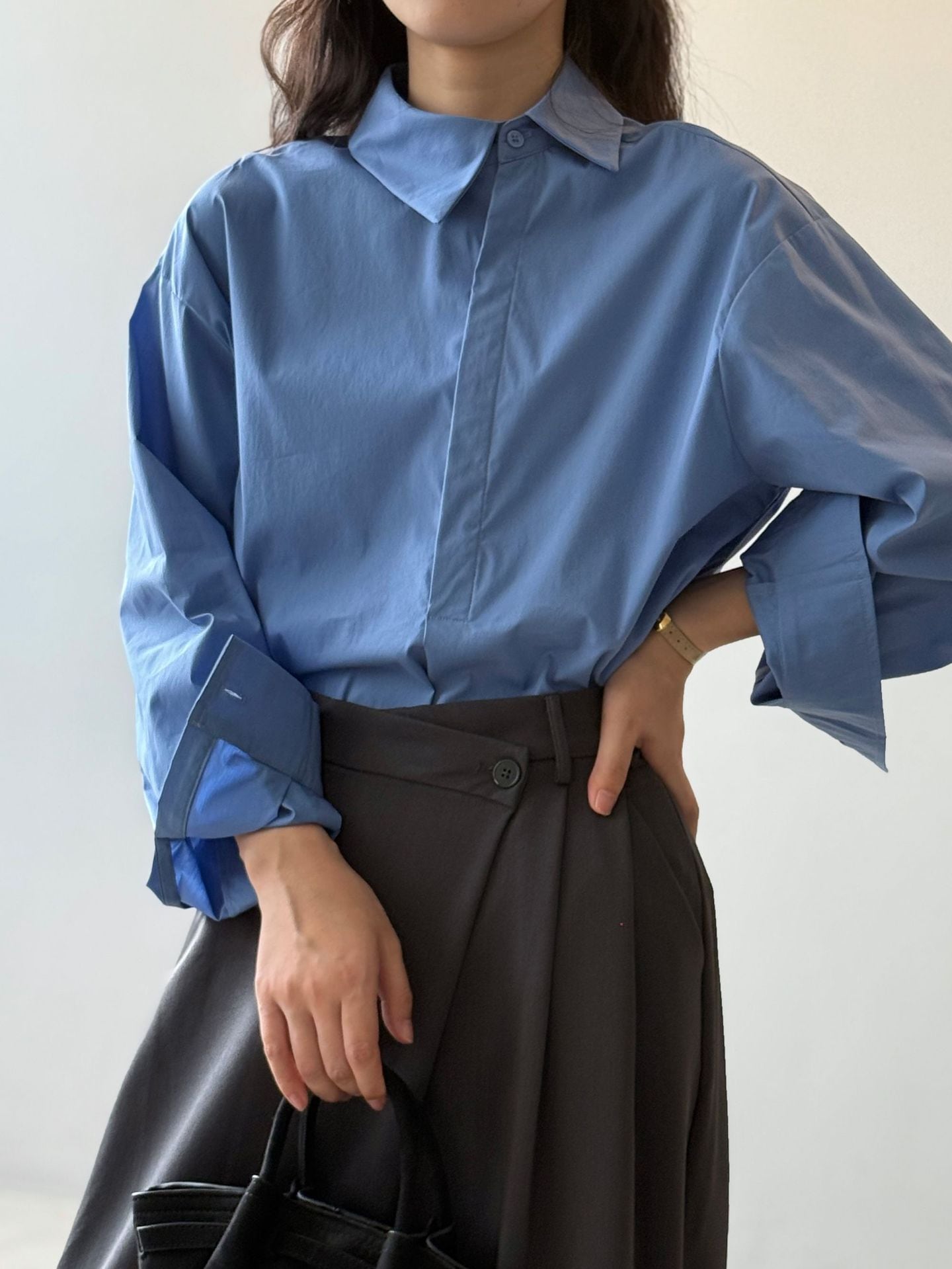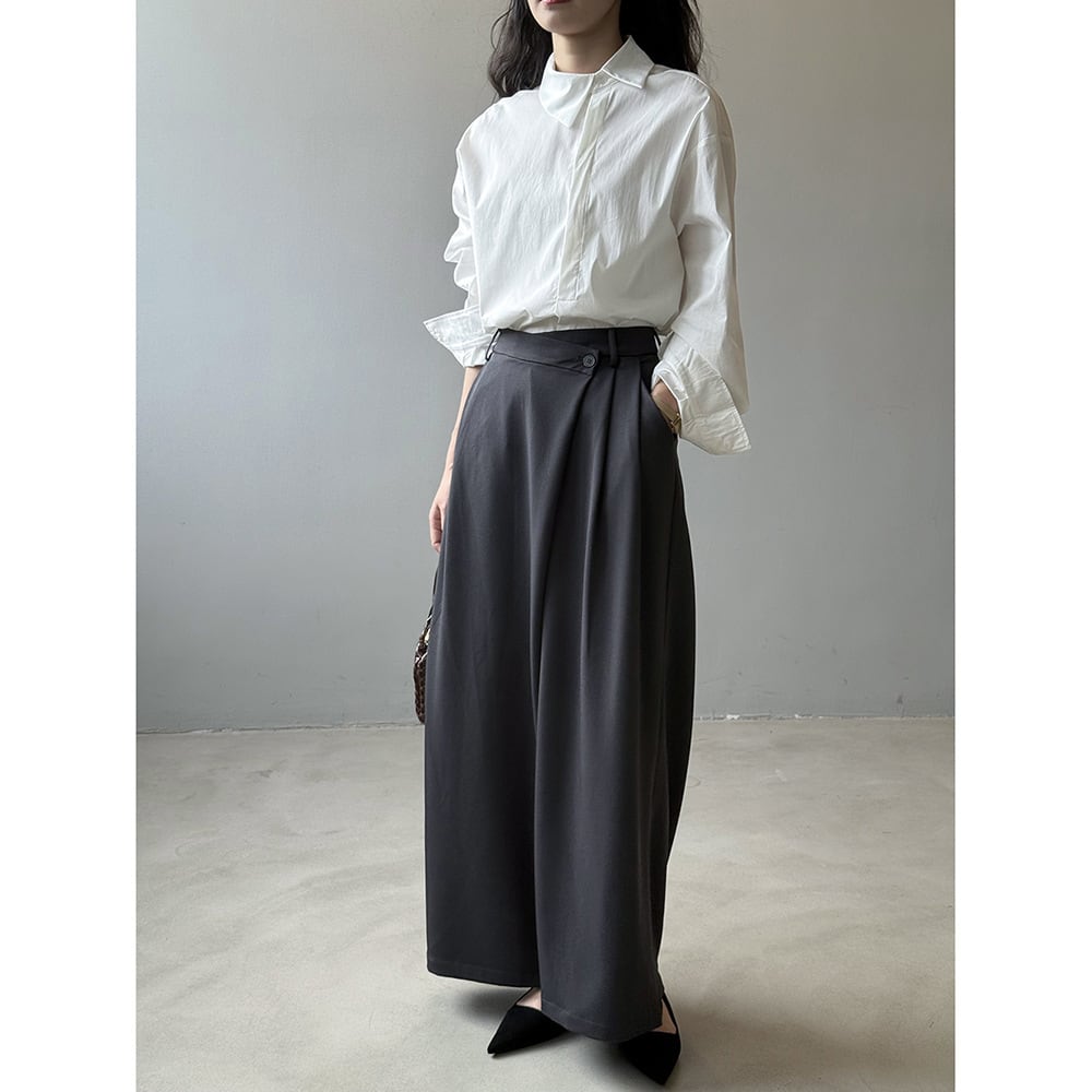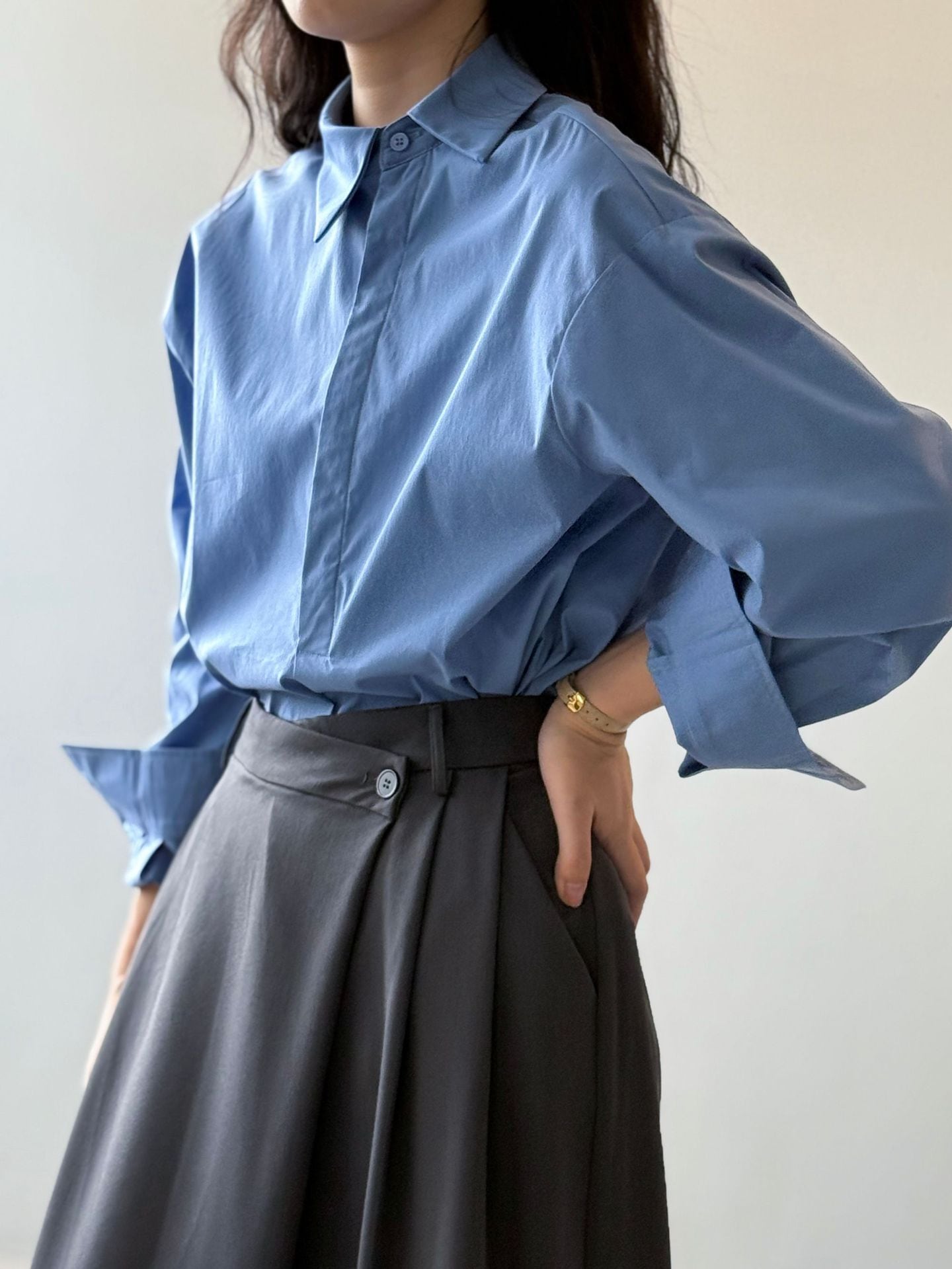 アシンメトリーな襟が大人可愛いシンプルなシャツ。