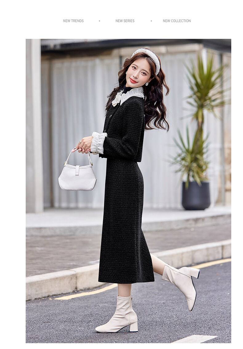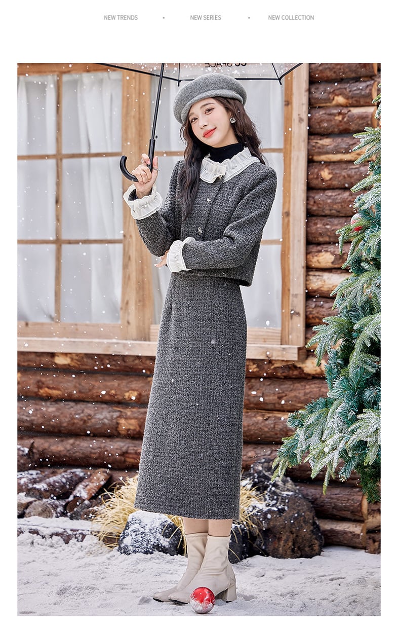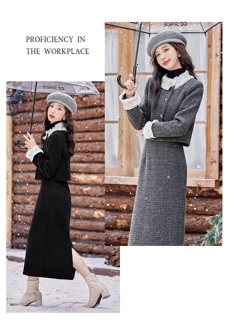 大人エレガントなツイードジャケット+タイトスカートのセットアップ。