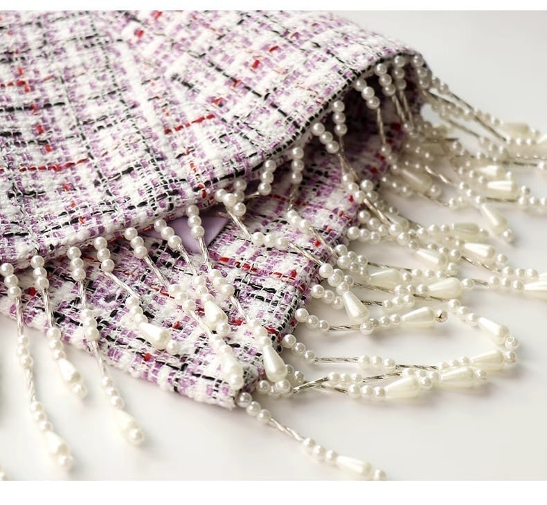 ウエストのクロスデザインとフリンジパールがフェミニンできれいめな印象に。