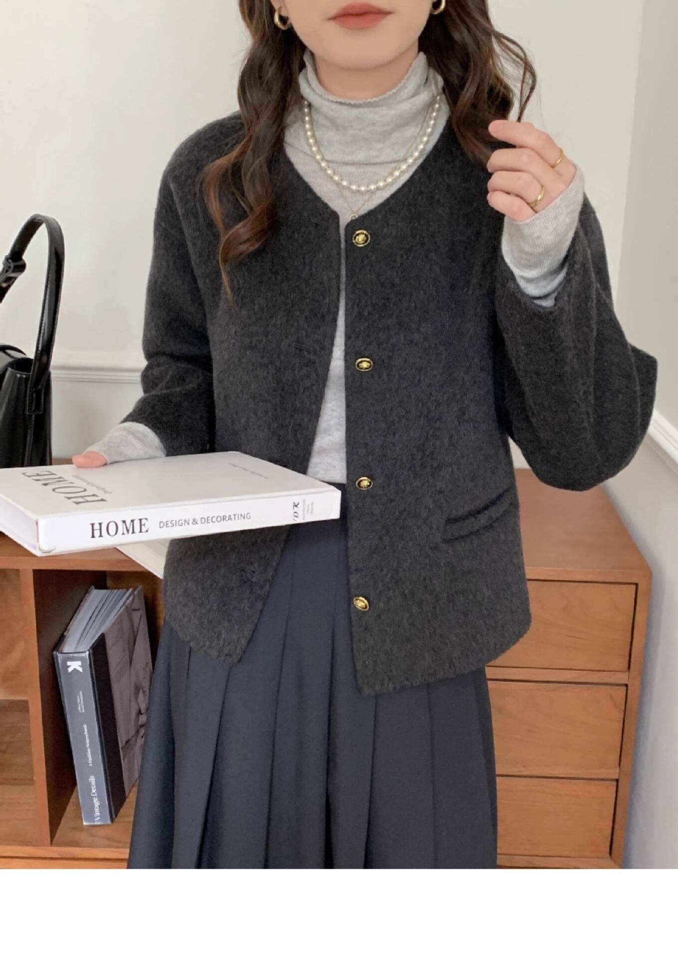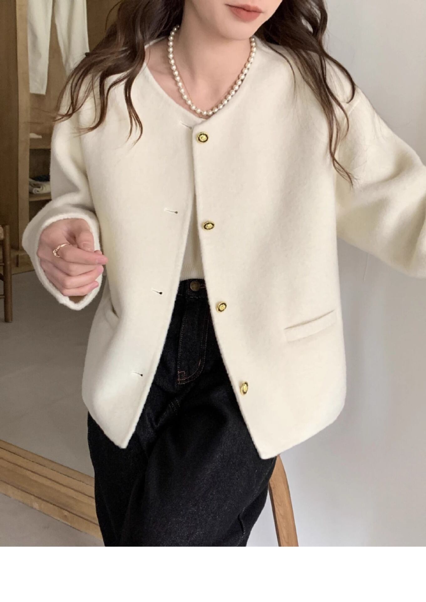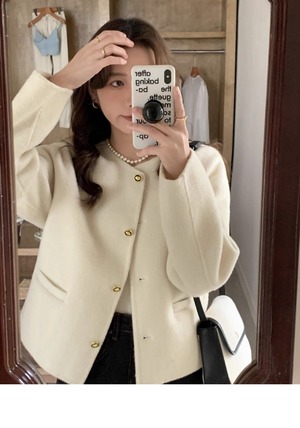 大人可愛いコンパクトなノーカラーのジャケットコート。