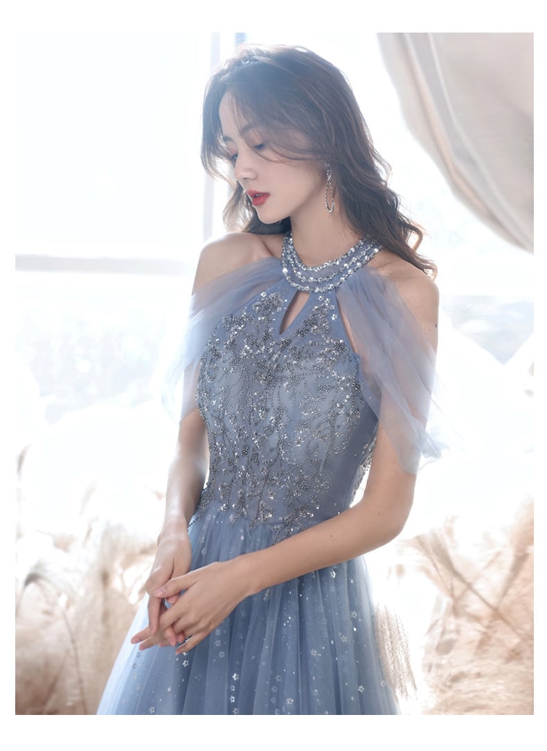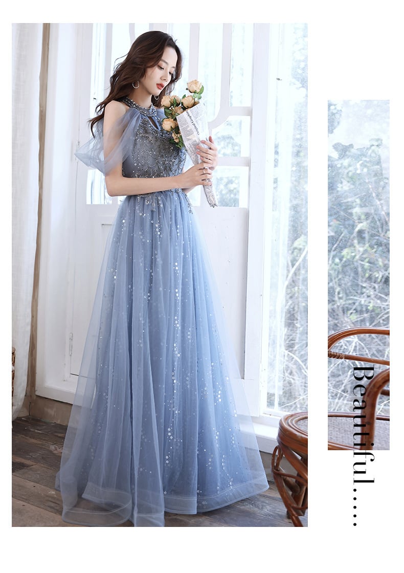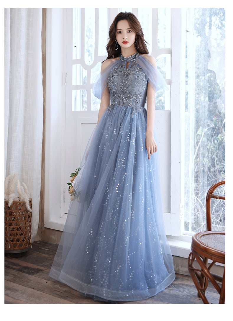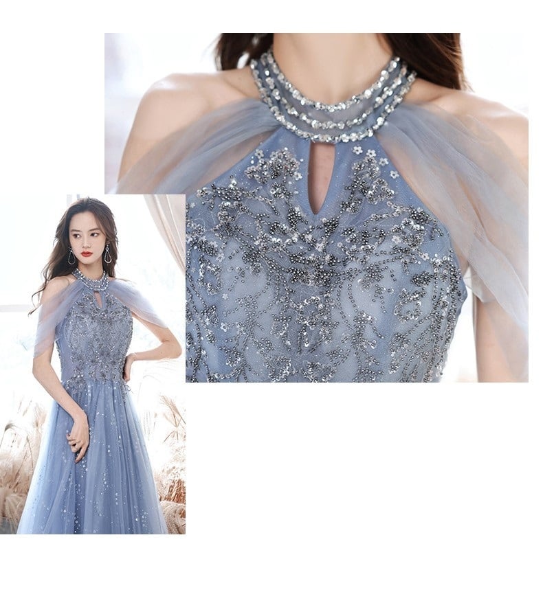 ホルターネック&バストラインの荘厳なスパンコールがエレガント。