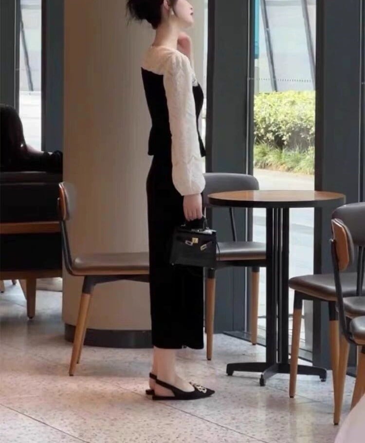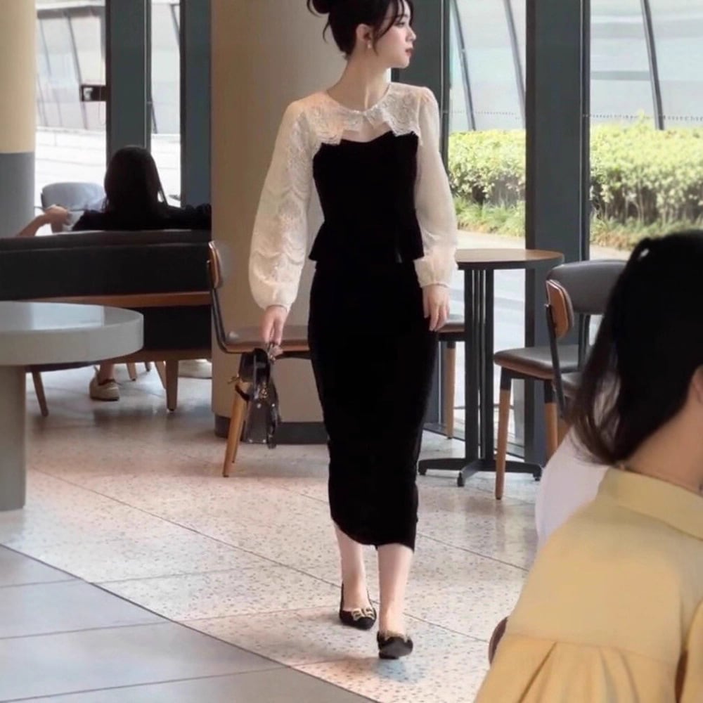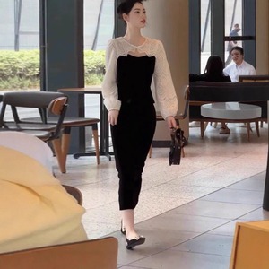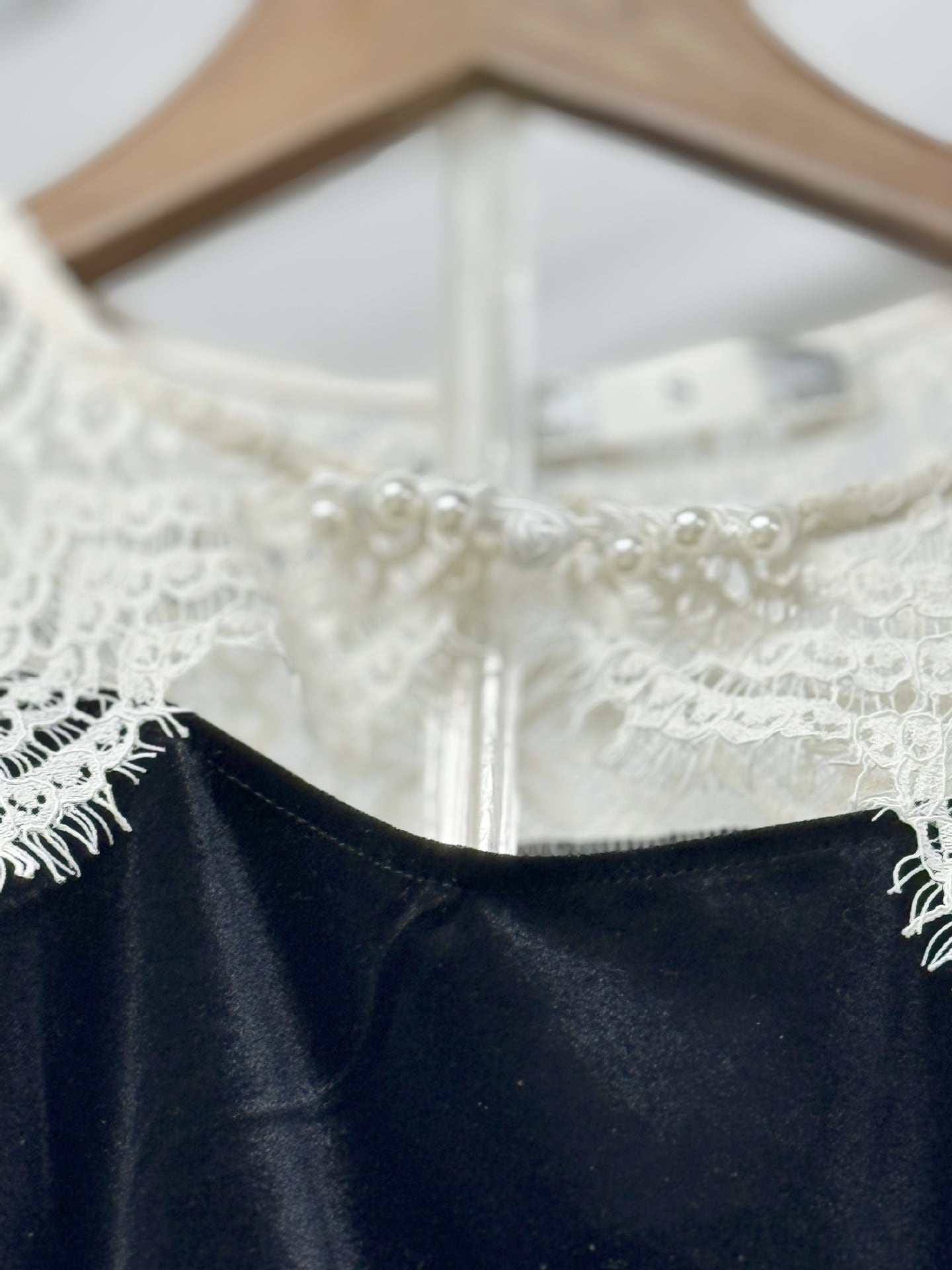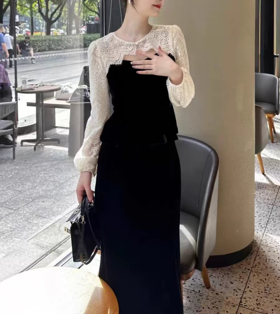 フェイクツーピース風デザインでお首まわりとお袖のレース感がエレガント。
