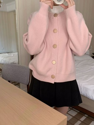 ちょこんとついた大きなボタンが大人可愛いカーディガン。