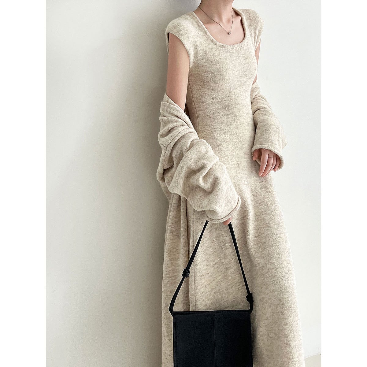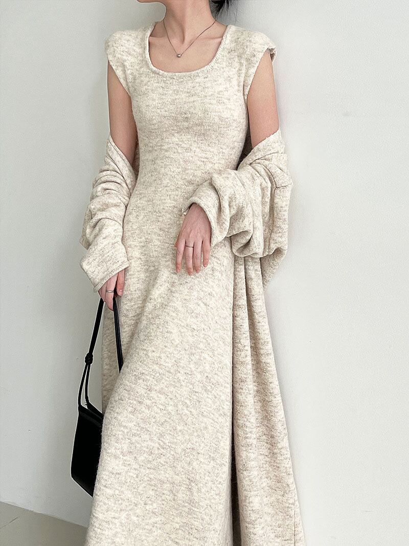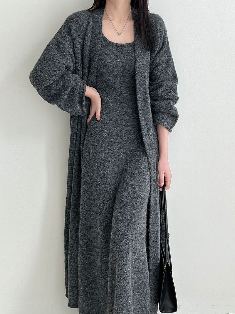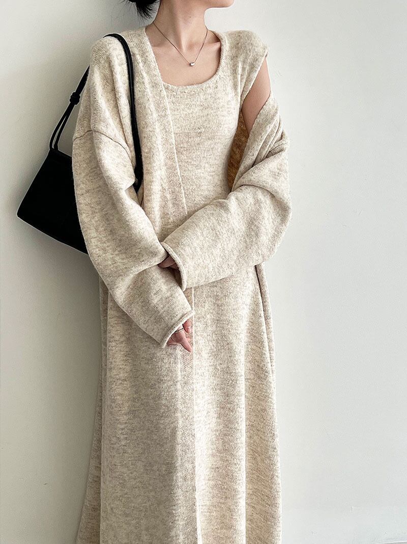 大人エレガントなコーディガン+ニットワンピースのセットアップ。