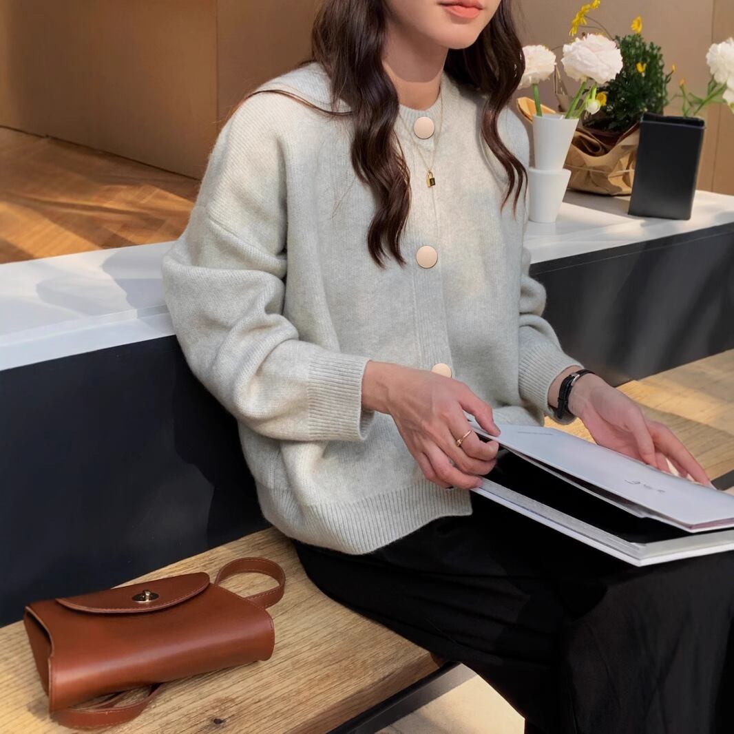 ちょこんとついた大きなボタンが大人可愛いカーディガン。