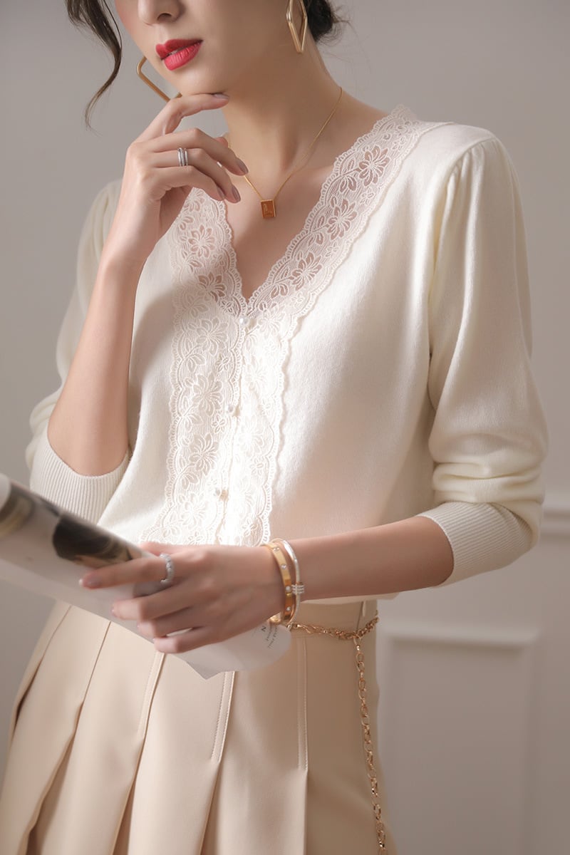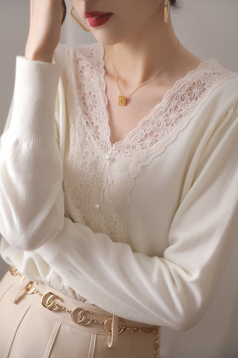 デコルテラインにもレースとパールがあしらわれており上品な印象に。