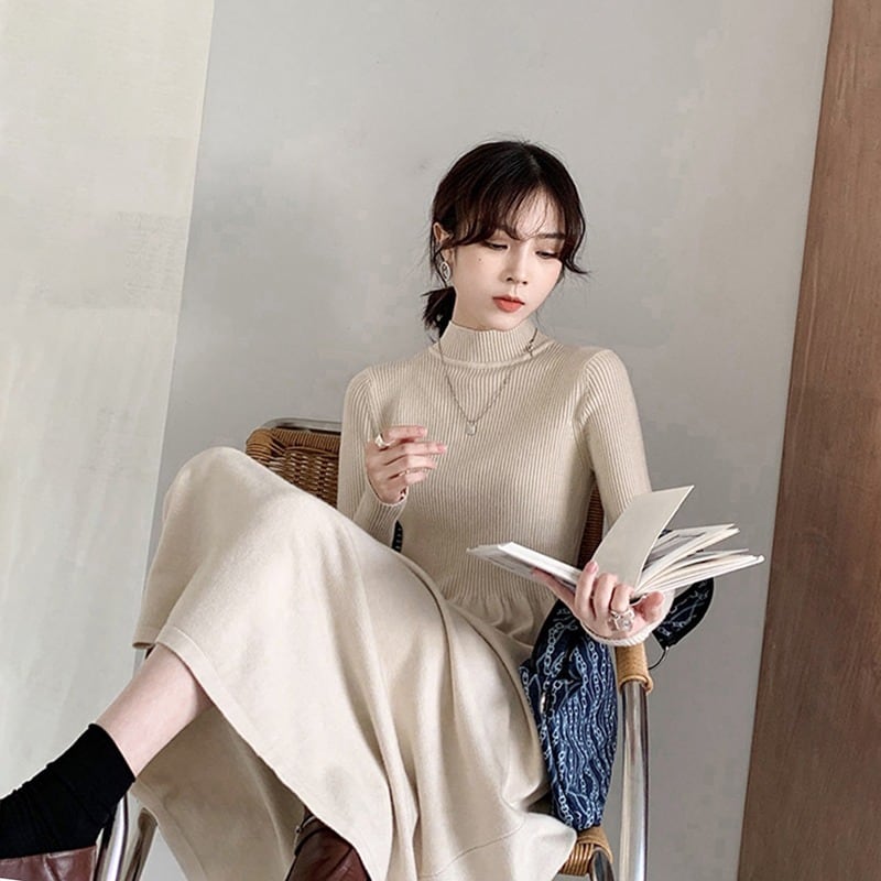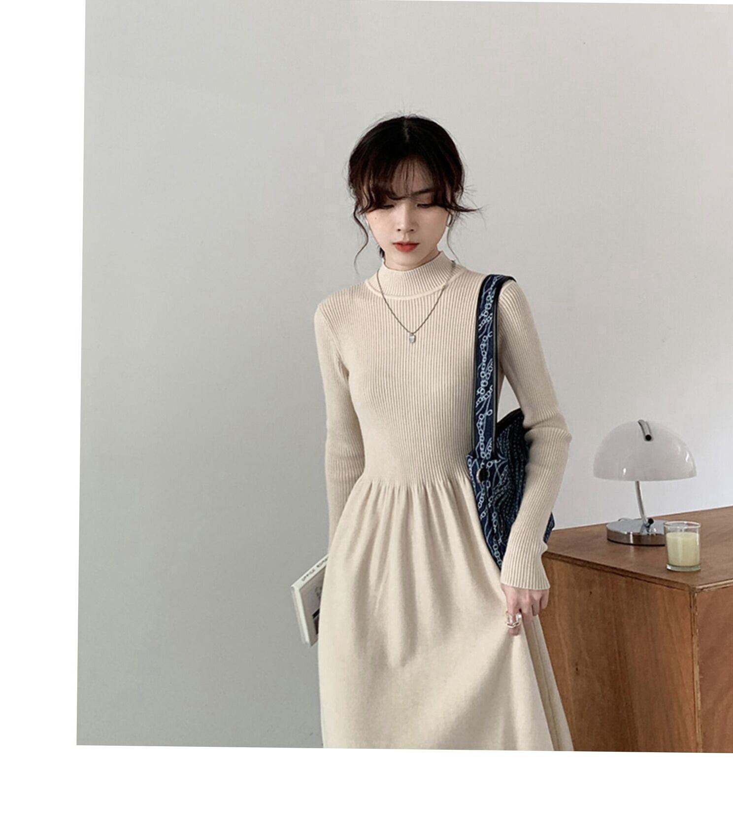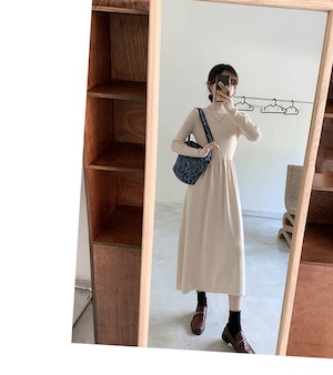 大人可愛いロング丈のハイネックリブニットワンピース。