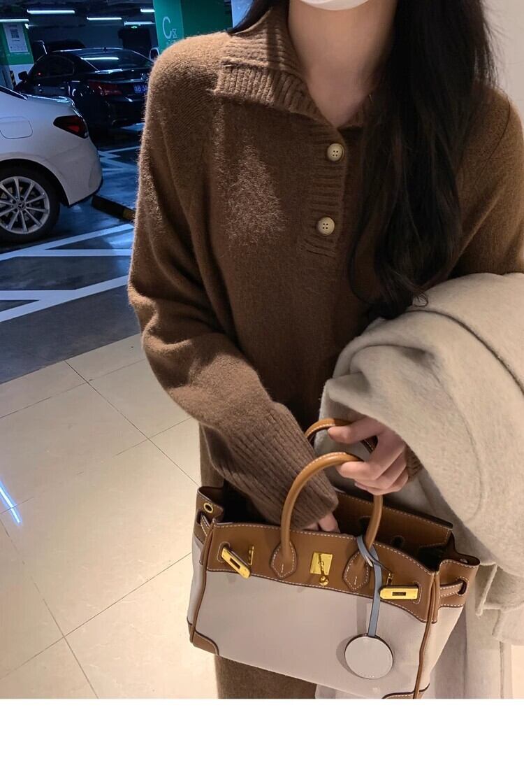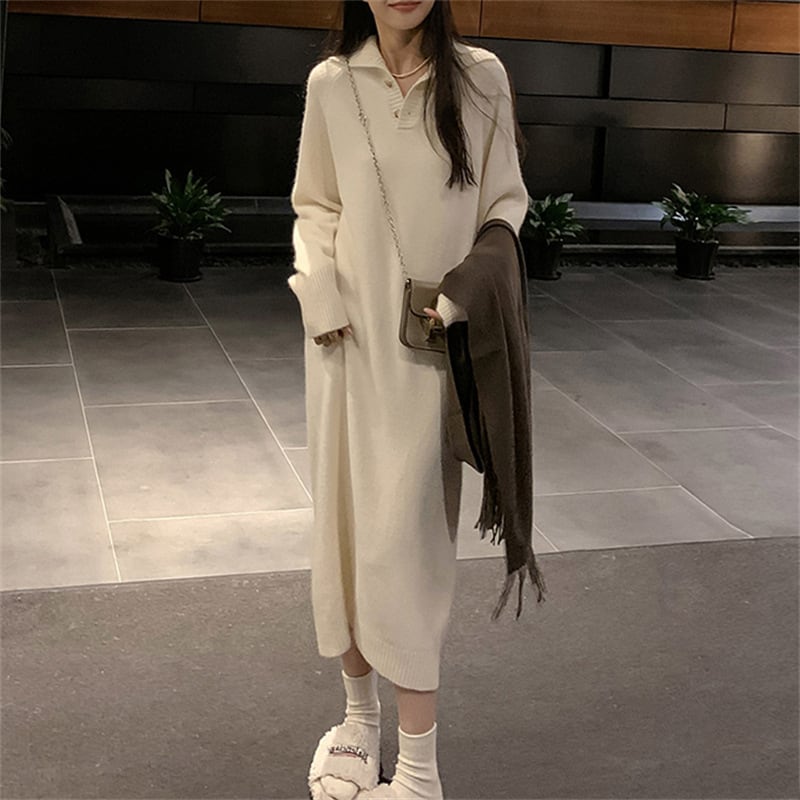 大人可愛いポロ襟のロング丈ニットワンピース。