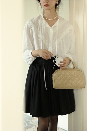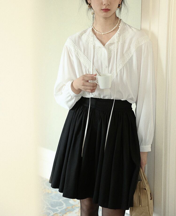 肩から斜めに入ったレース使いが可憐で女性らしさを引き立てる。