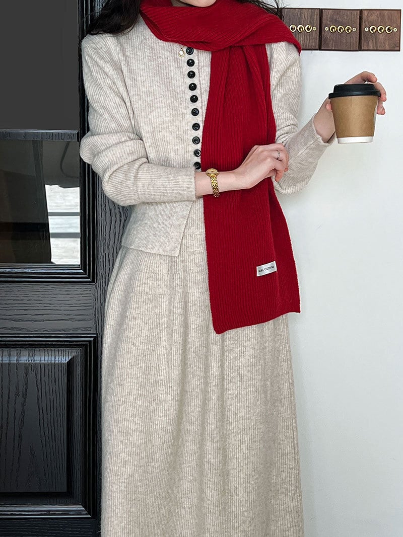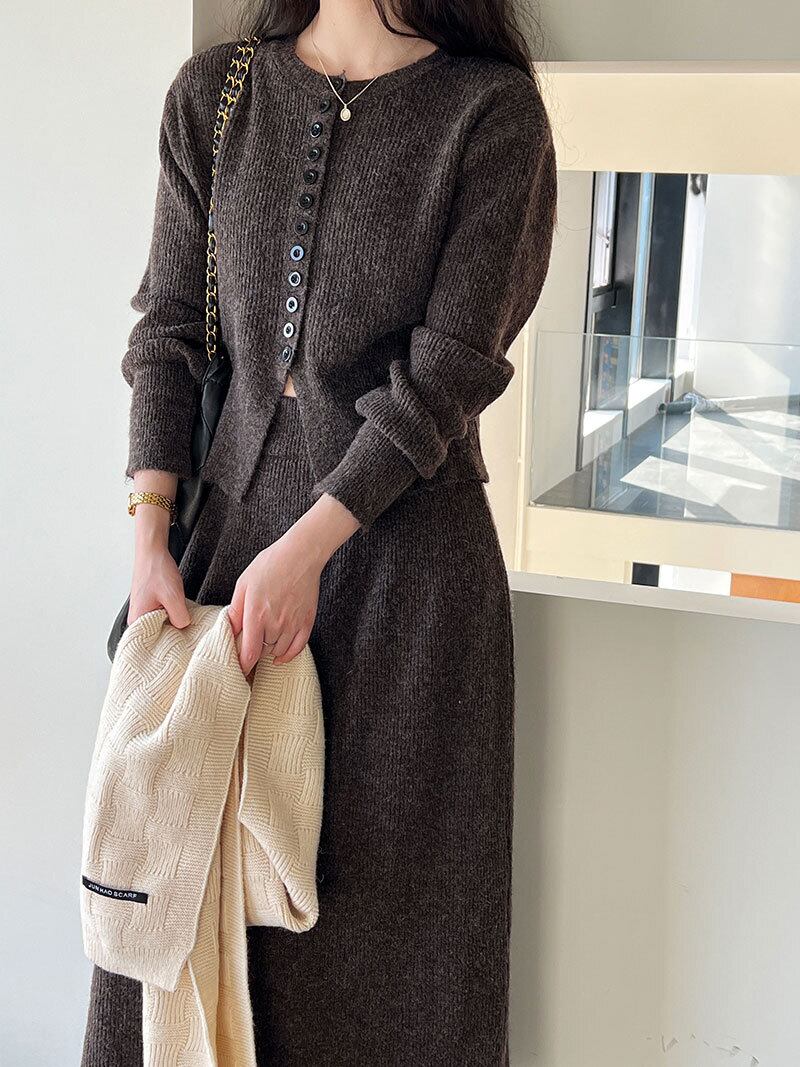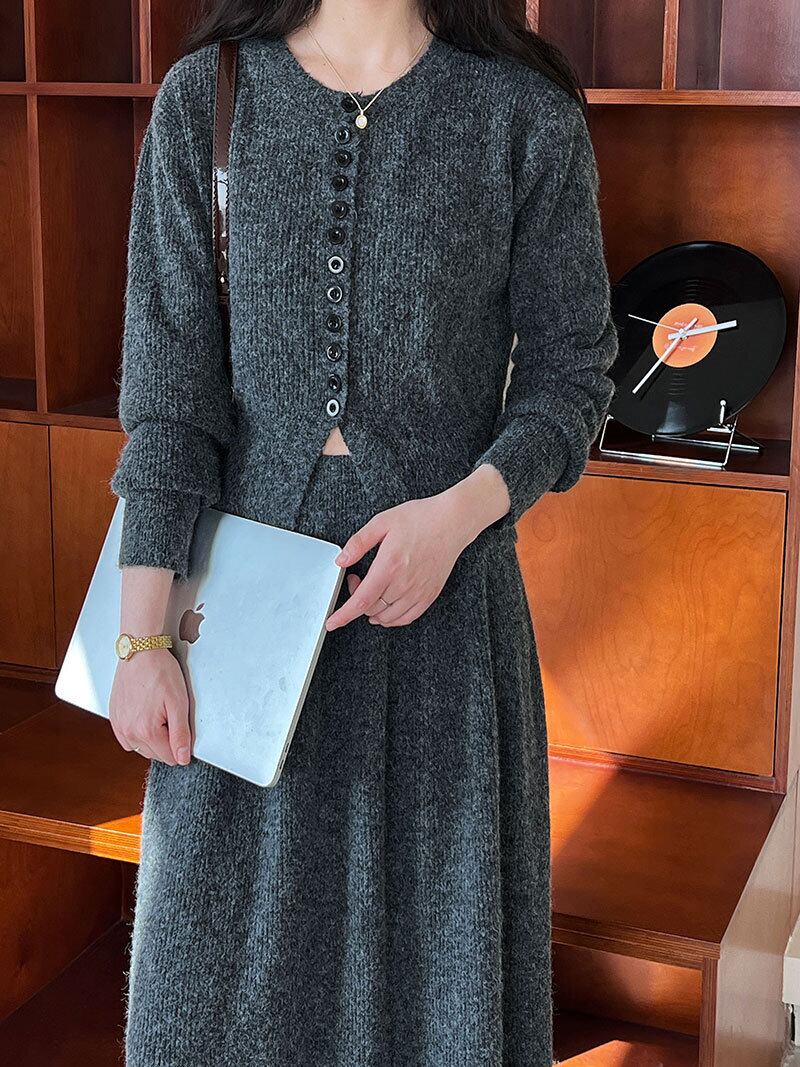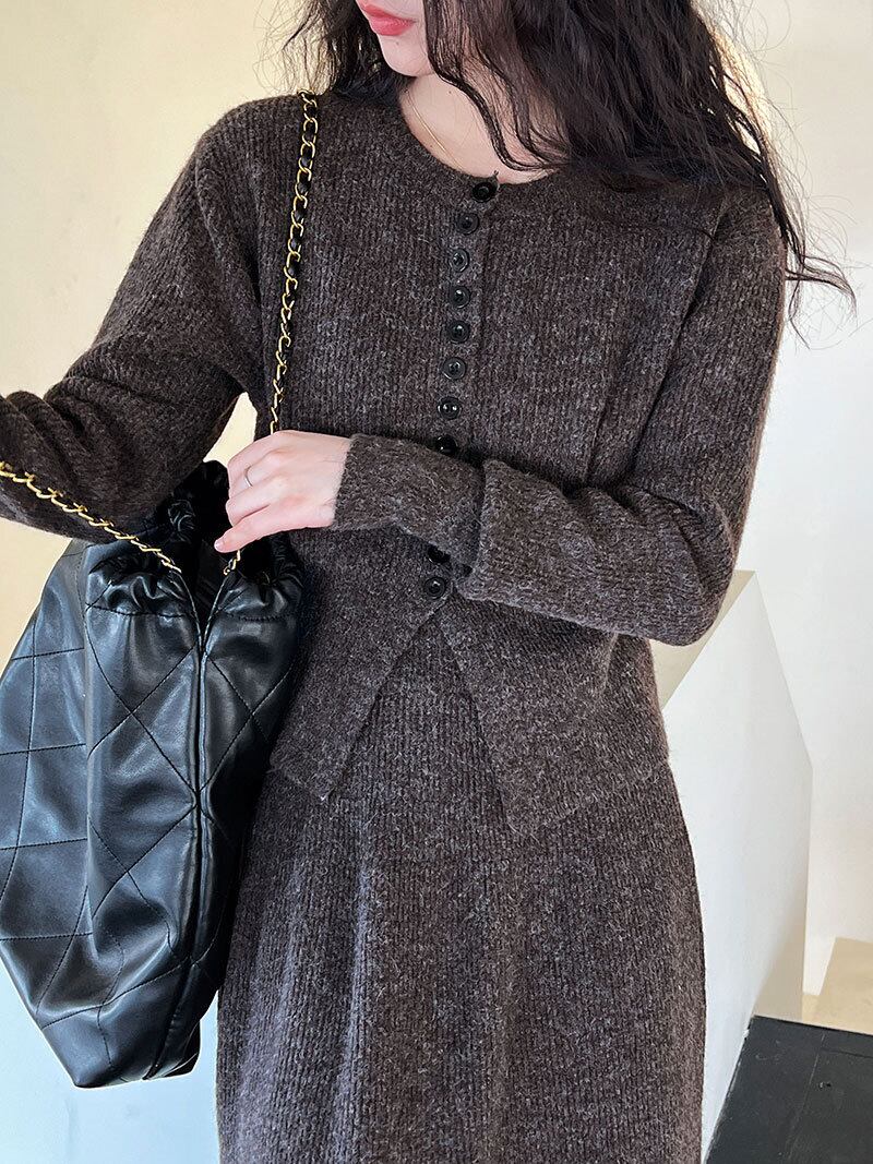 大人可愛いカーディガン+ニットスカートのセットアップ。