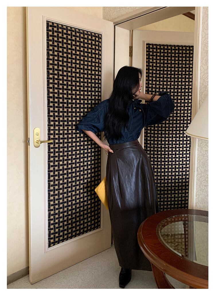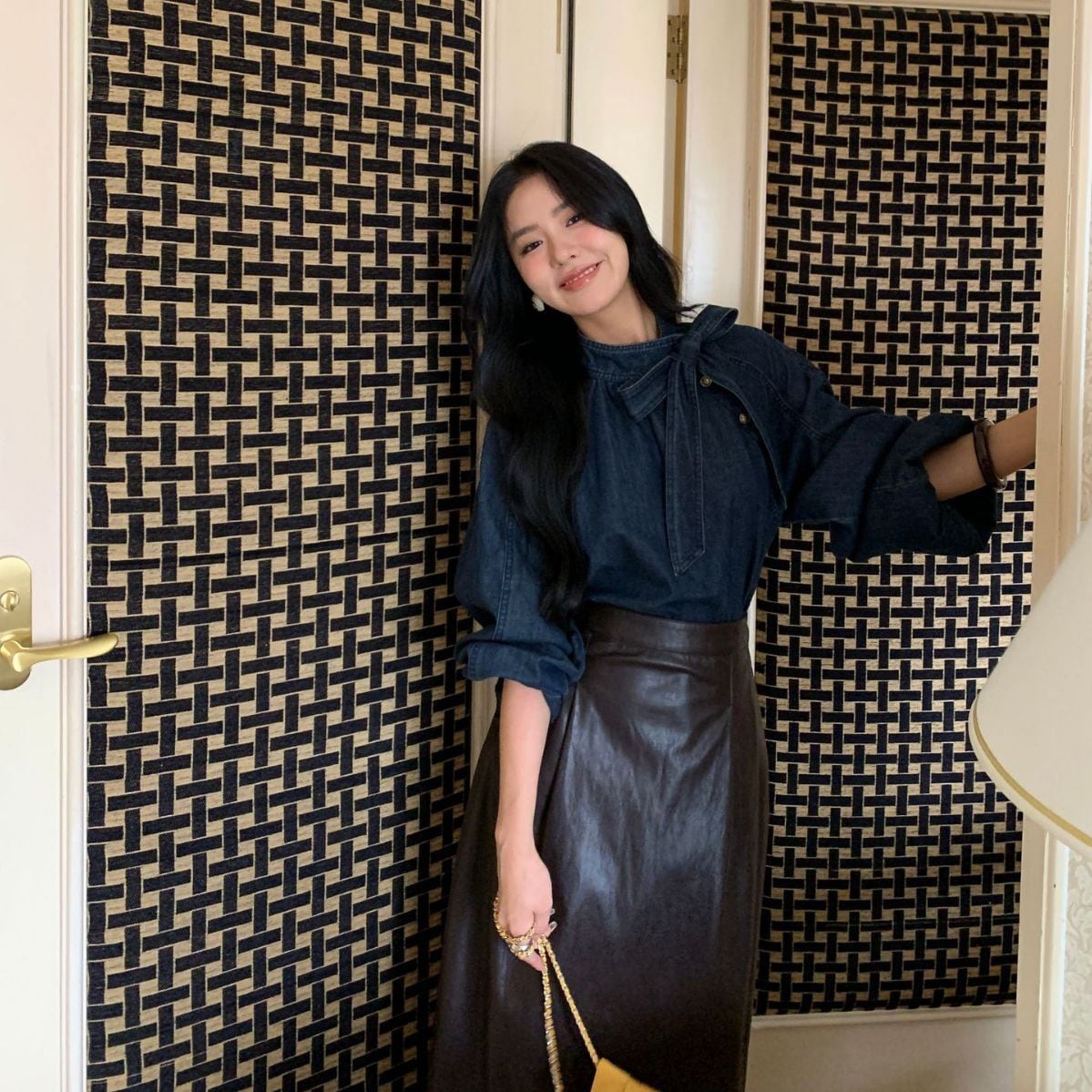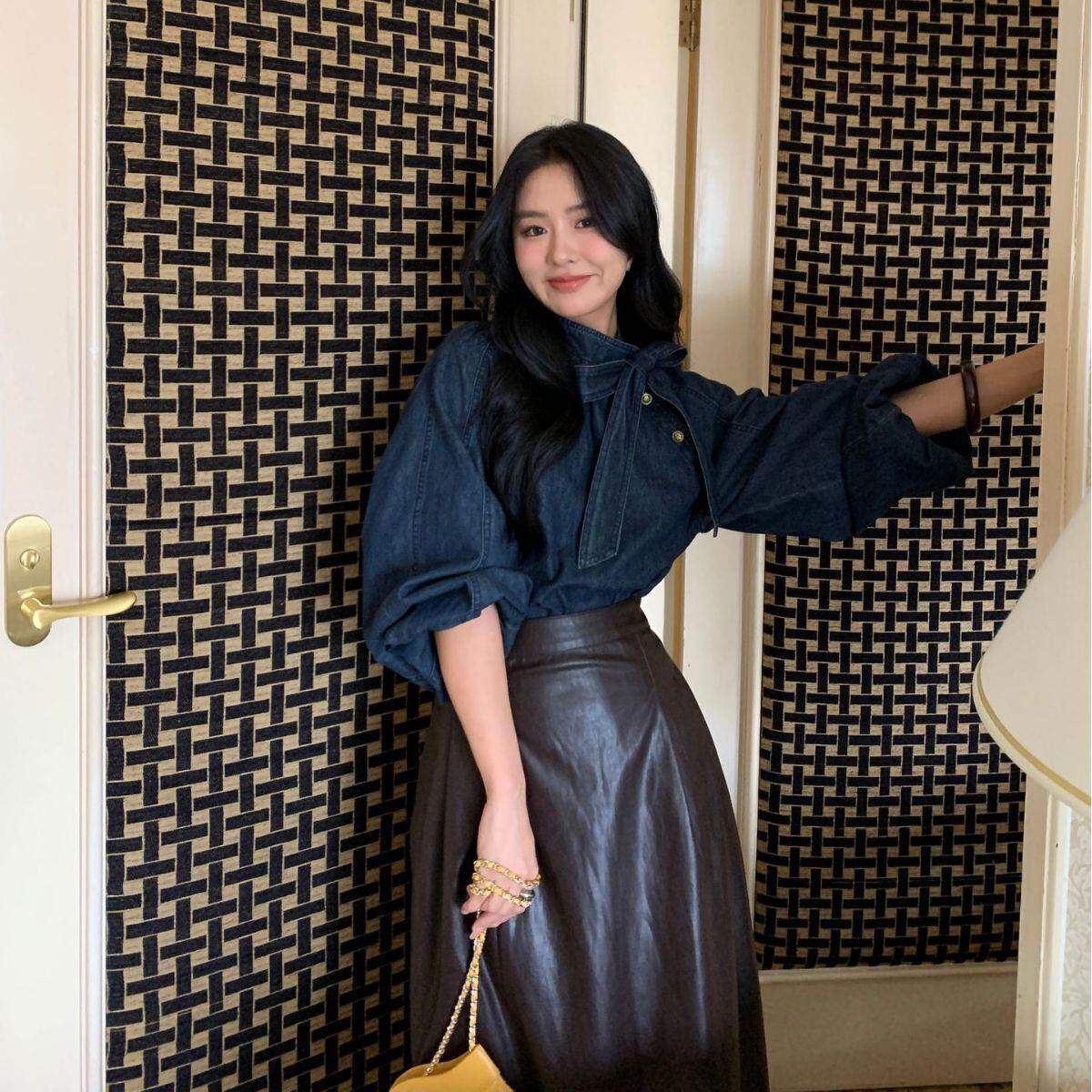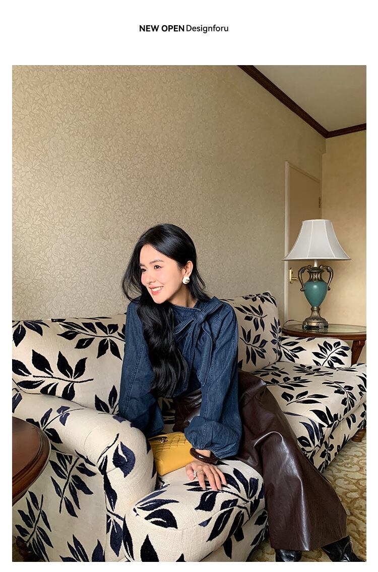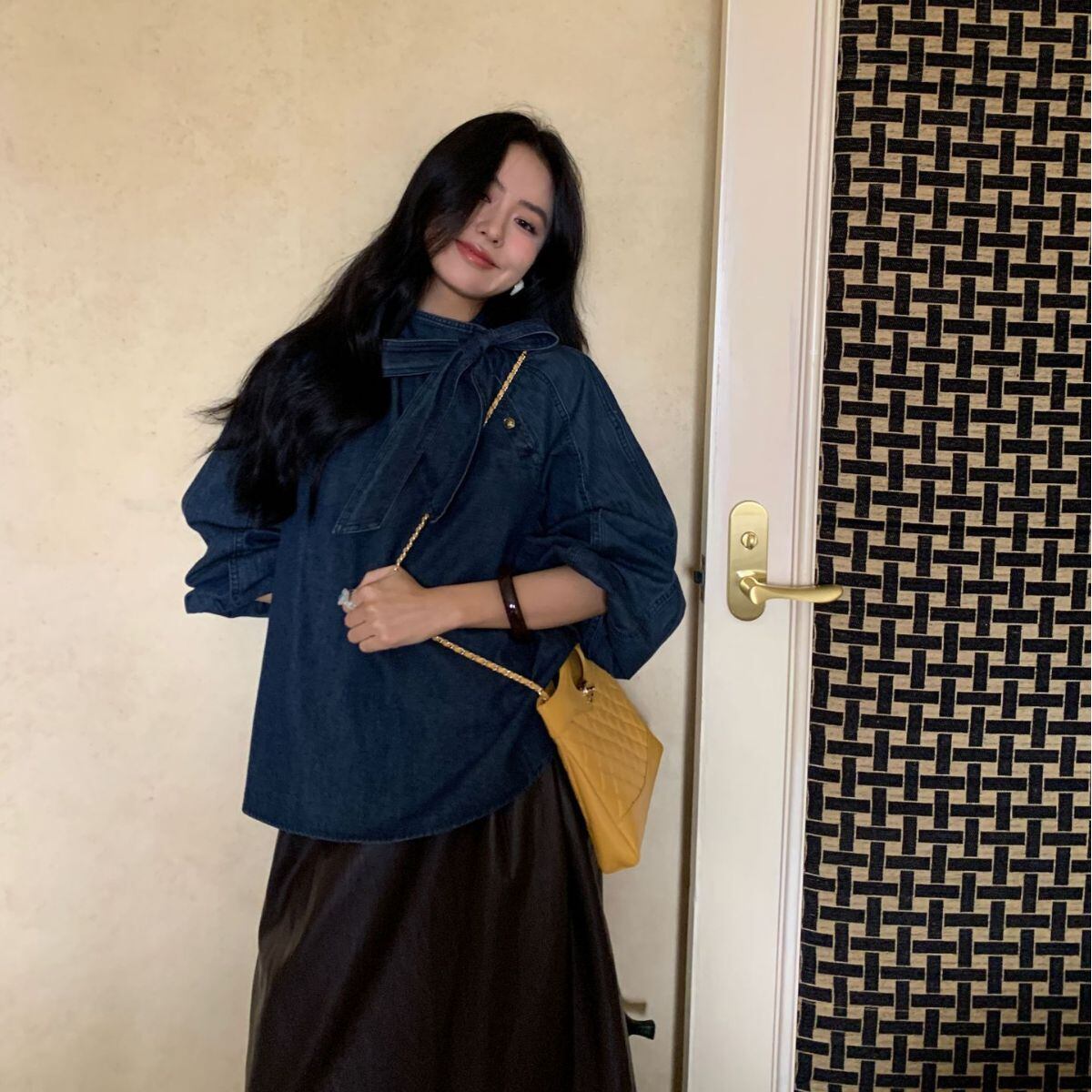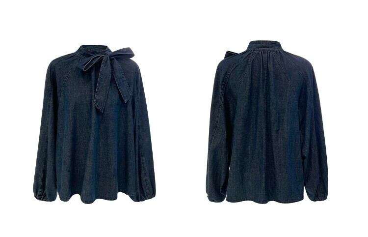 お首まわりのリボンが大人可愛いデニム生地のブラウス。