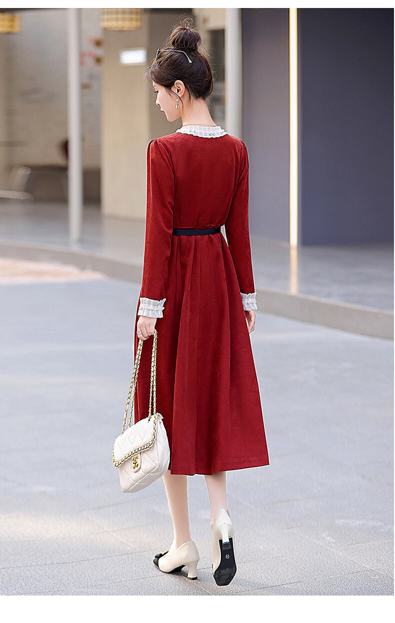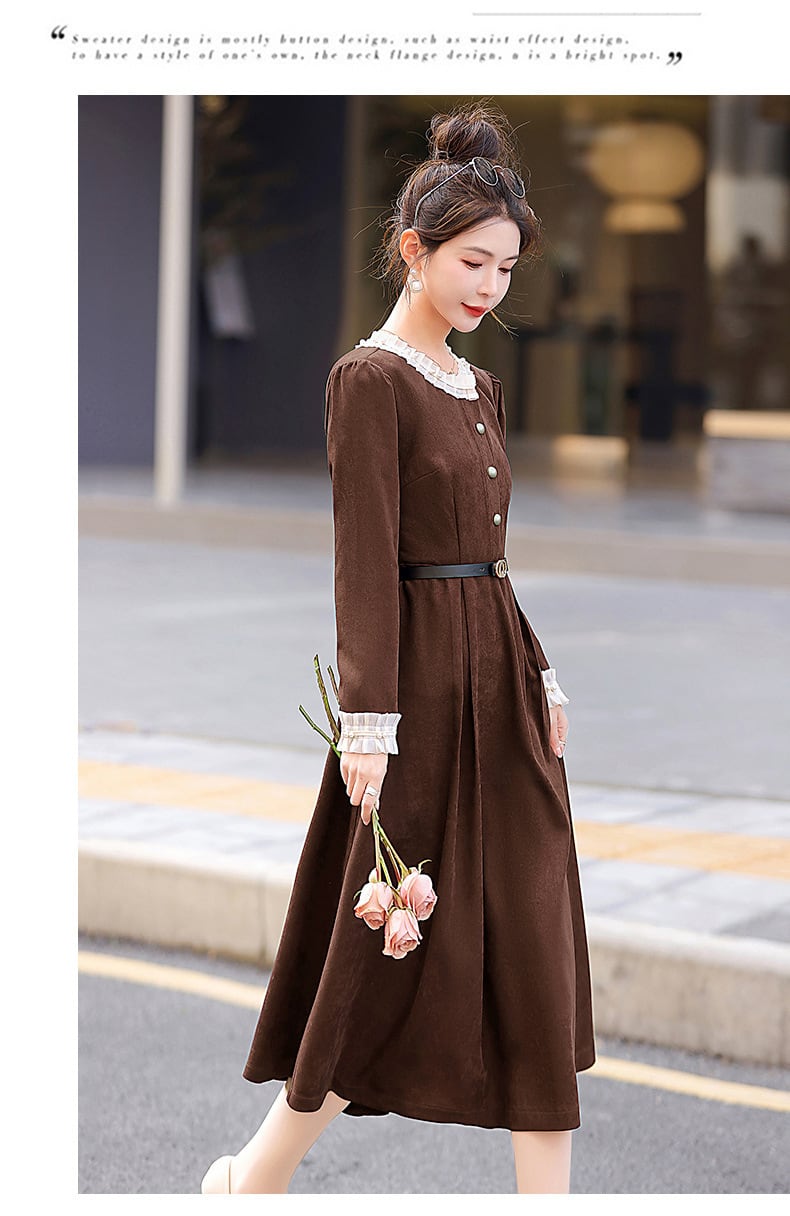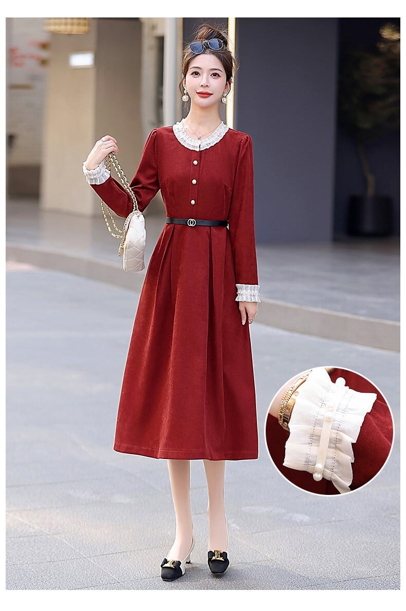 フリルネックとウエストのベルトがポイントできゅっと引き締まったウエストに。