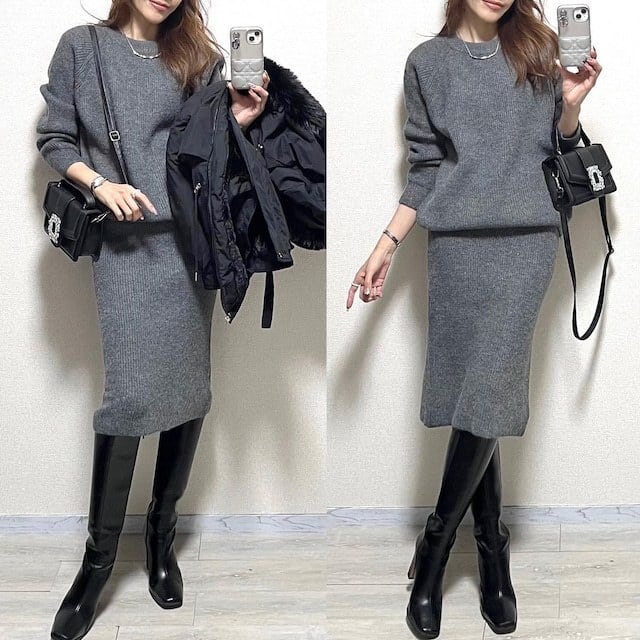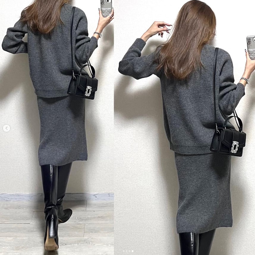 大人エレガントなニットセーター+タイトスカートのセットアップ。
