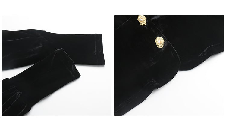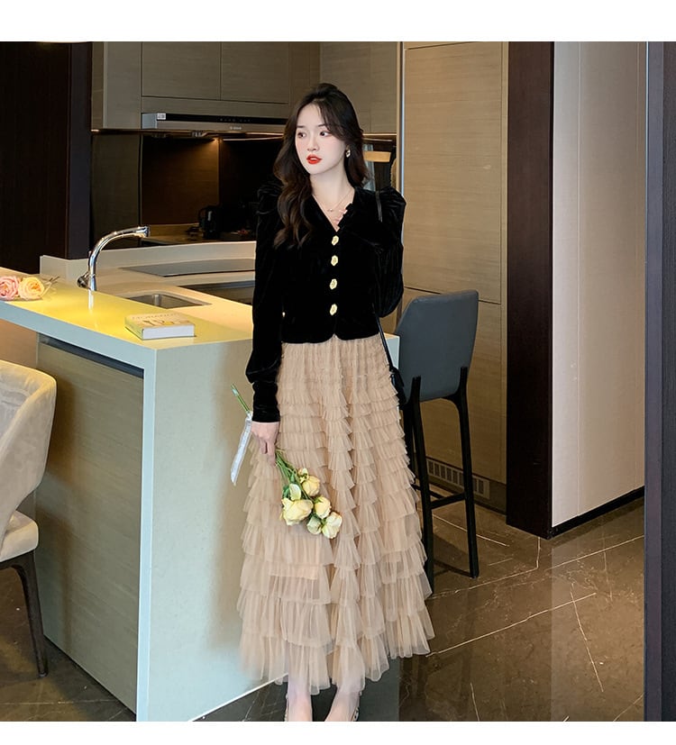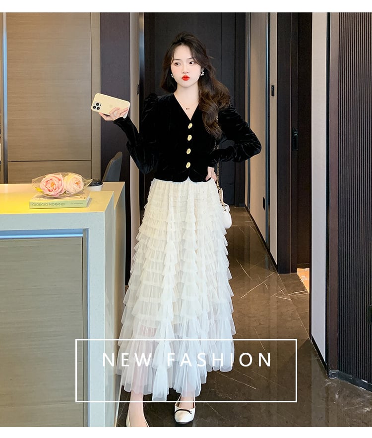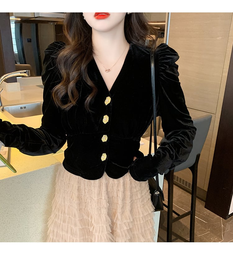 vネックとパフスリーブでデコルテラインを華奢見せ効果も。