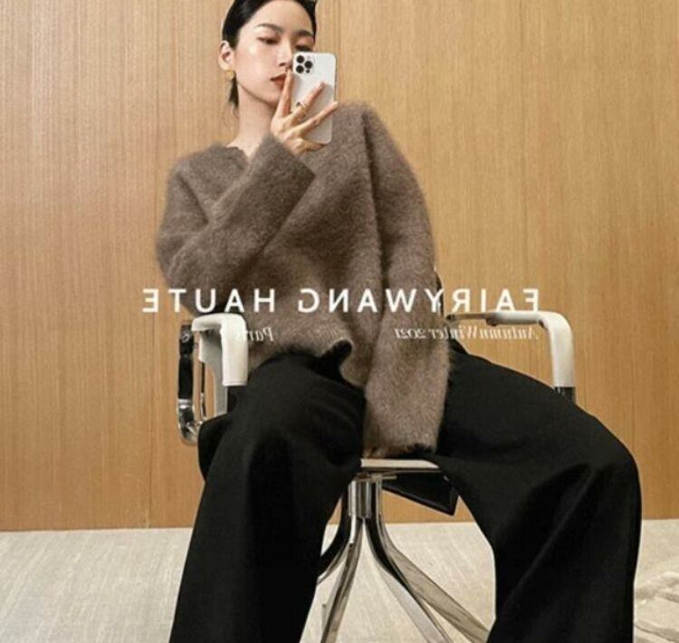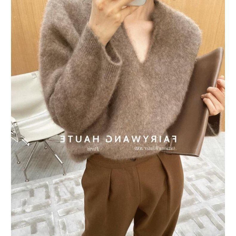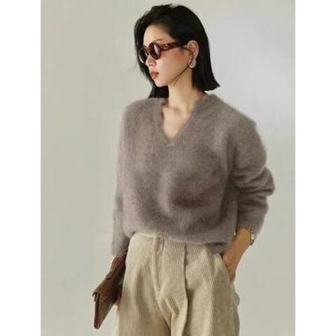 大人エレガントなキーネックのシャギーニット。