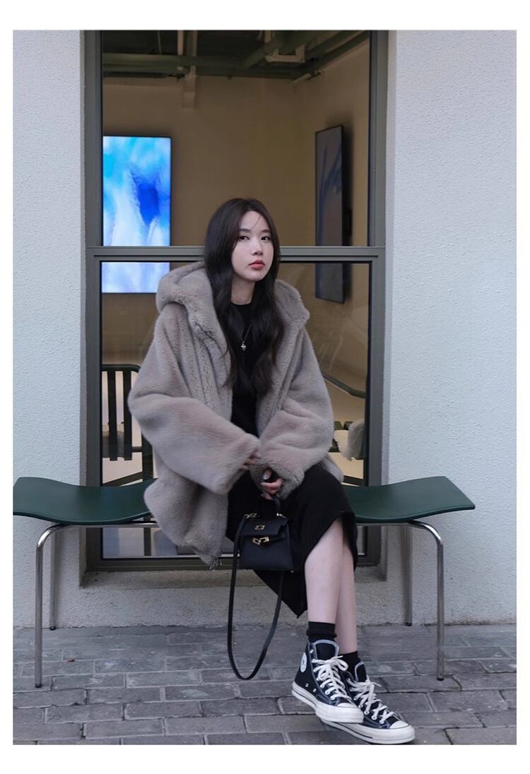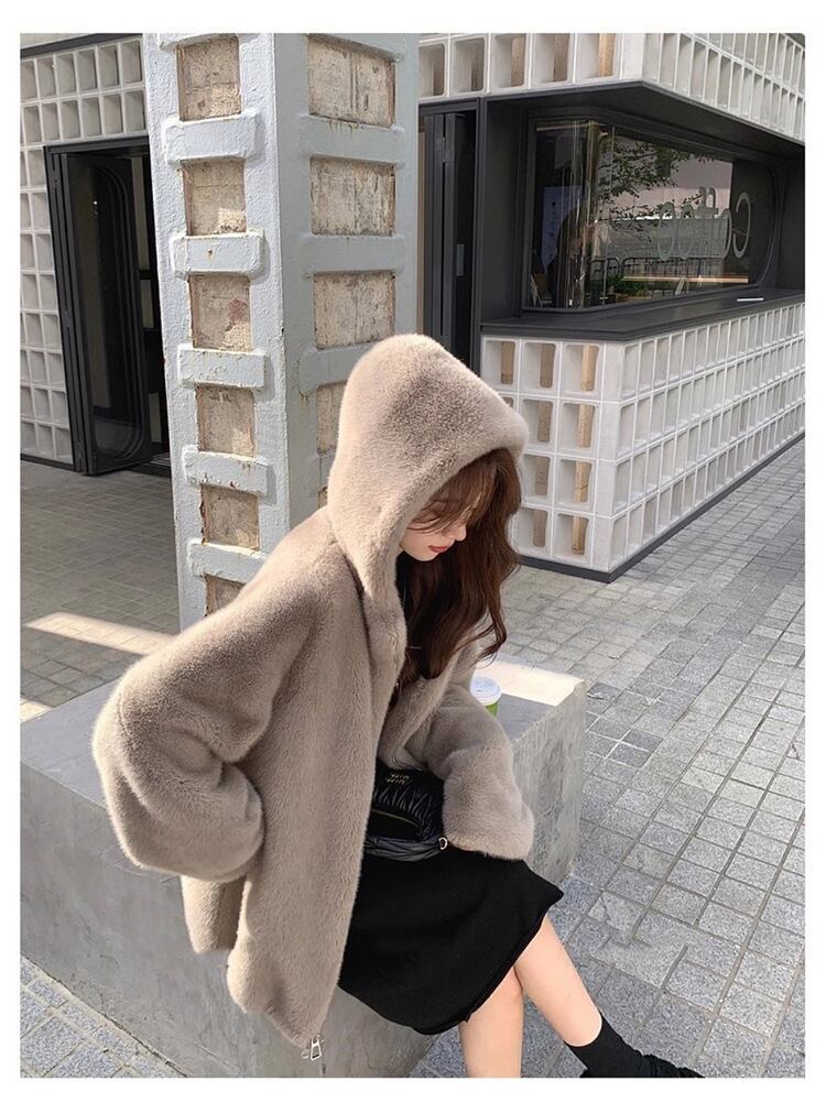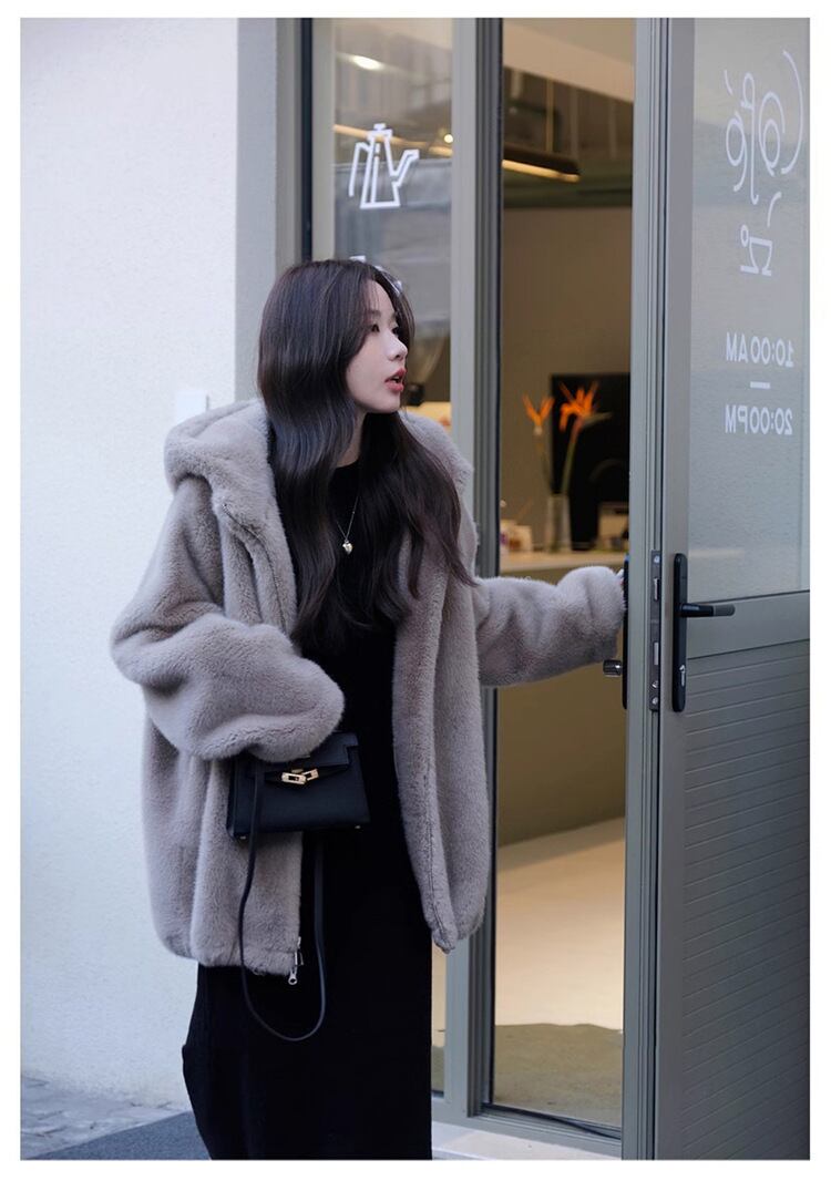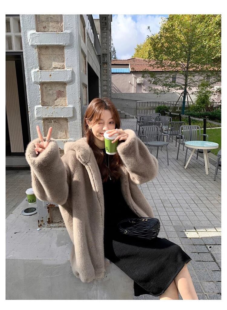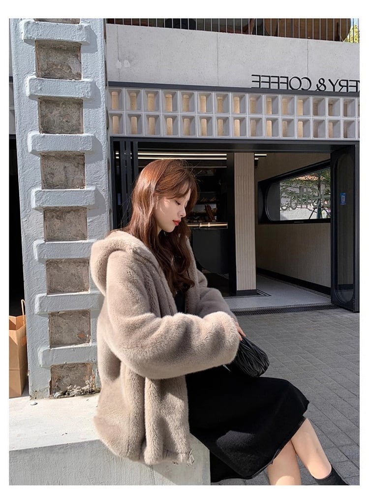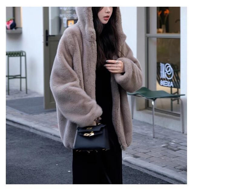 大人エレガントなフード付きのミドル丈ファーコート 。