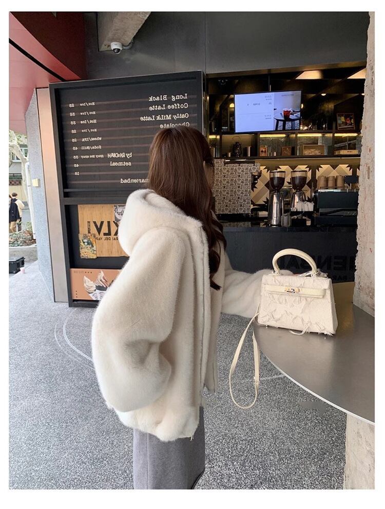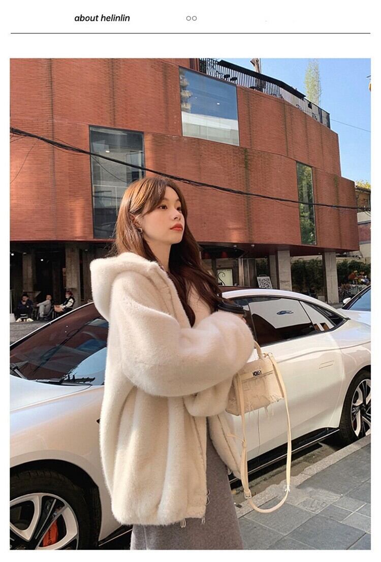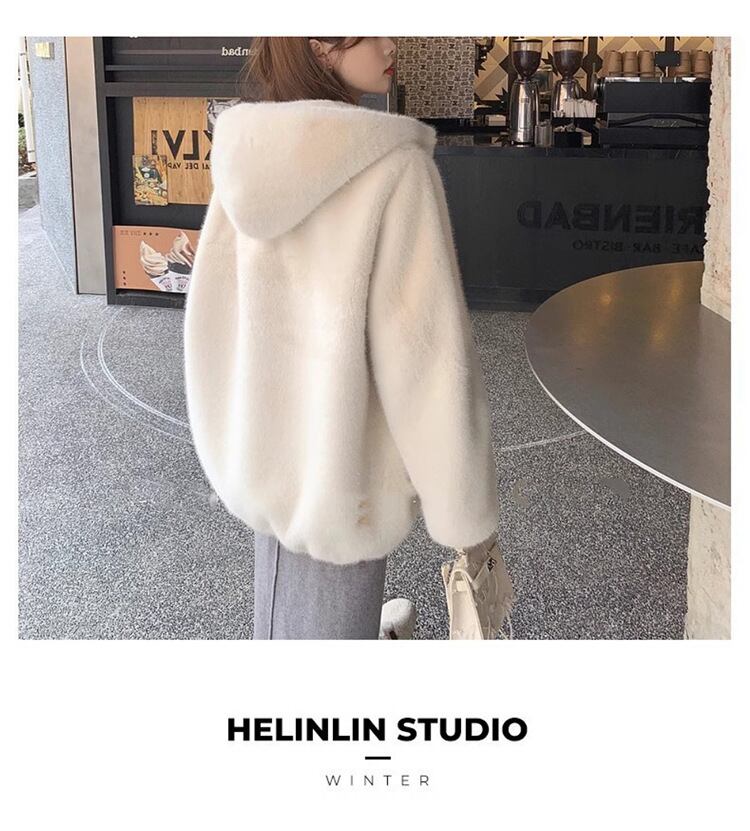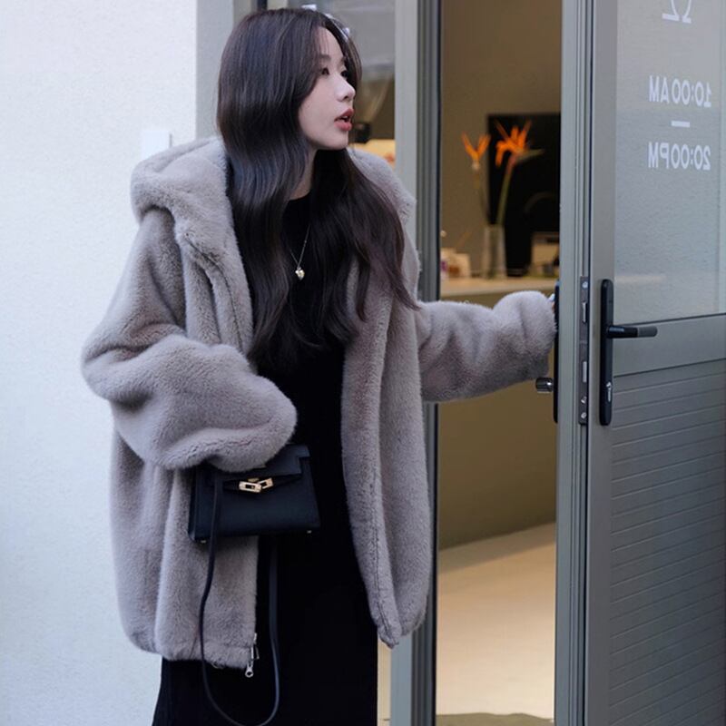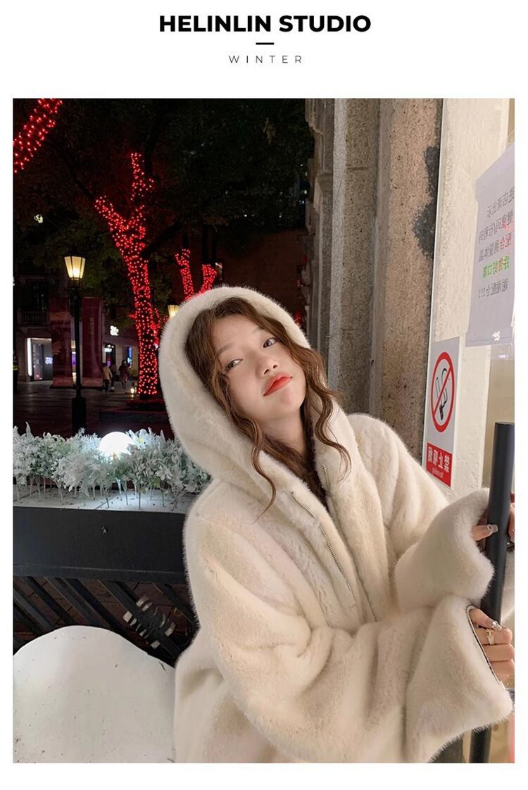 大人エレガントなフード付きのミドル丈ファーコート 。