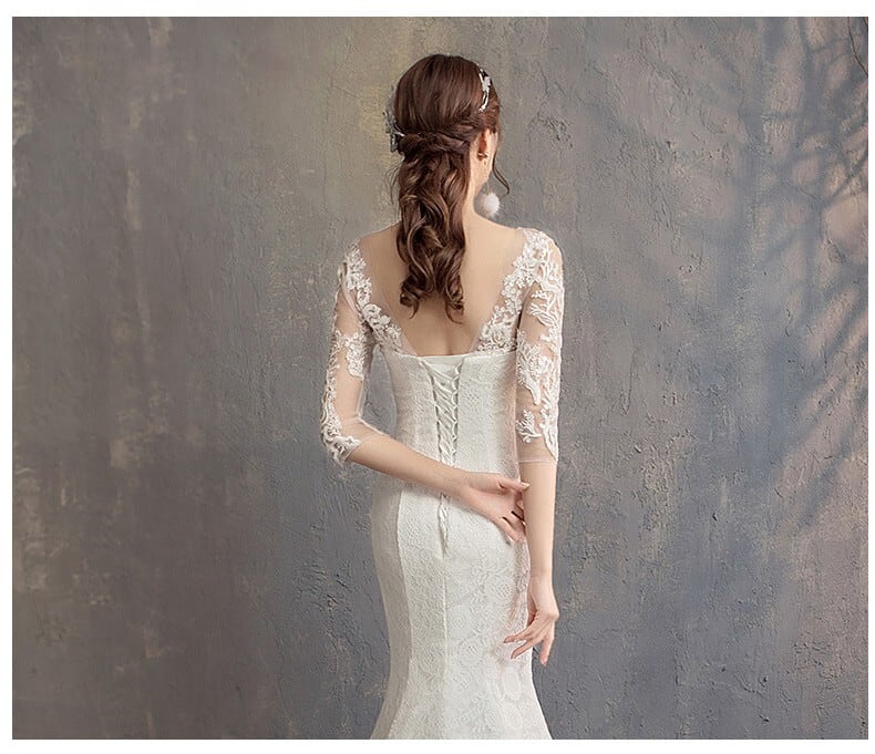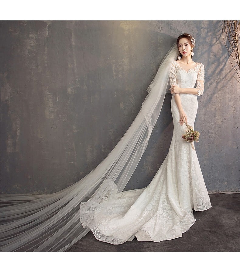 ロングトレーンがエレガントで流れるようなラインを演出。