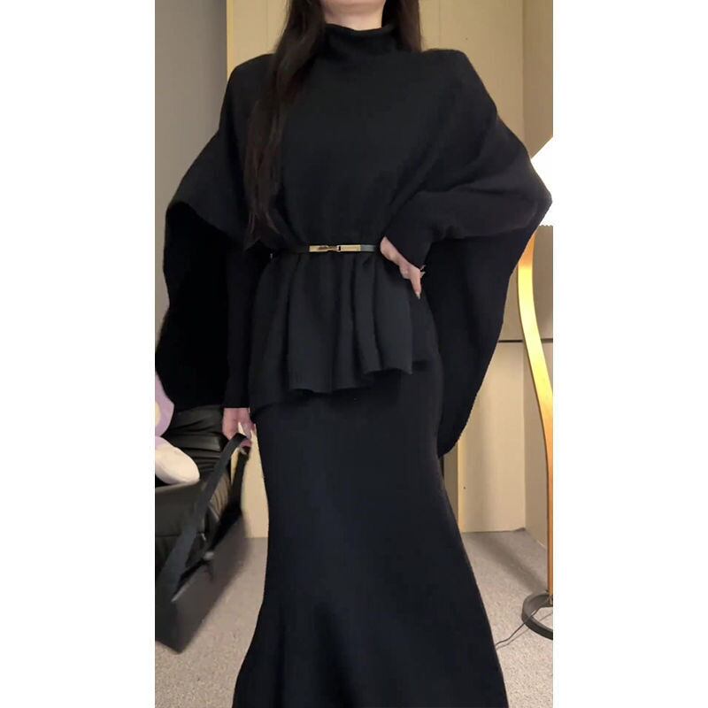 大人エレガントなケープトップス+リブニットワンピースのセットアップ。