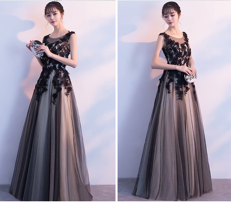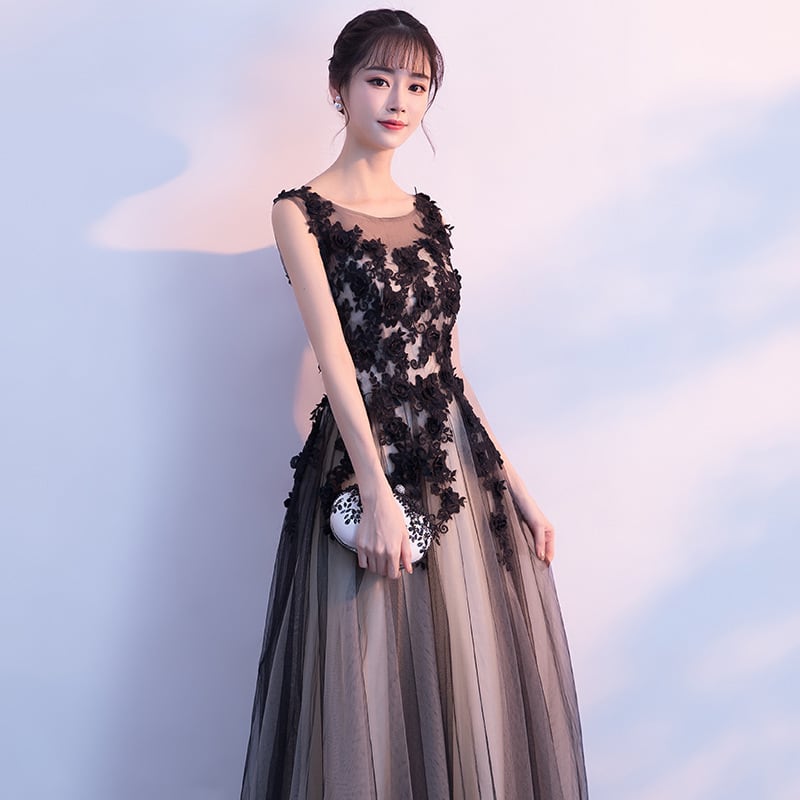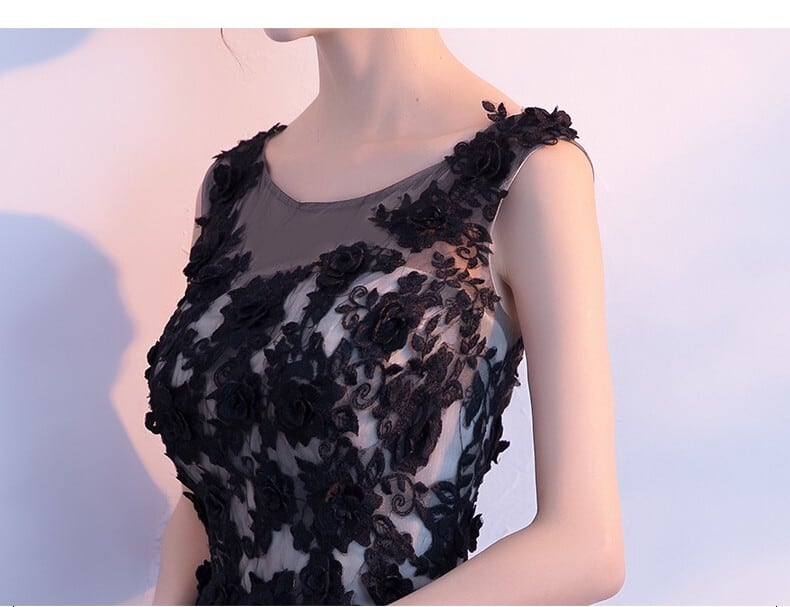 肩からウエストにかけての立体花刺繍がシックでエレガントなパーティードレス。