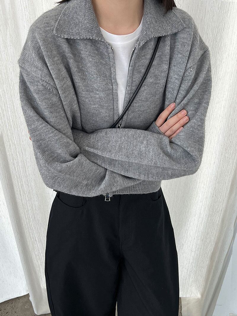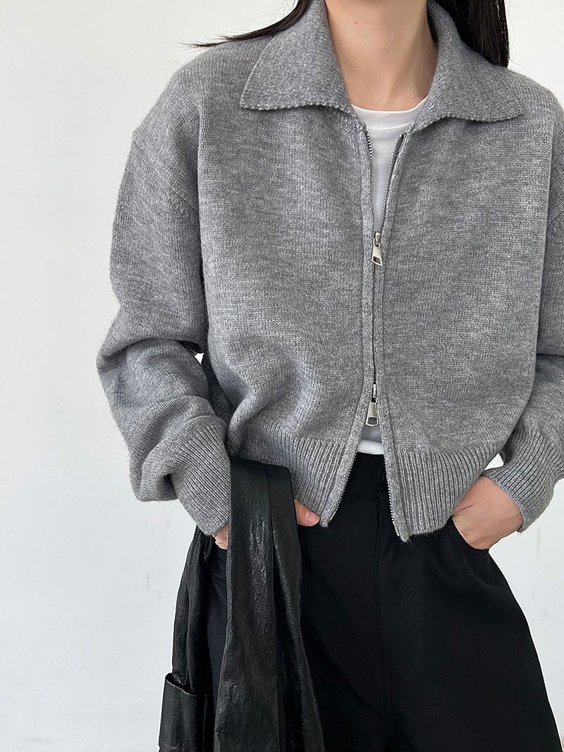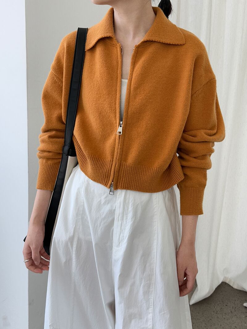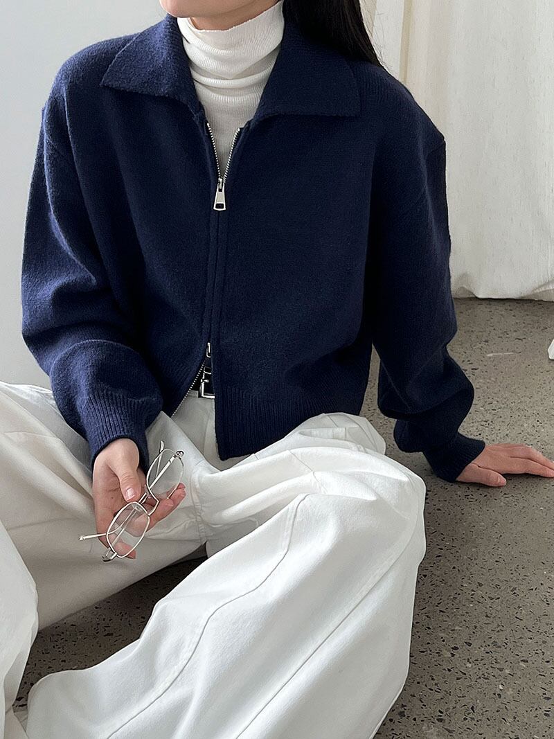 大人可愛いポロ襟のダブルジップショート丈カーディガン。