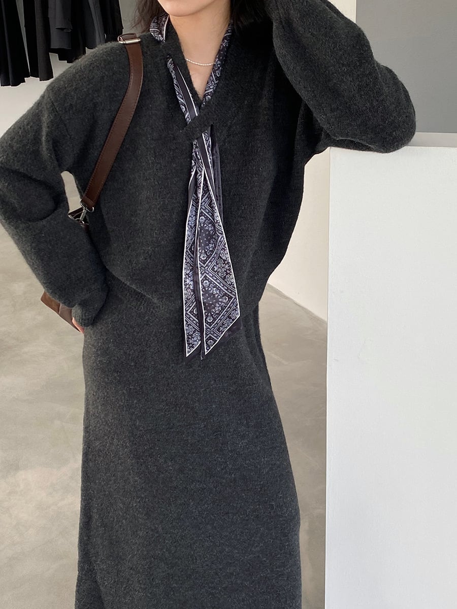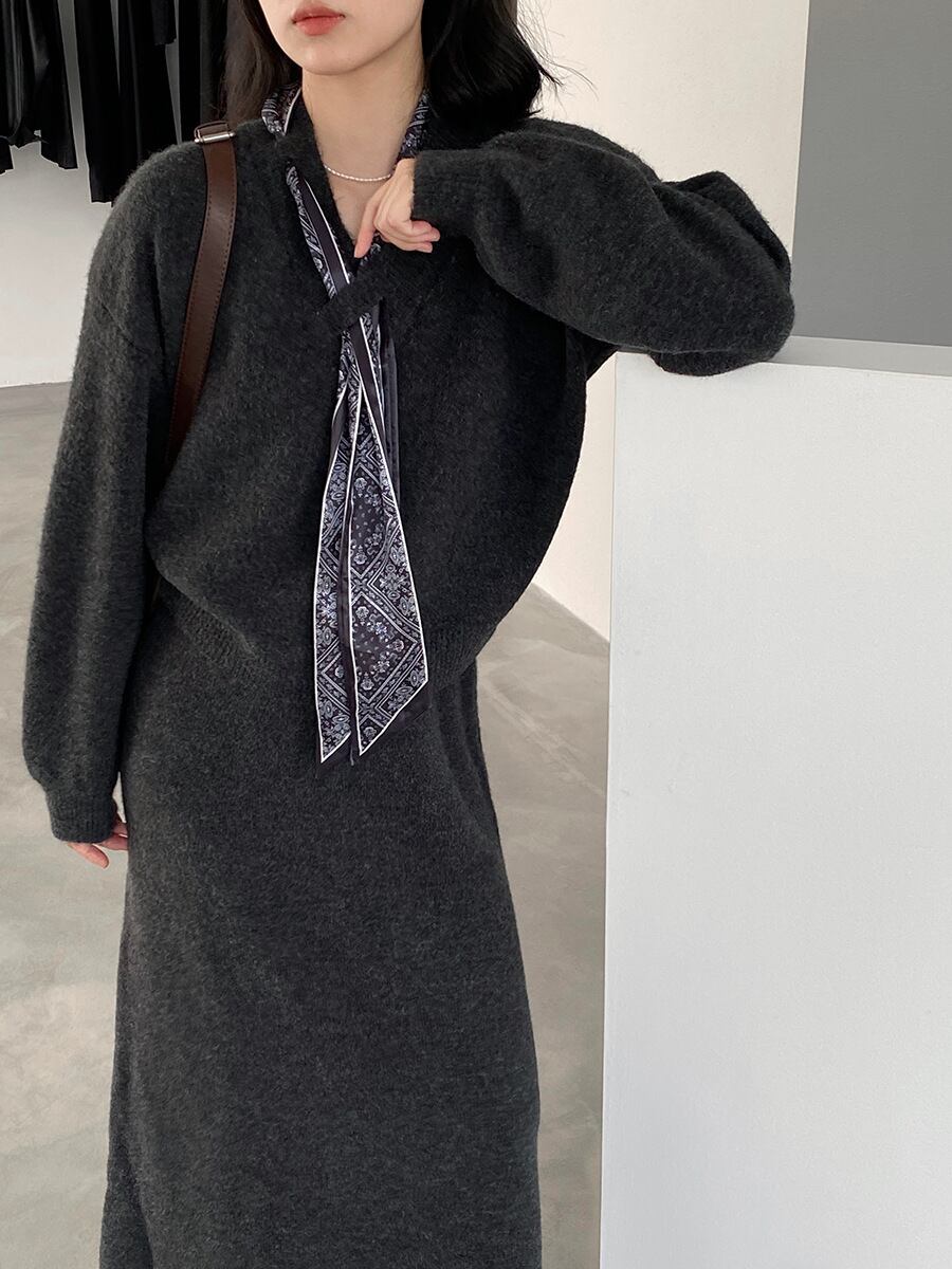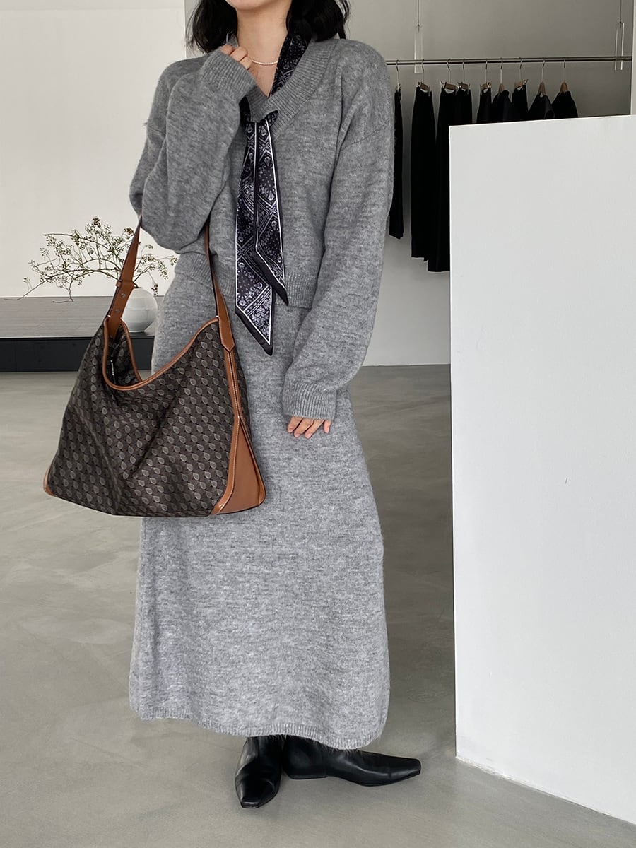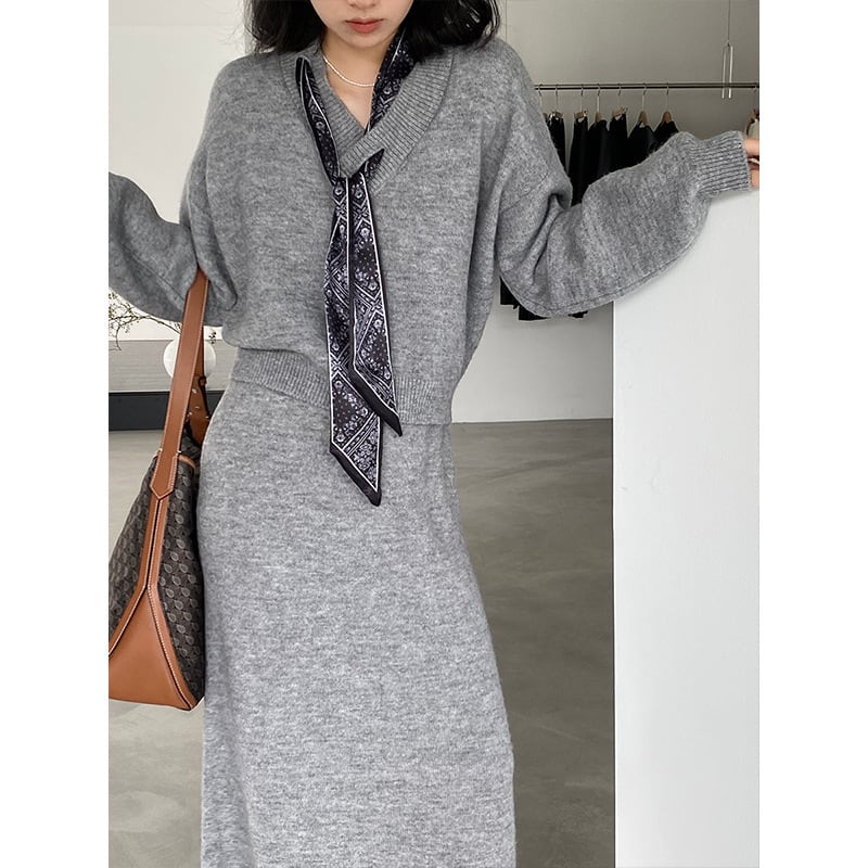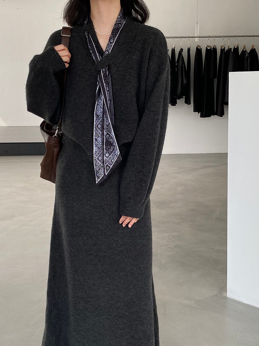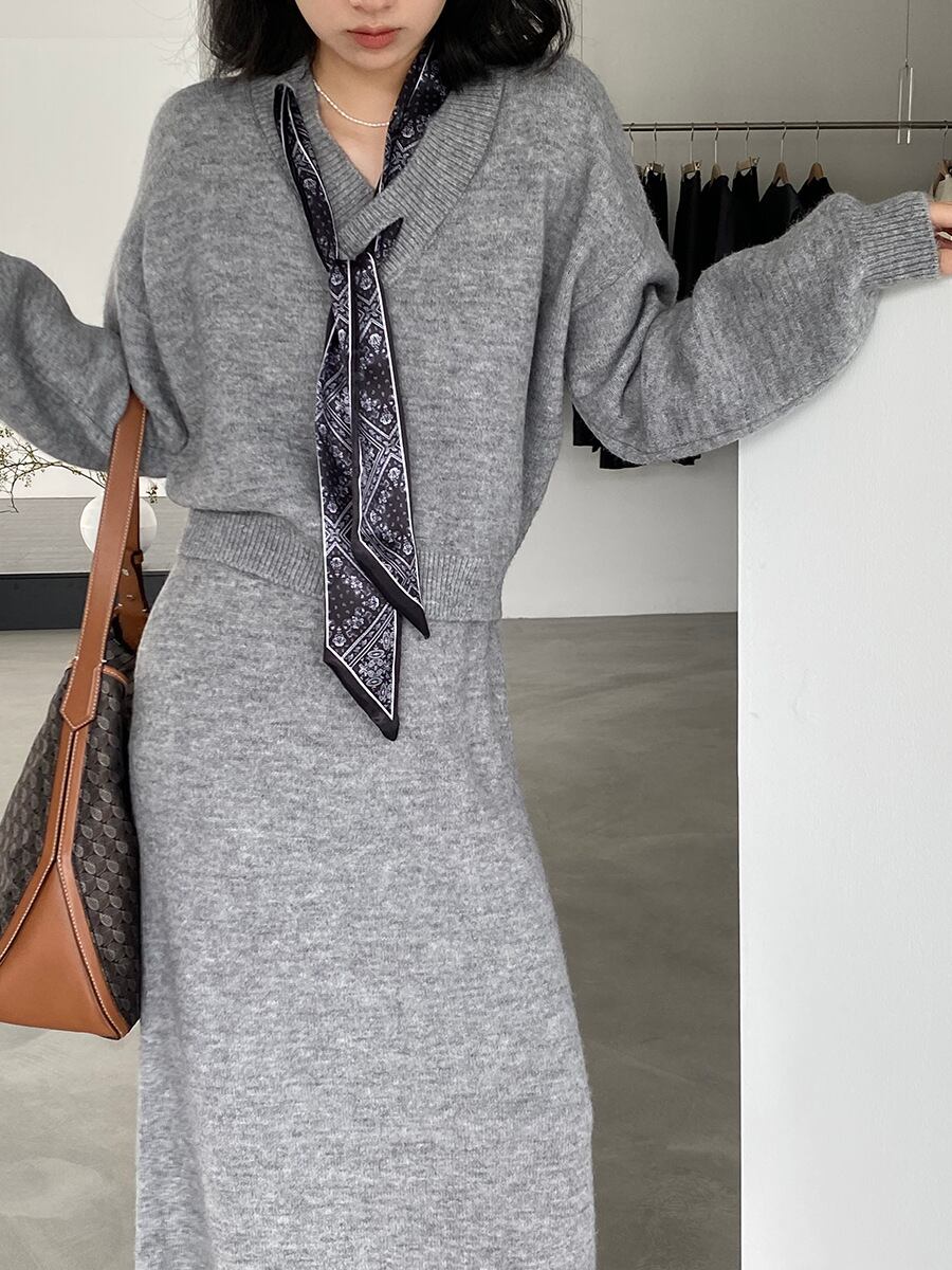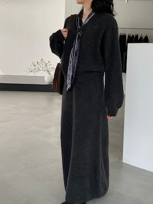 大人可愛いシルクスカーフ付きのニットセットアップ。