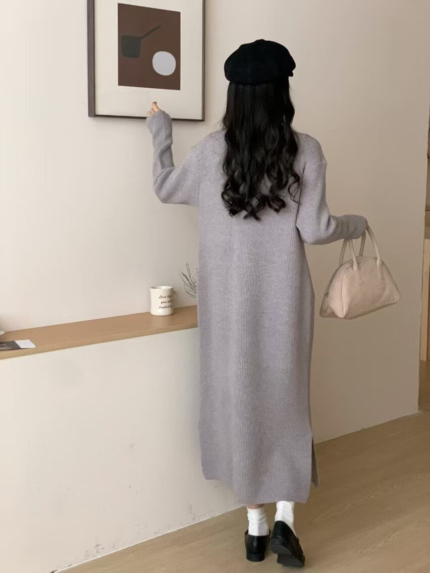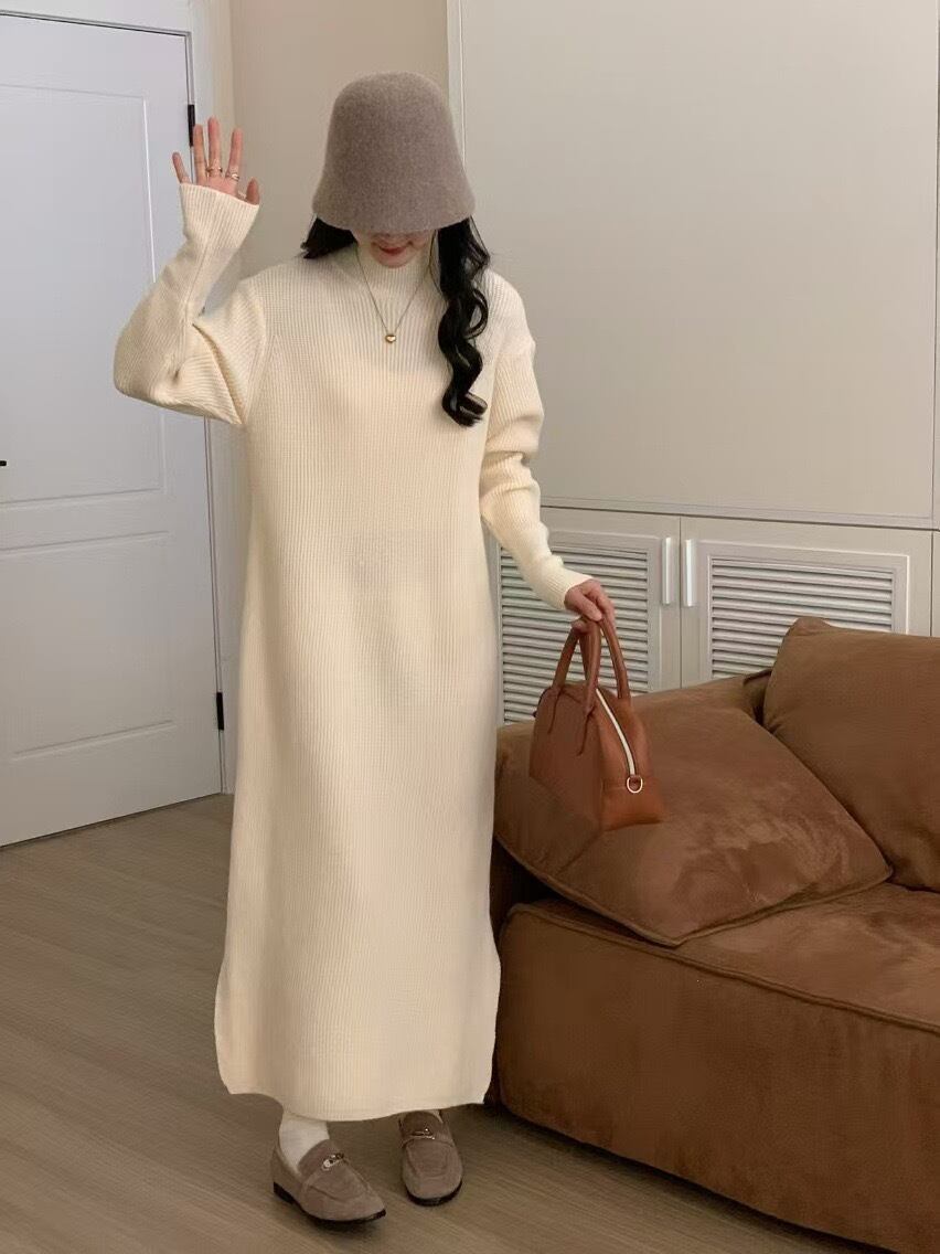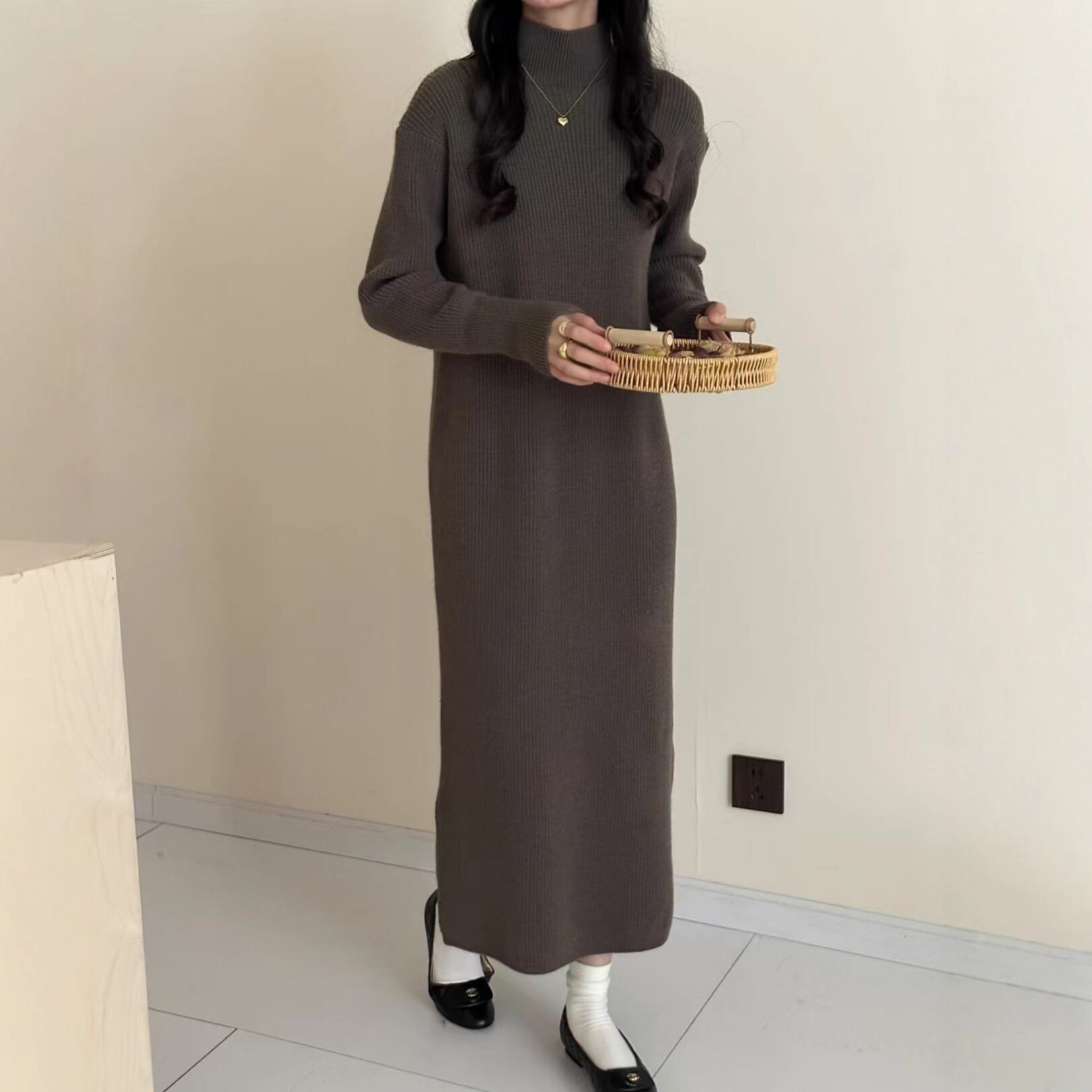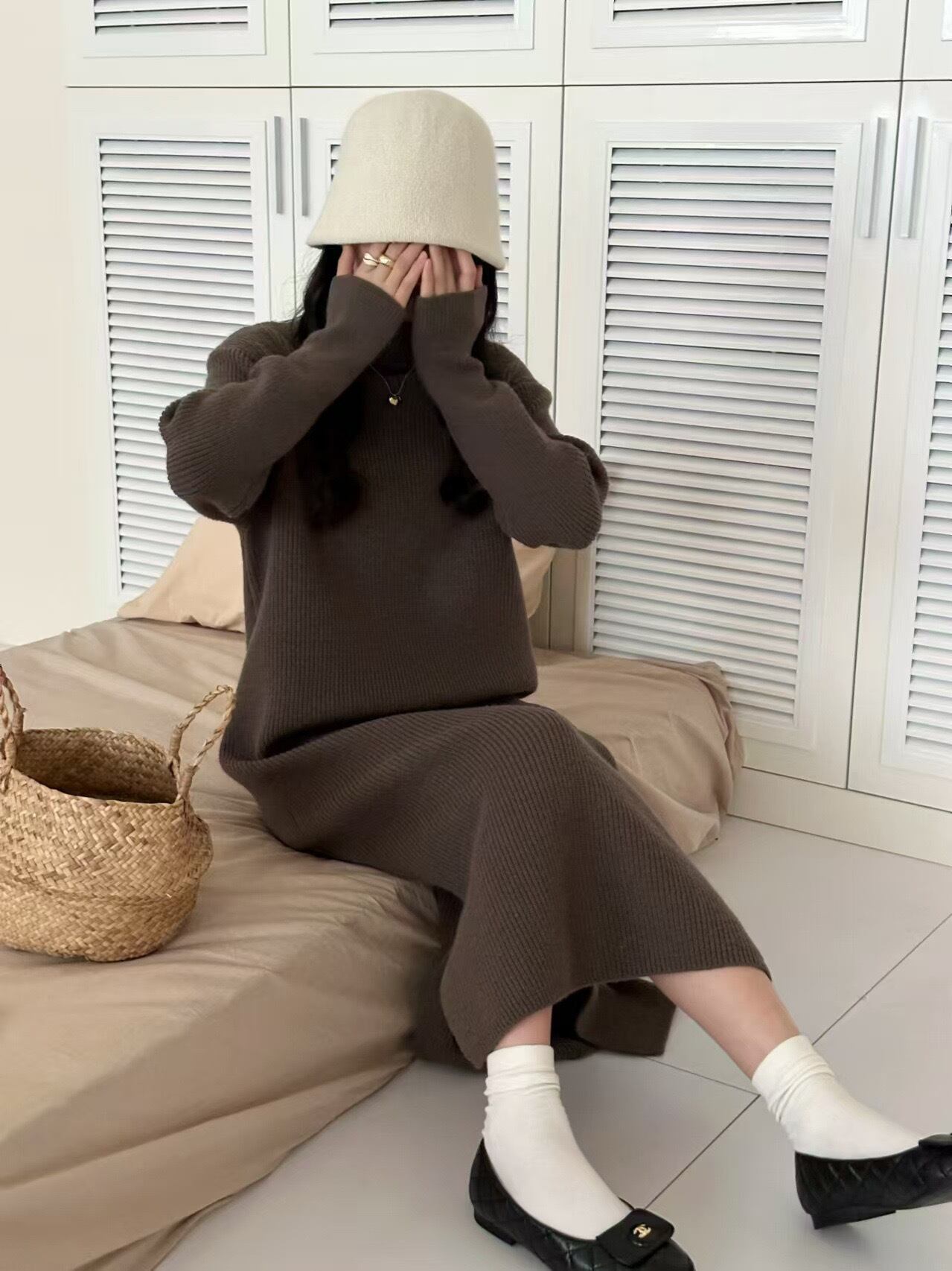 大人の可愛らしさを演出するハイネックのリブニットワンピース。
