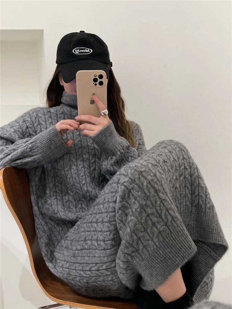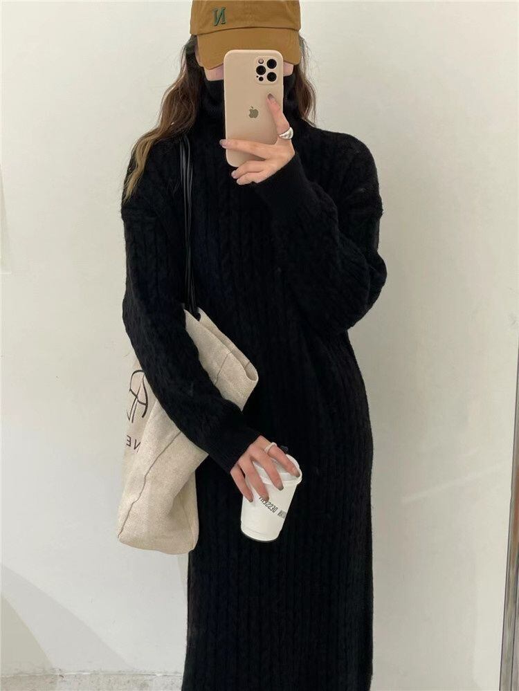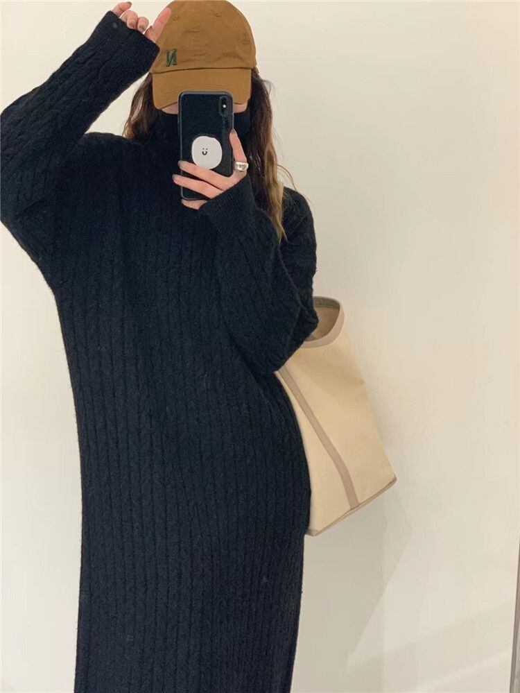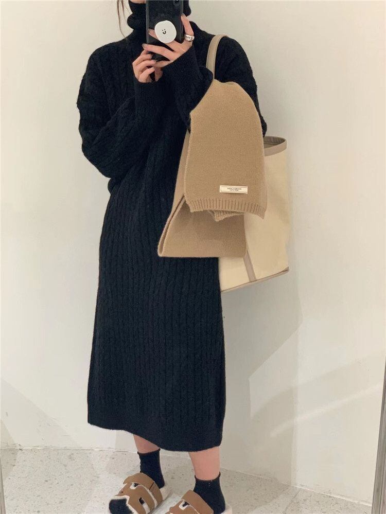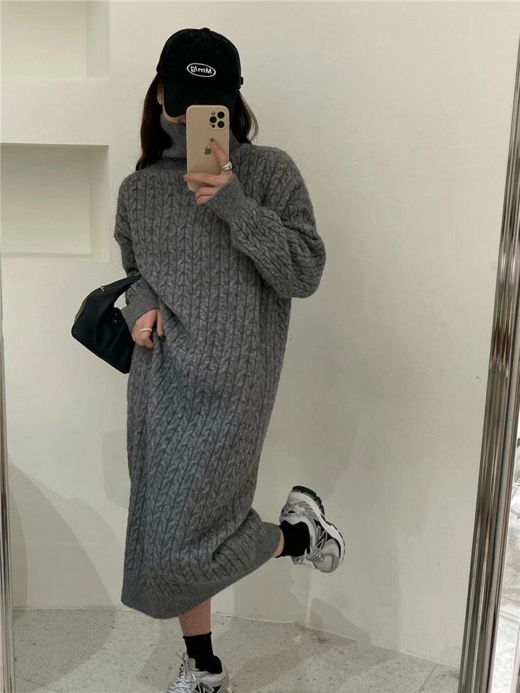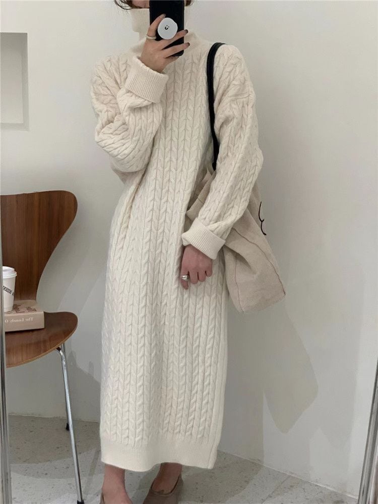 大人の可愛らしさを演出するケーブル編みのニットワンピース。
