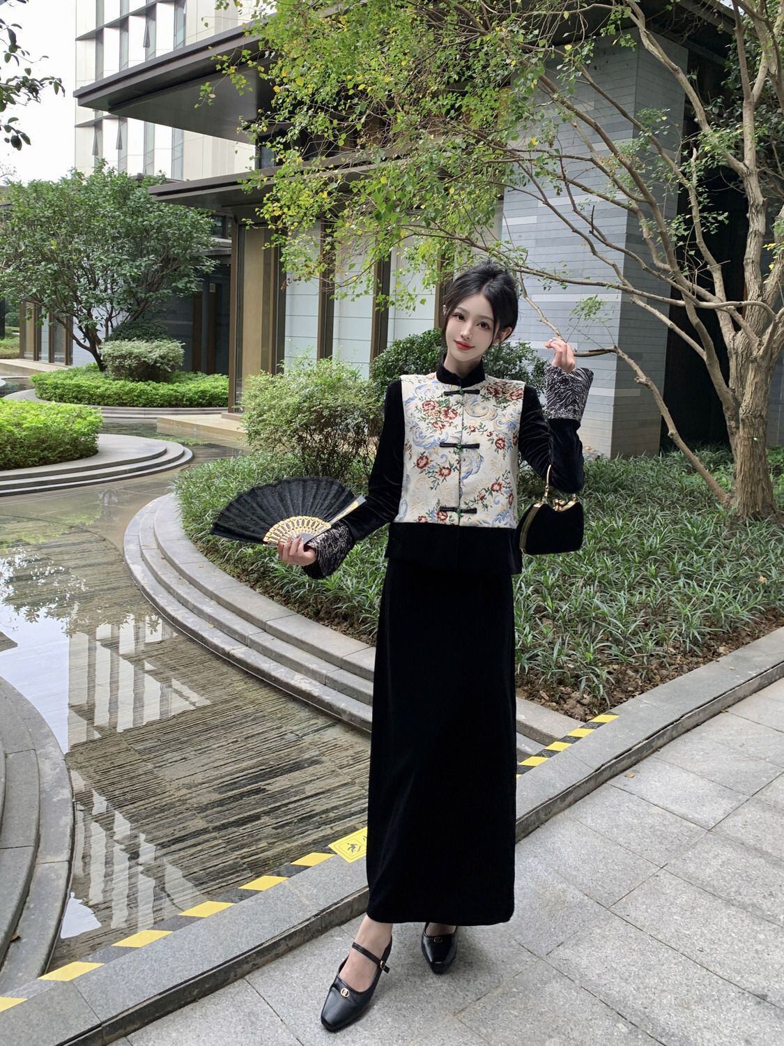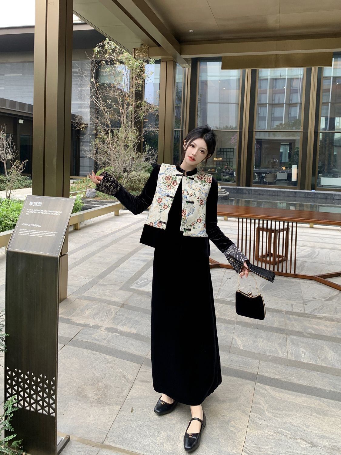 大人エレガントなチャイナ風デザインのベルベット素材パーティードレス。