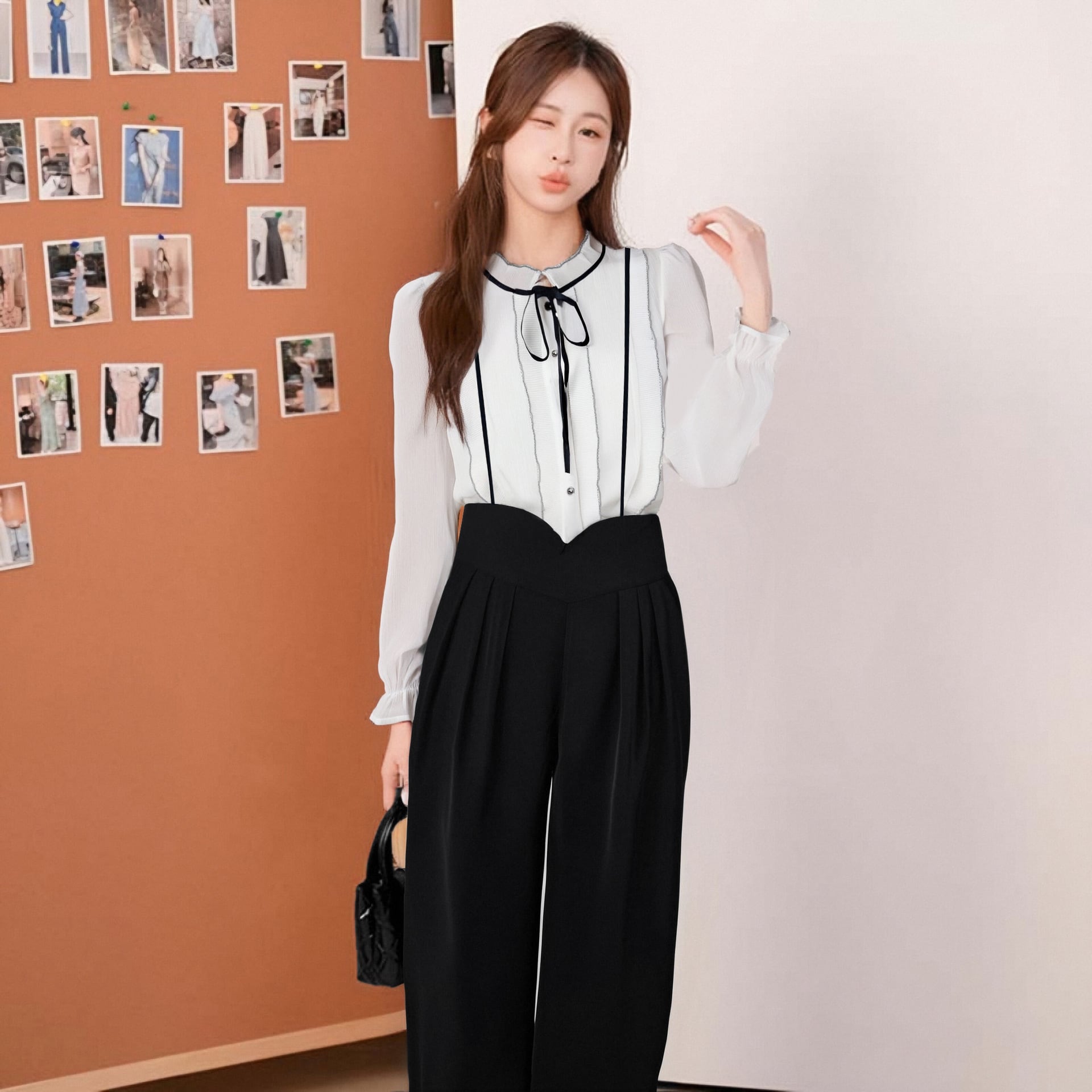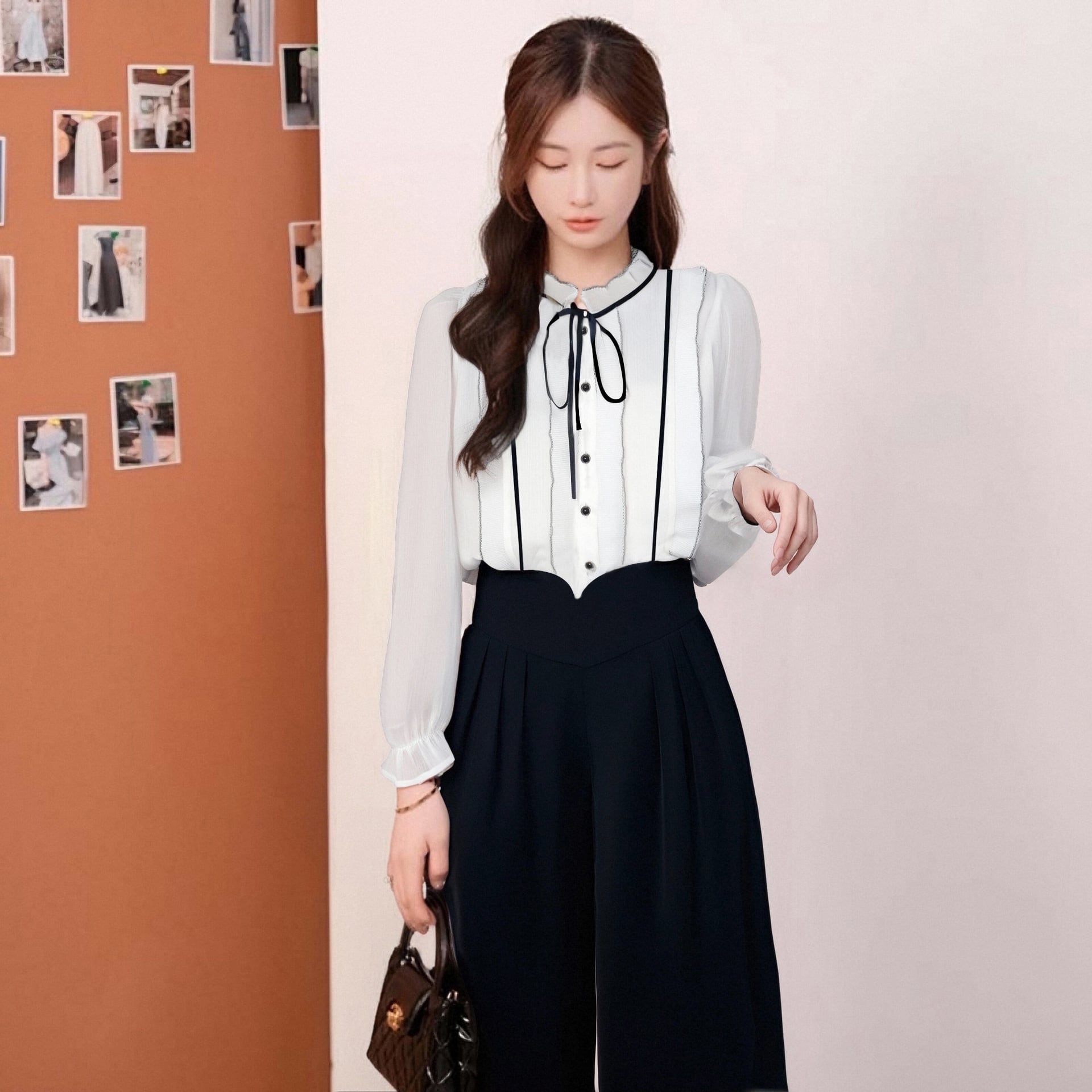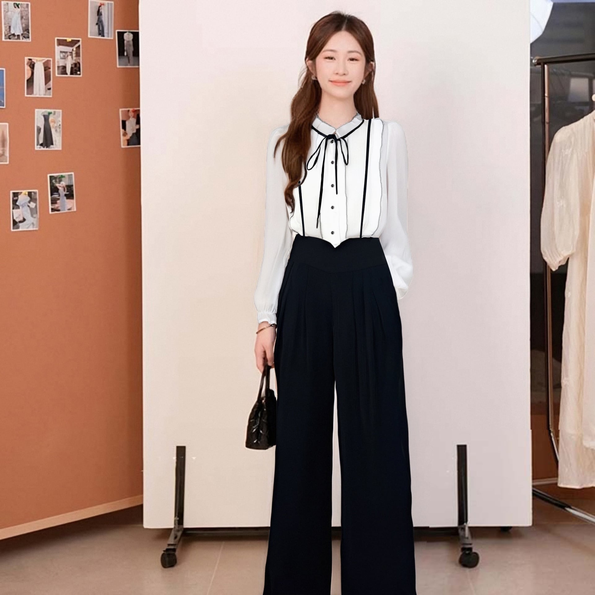 ボウタイやゆったりとしたトップスが女性らしくフェミニンさをプラス。