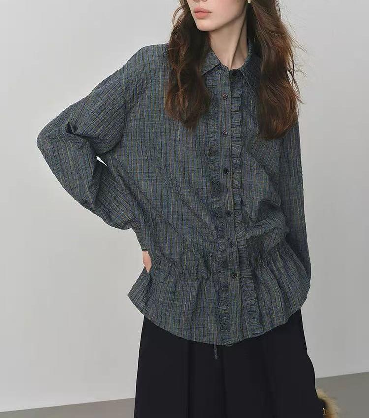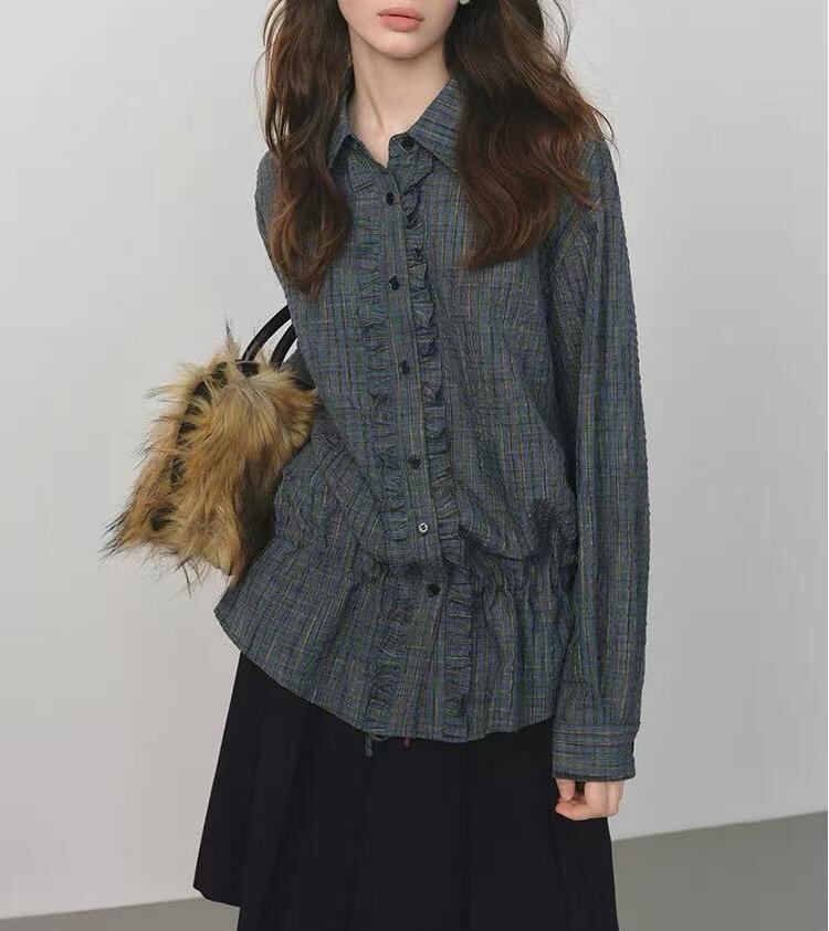 フロントのフリル使いが大人可愛いチェック柄ブラウス。