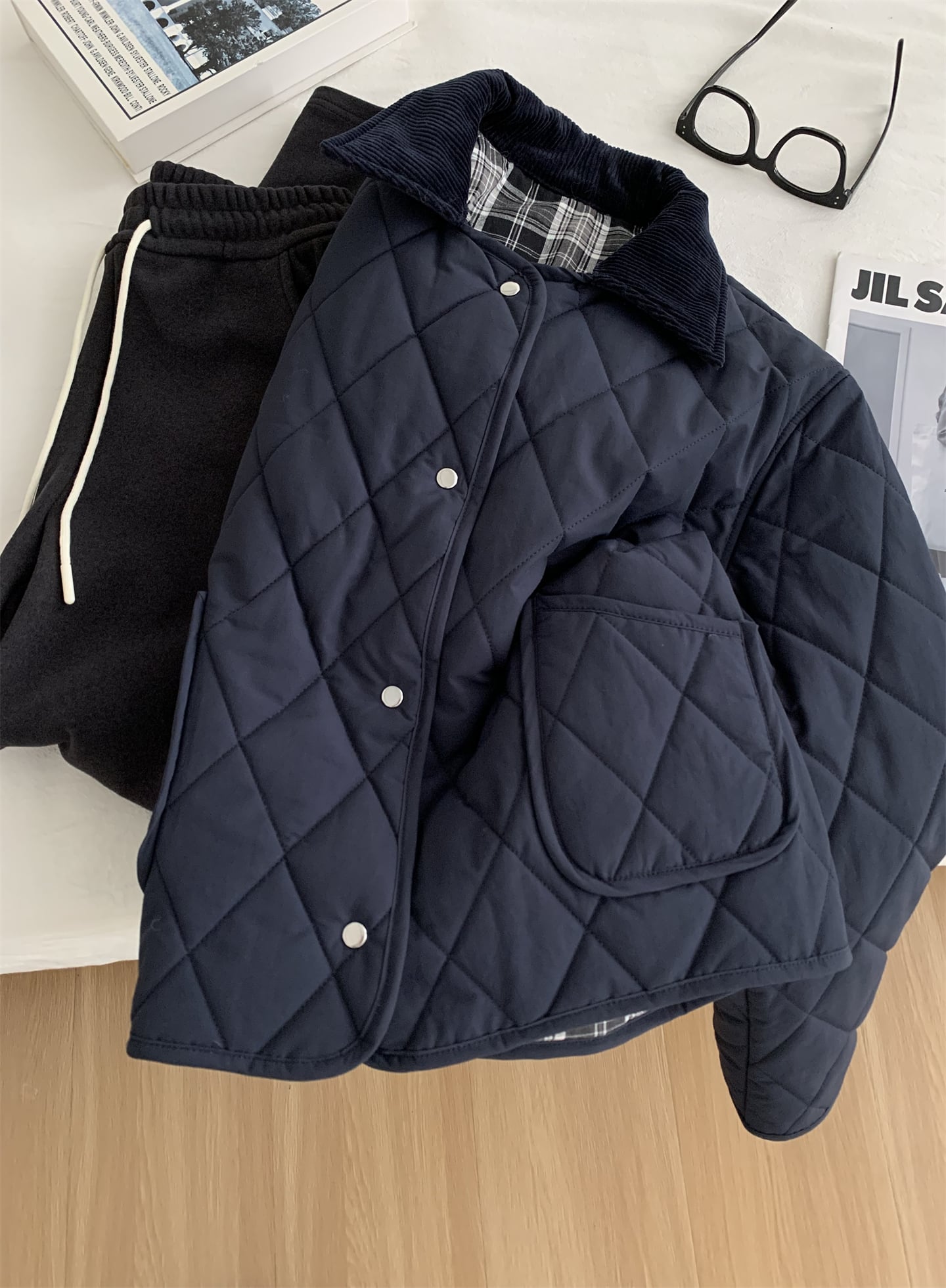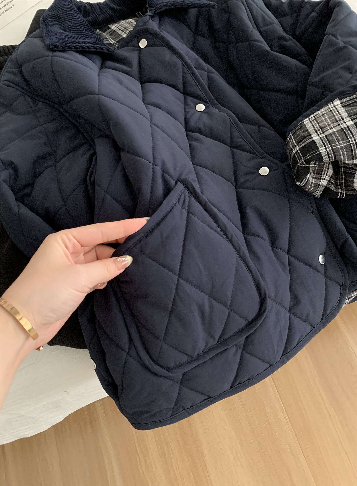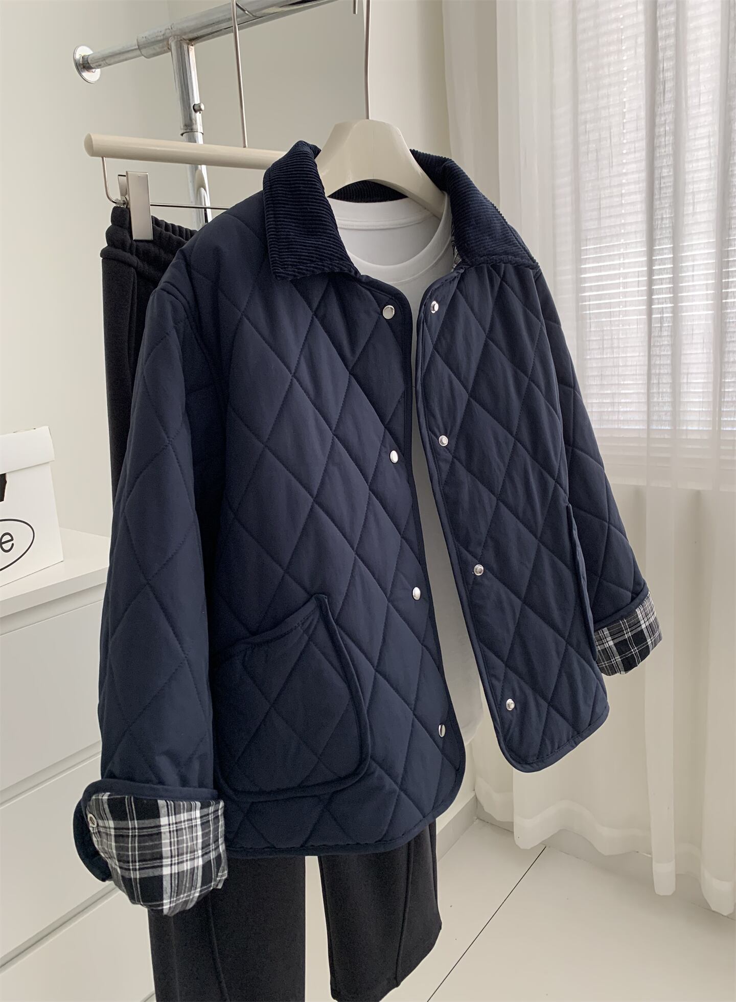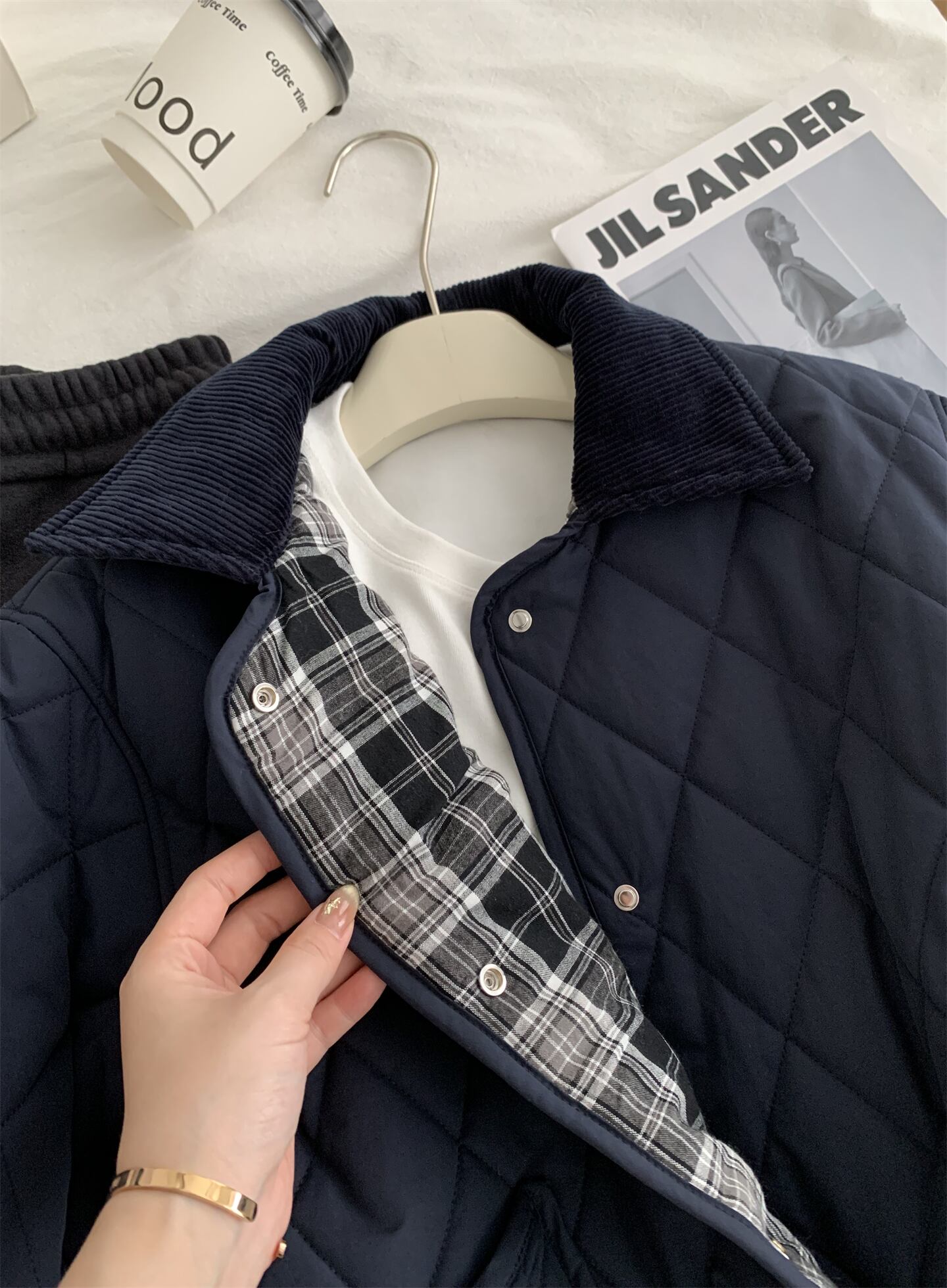 コーデュロイ素材の襟がポイントになり可愛らしい。