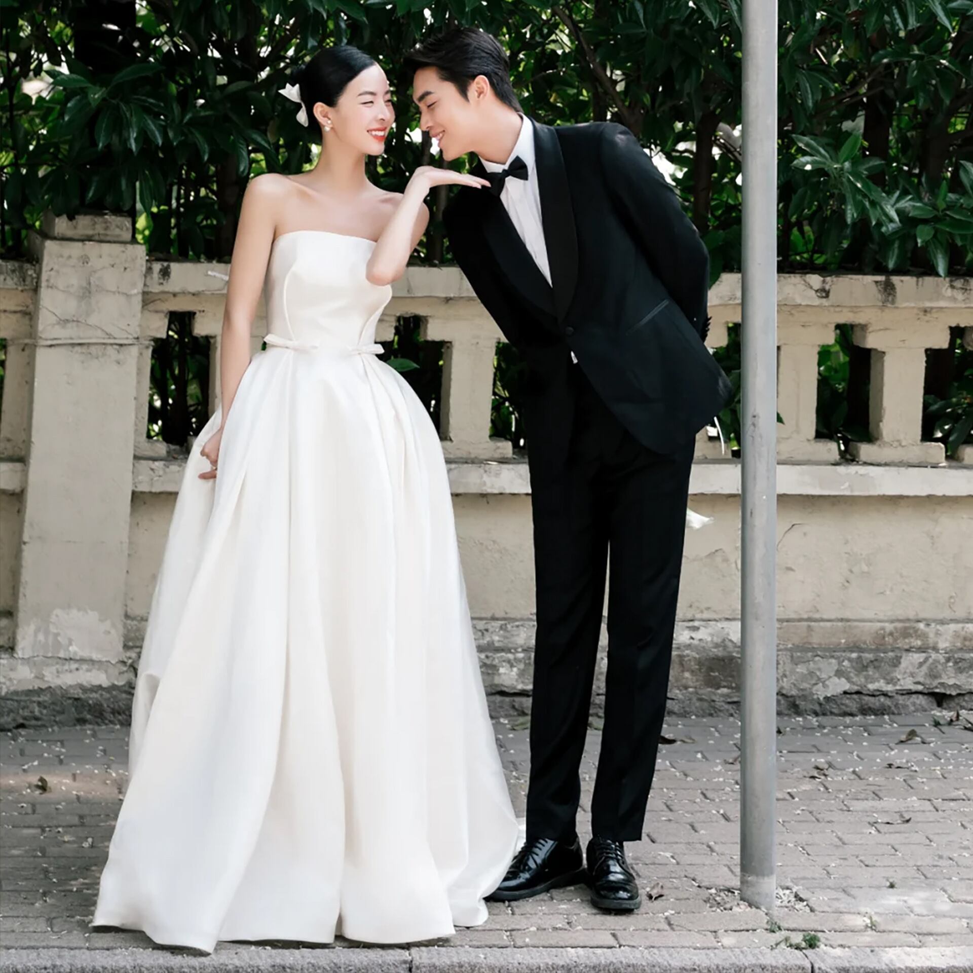 ベアトップでデコルテラインを華奢に美しく魅せる。