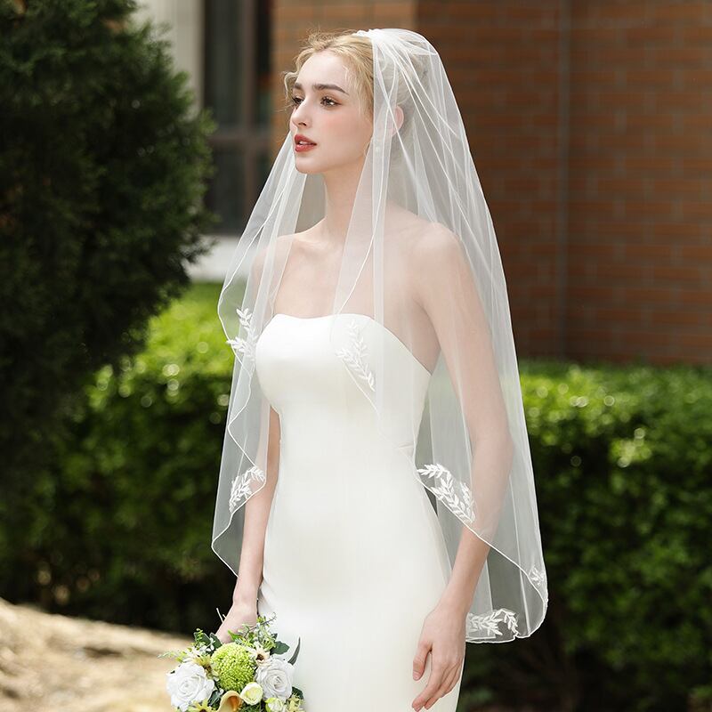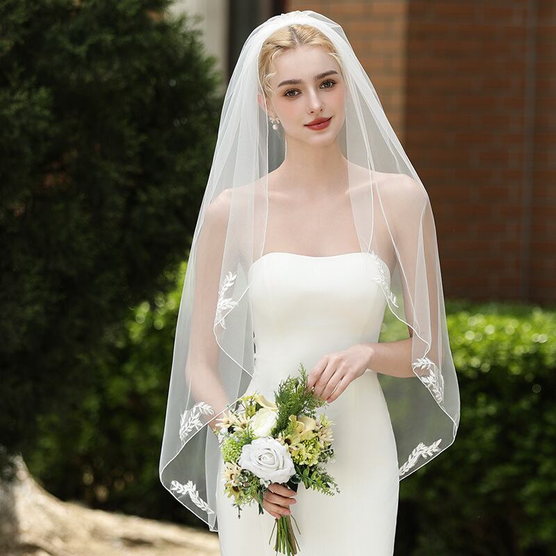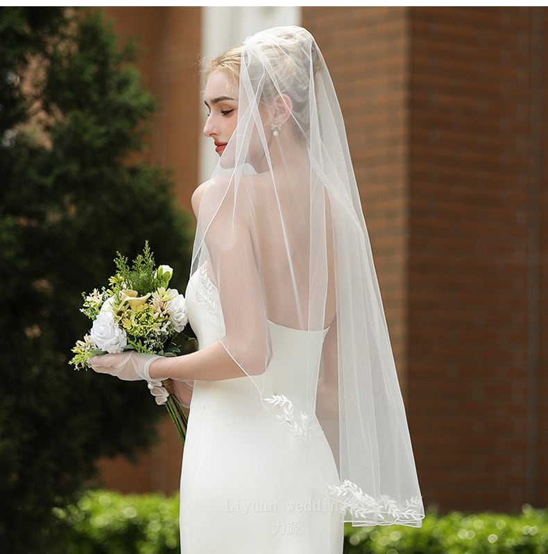 シンプルなレース仕立てのミドル丈ウェディングベール。