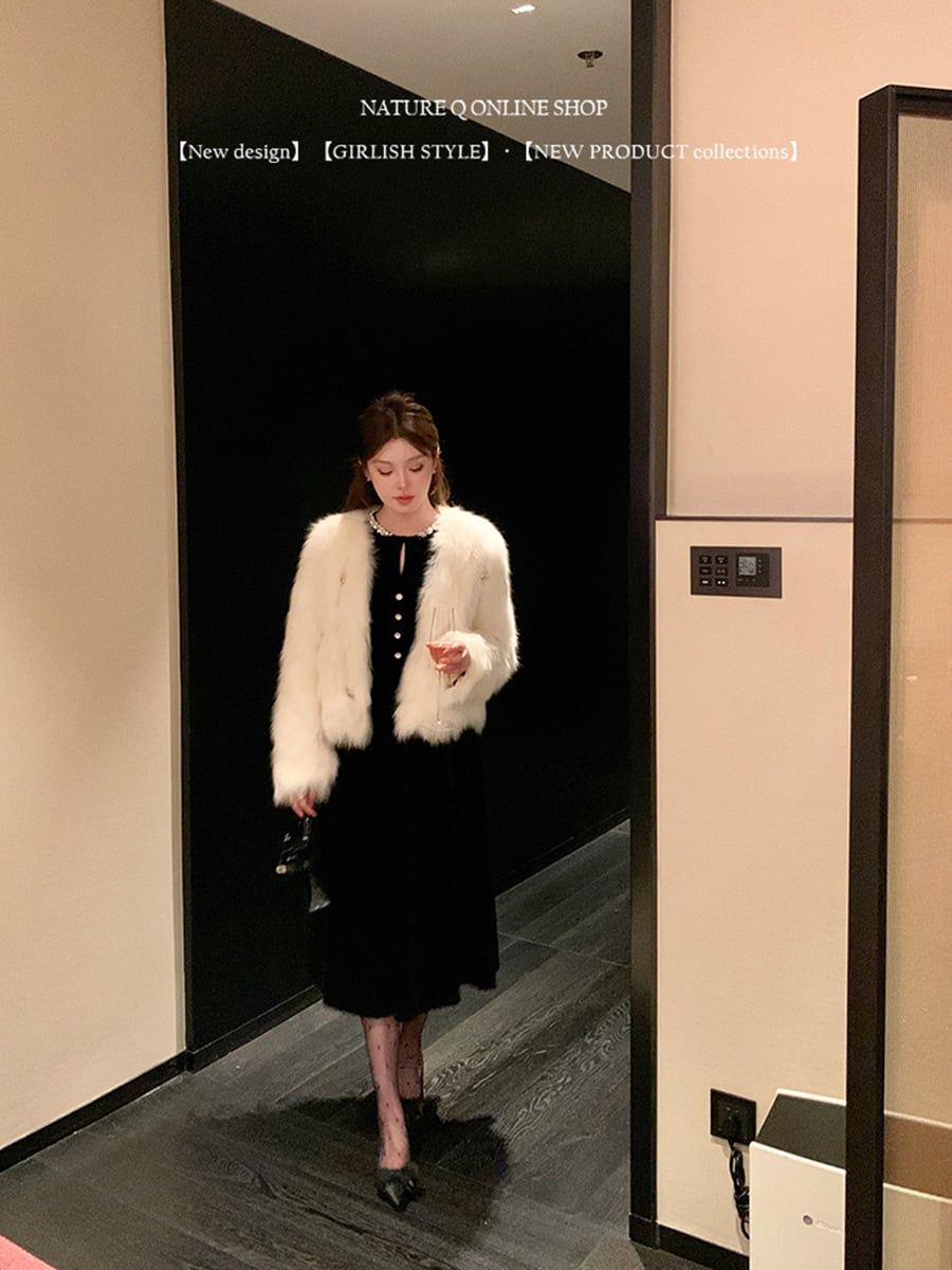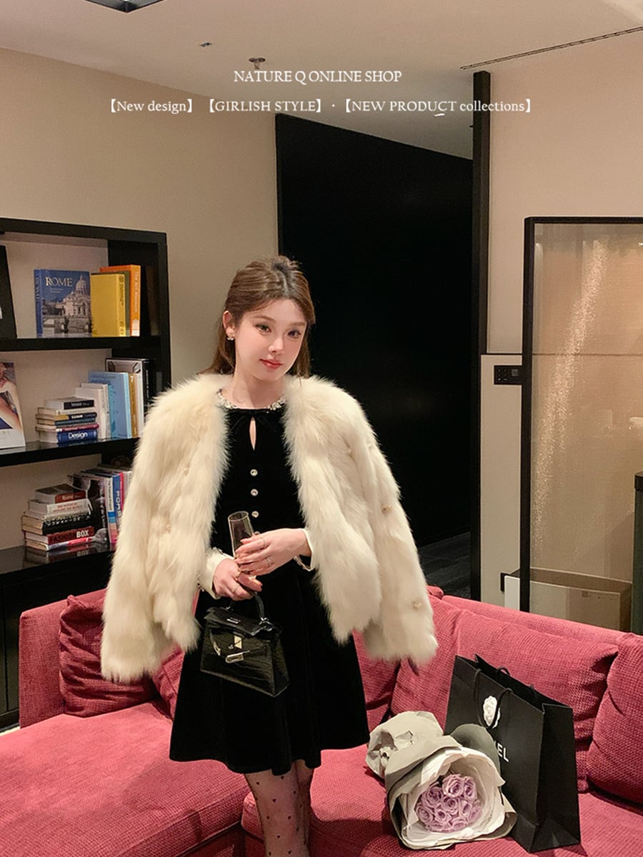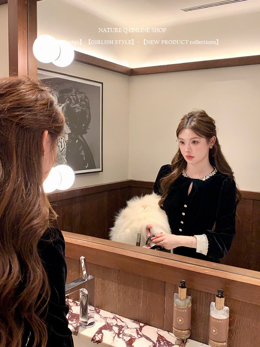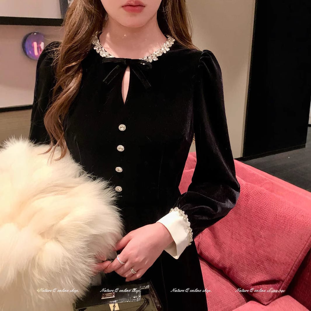 胸元のビジューとカットアウトデザインがフェミニンな印象に。